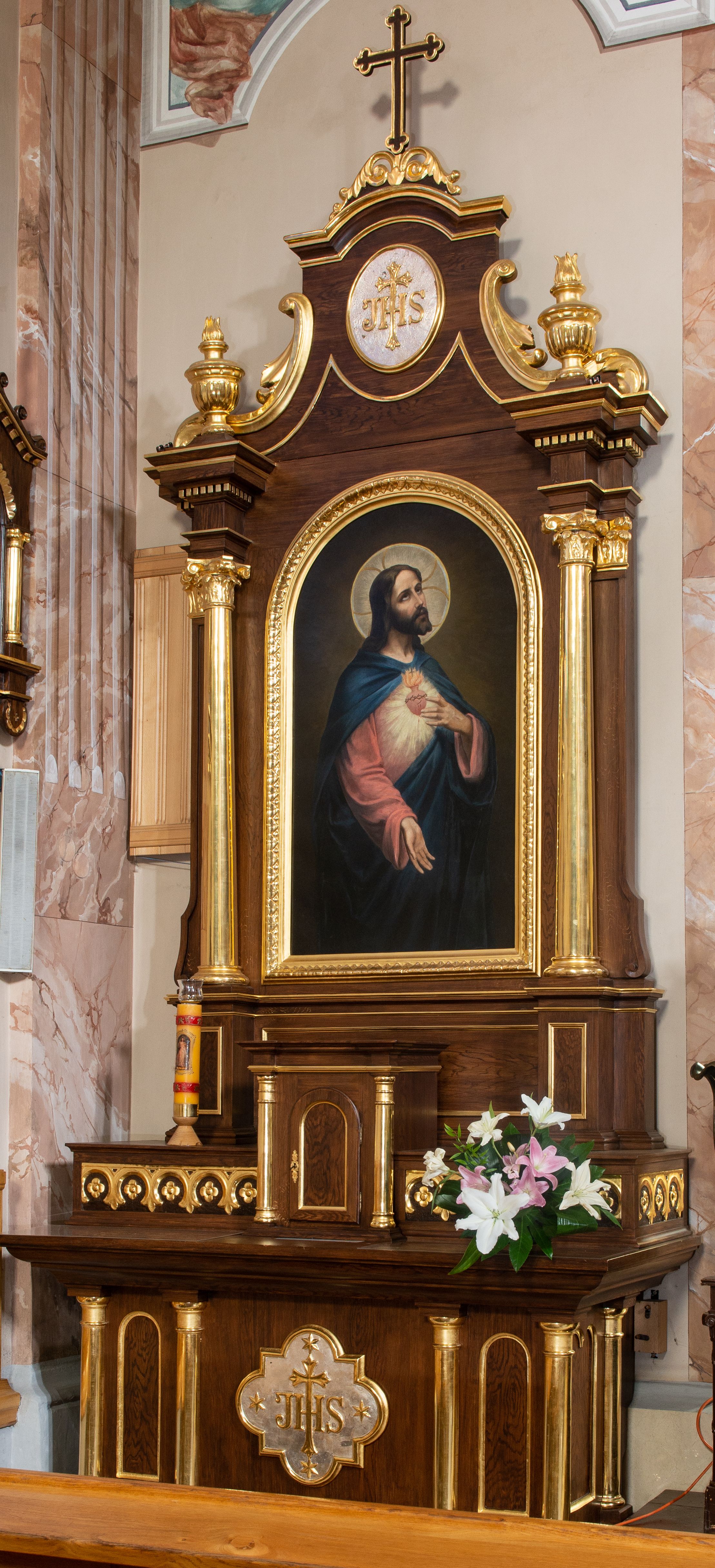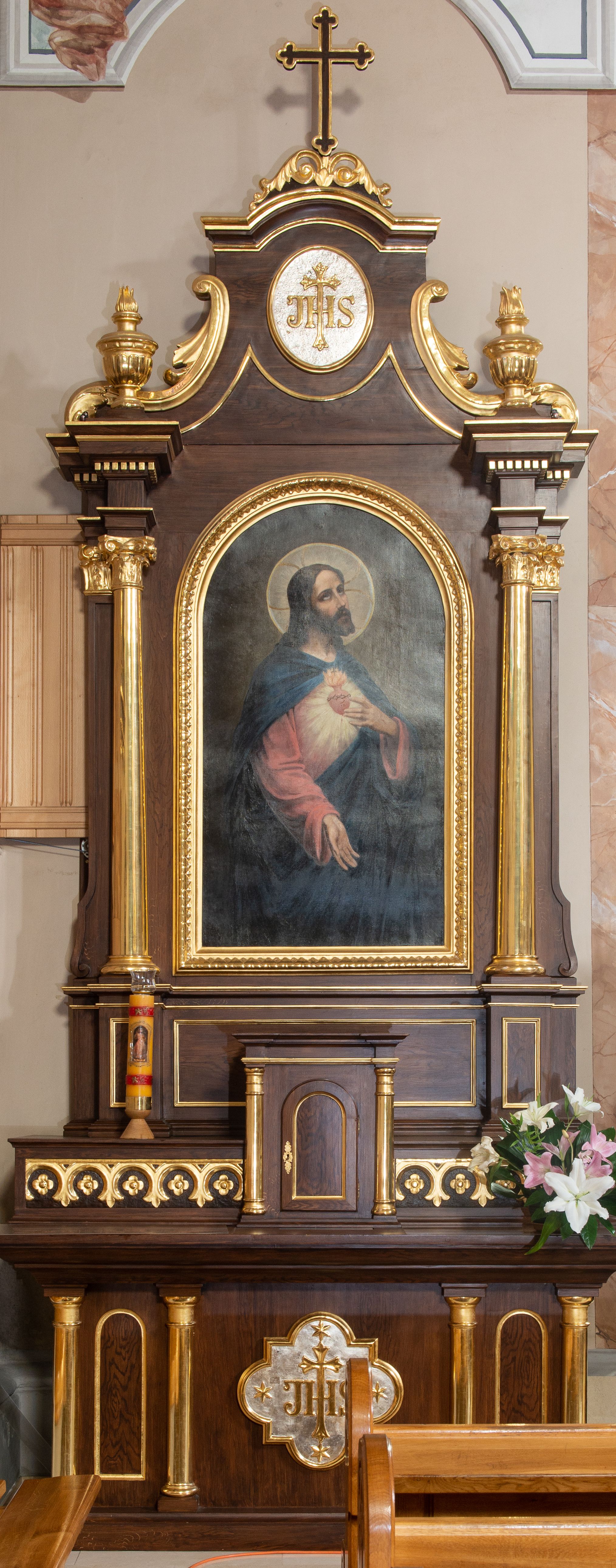 The altar in question is contemporary to the church where it is located and it was created in the first decade of the 20th century (most probably before 1908). Unfortunately, both the author of the project and the builder of the altar are unknown. The main reredos represents an eclectic style, while side altars – Neo-Baroque one.