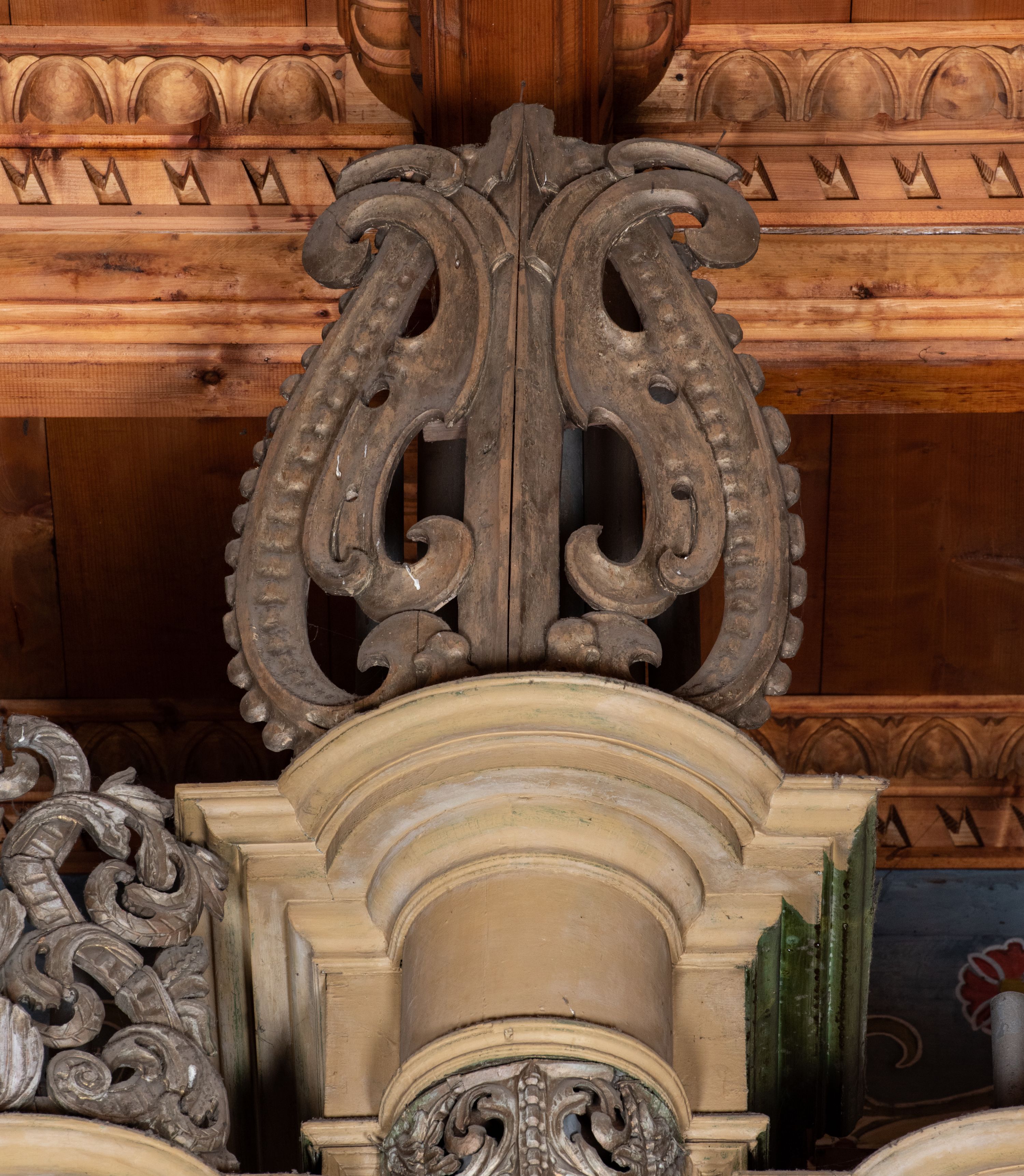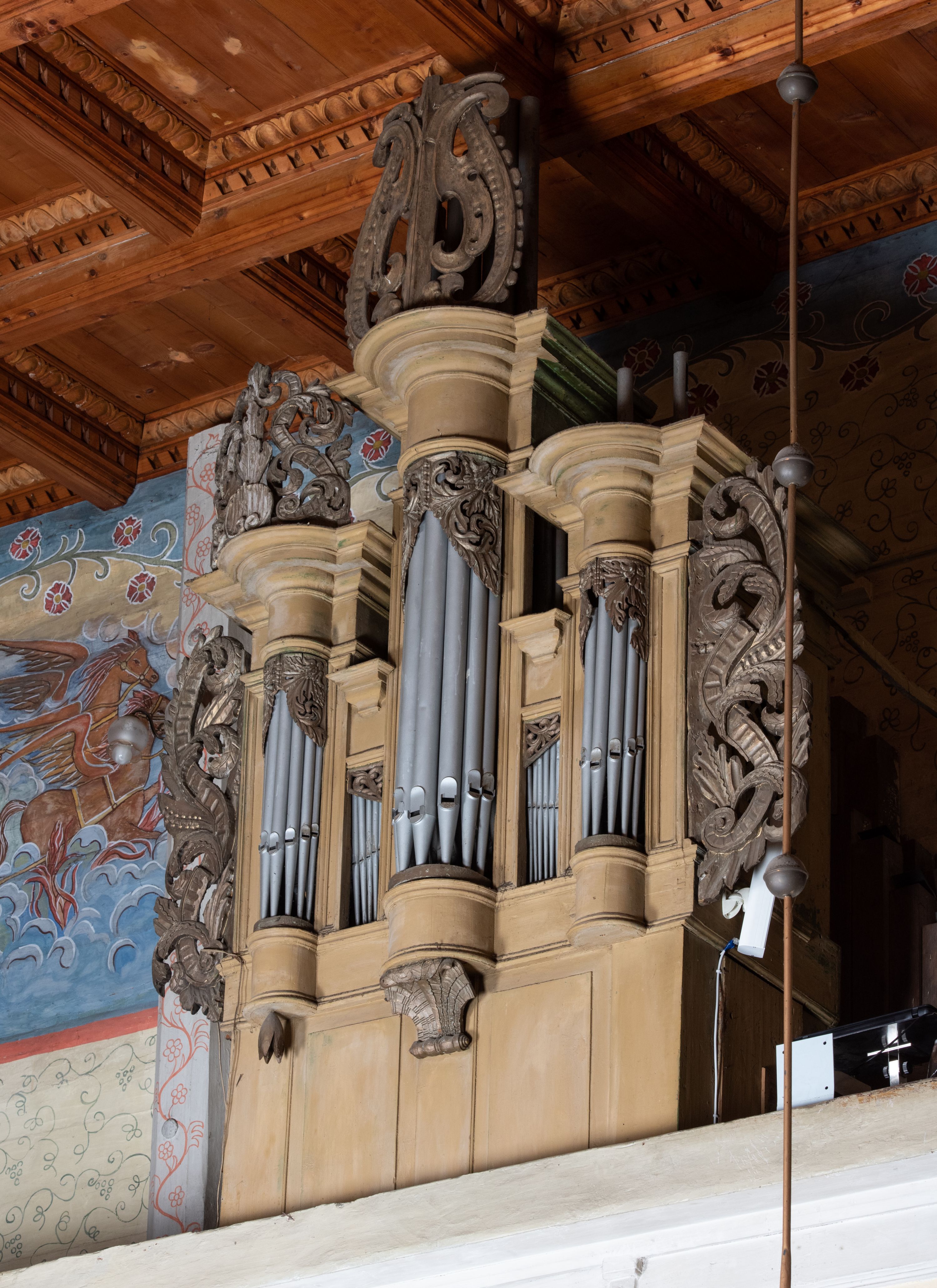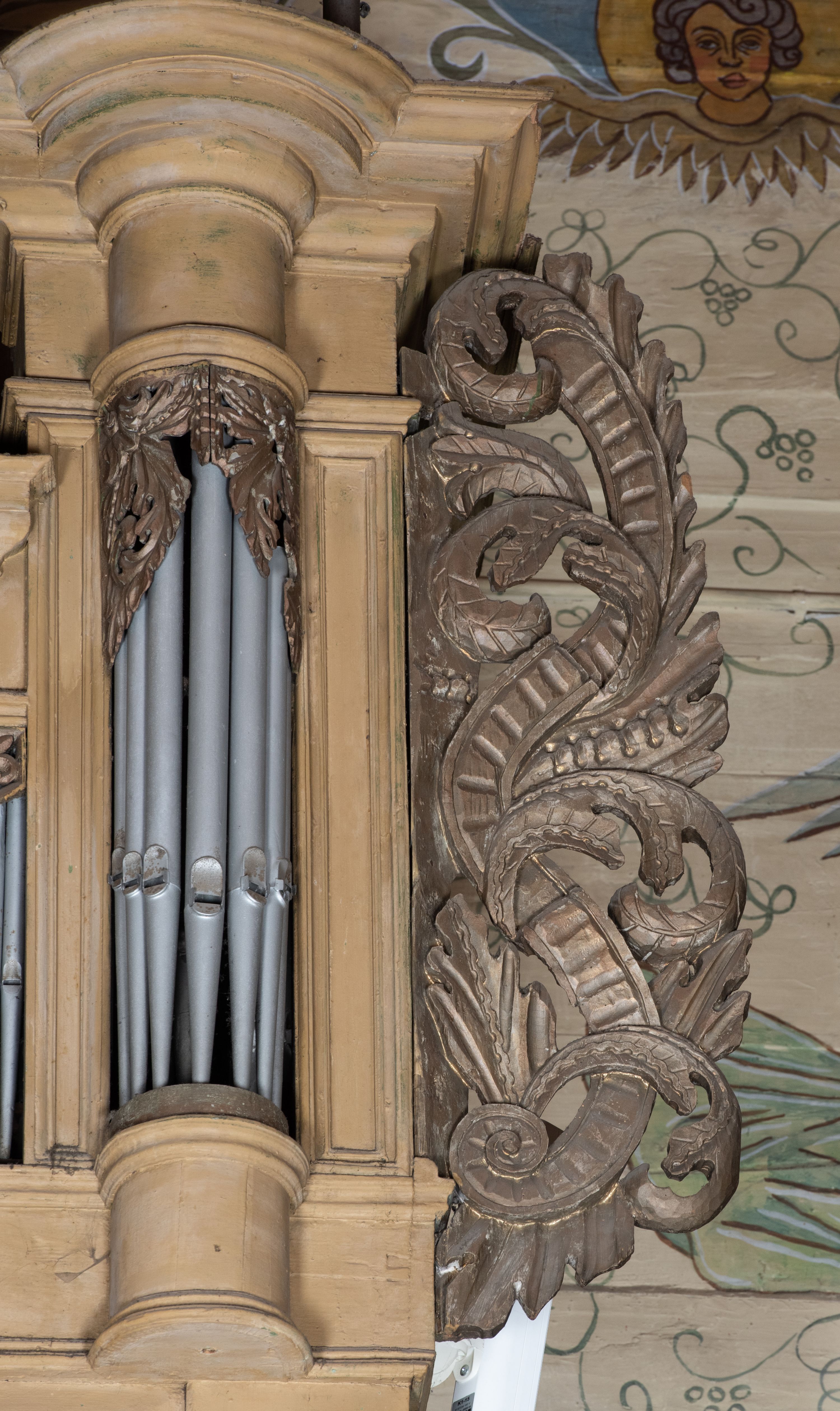 Late baroque organ front from the first quarter of the 18th century with a fragment of auricular style decoration from the third quarter of the 17th century (church built in 1670). It belongs to the architectural type based on the three-tower scheme, appearing from the 16th century and lasting until the 19th century.