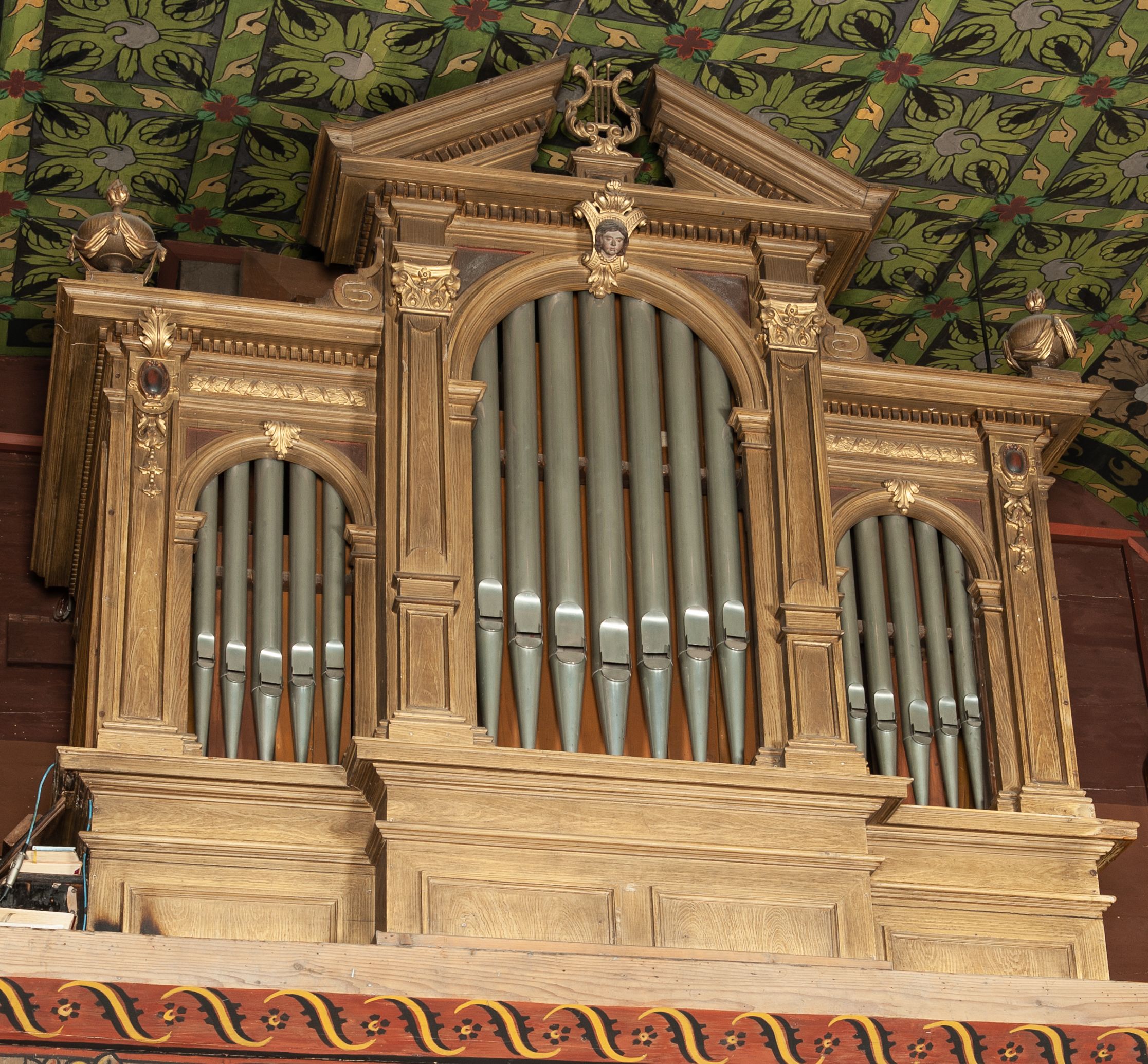 The organs were made in the 19th century and fall within the classical art trend. The architectural, three-axis prospectus constitutes a decorative curtain for an electric instrument.