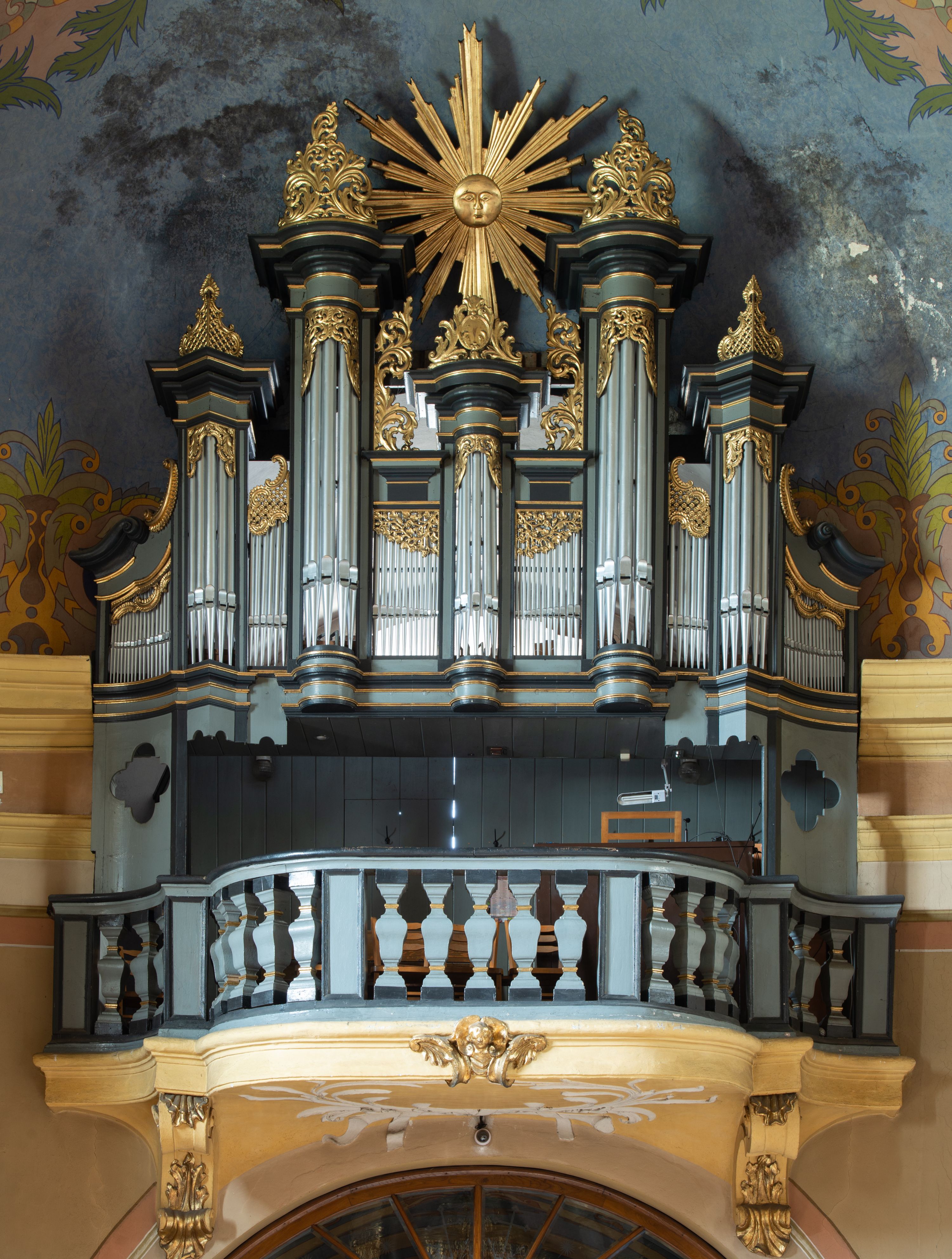 The form of the organ front, with its broken entablature or a pair of volutes and ornamental decoration in the form of a regency grating, is a reference to the forms which developed at the end of the 18th century, when the dynamized vividness of the Baroque was gradually replaced with the harmonized influence of Regency.