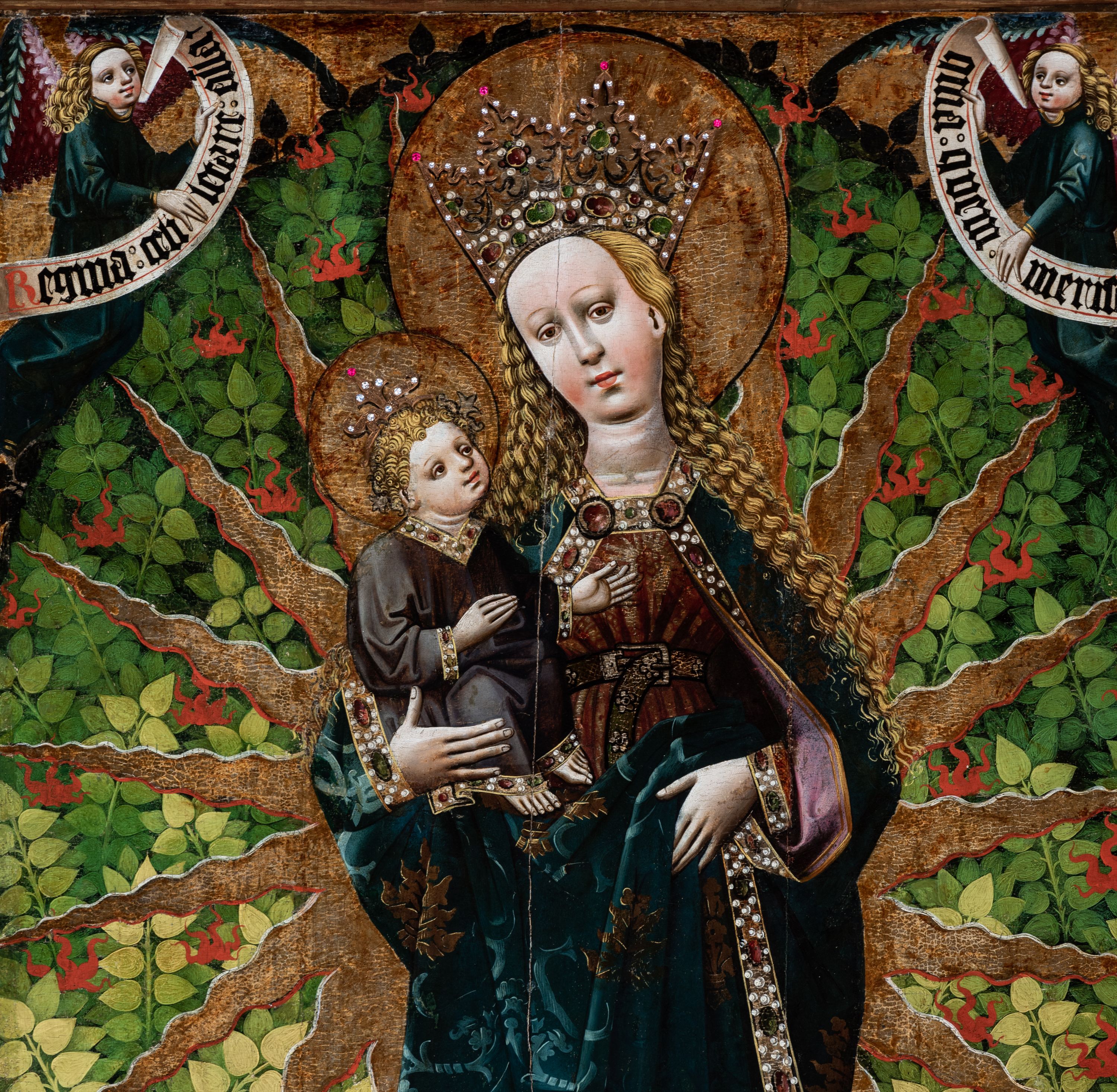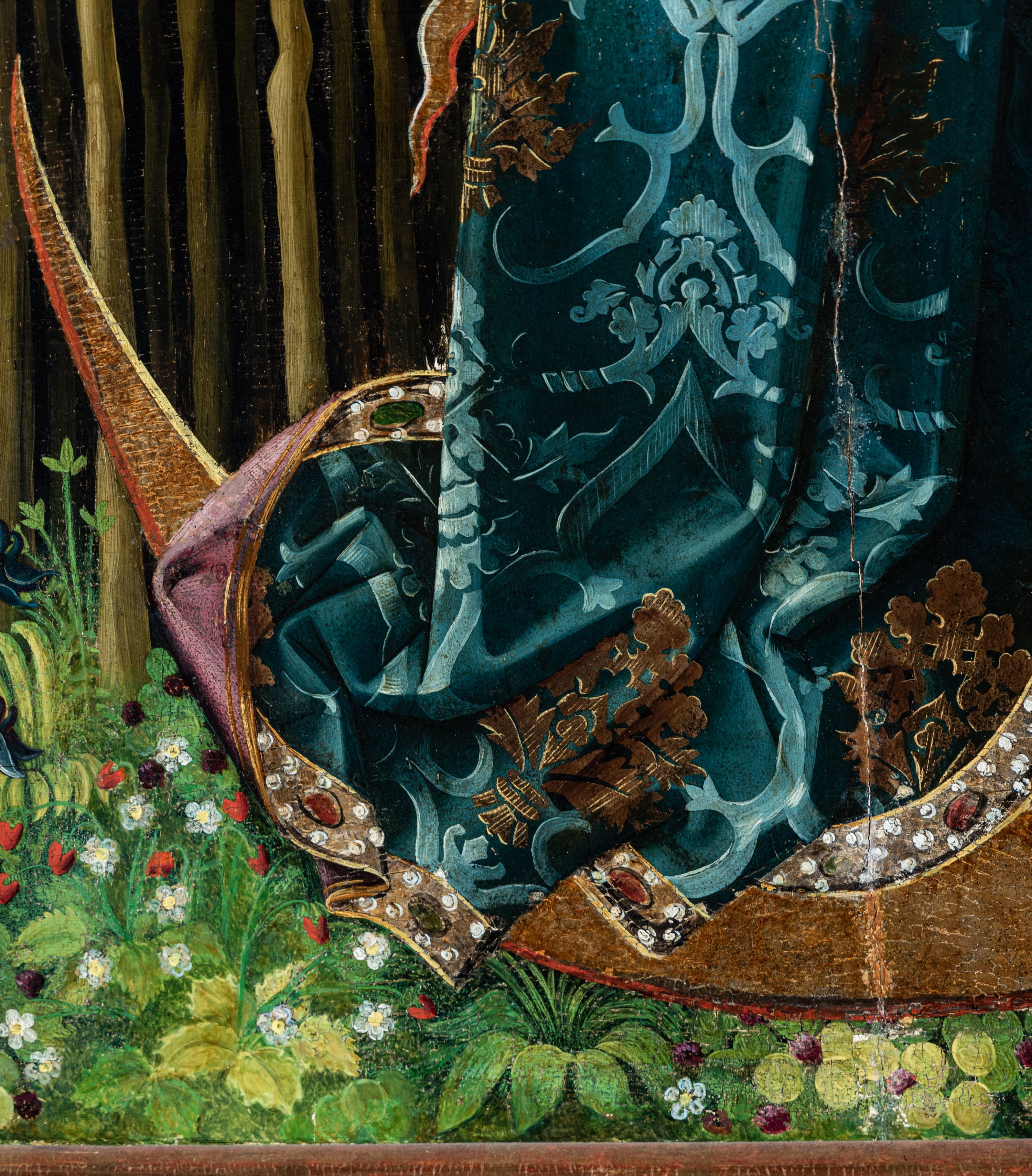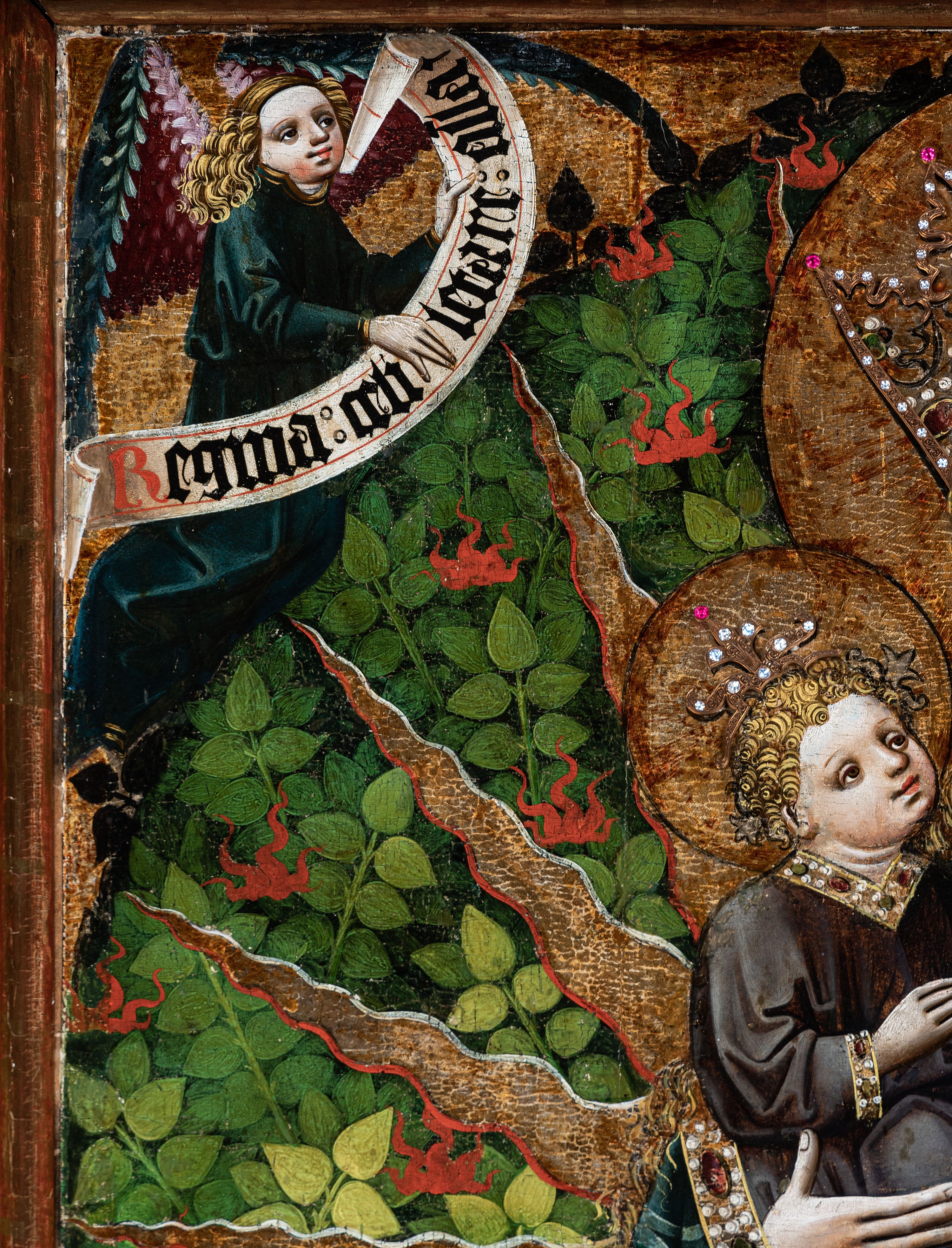 The painting of Our Lady of the Immaculate Conception was created in the years 1460-1470 in the workshop of an unknown master operating in Cracow, who is also credited with an authorship of a triptych from the parish church in Zator. Originally, the painting was part of a gothic triptych, which also included paintings, depicted on the sides of the high altar, with representations of Saint Catherine and Saint Barbara (on the obverses) and Gabriel the Archangel and the Mother of God (on the reverses), forming together the Annunciation group. The triptych had been probably intended for the church in Paczółtowice from the beginning, but it did not serve as the high altar. The identity of the funder of the altar is not confirmed by sources, however, researchers point to Jan Paczółtowski of the Topór coat of arms, recorded by Jan Długosz in the years 1470-1480. After the construction of the present temple in Paczółtowice at the beginning of the 16th century, the triptych was transferred there. It was probably dismantled at the beginning of the 17th century, during the construction of a new high altar from the foundation of Stanisław Tarnowski, the coat of arms of Rola, and his wife – Elżbieta née Czerska. The triptych of Our Lady of the Immaculate Conception was probably typical of the 15th century – devoid of predella and altar finial, with a reredos with the central image of Our Lady of the Immaculate Conception and a pair of moving wings, depicting the holy martyrs: Catherine of Alexandria and Barbara (on the obverses) as well as Gabriel the Archangel (on the reverses), forming together the Annunciation group. On weekdays it remained closed, showing the faithful a visible scene of the Annunciation to Mary. The solemn side with a representation of the Virgin Mary with the Child, assisted by holy virgins, appeared to the faithful on Sundays and during church holidays. The Annunciation on the reverses of the wings of the triptych in Paczółtowice adopts iconographic formula typical of the panel painting of Lesser Poland, i.e. with kneeling Gabriel the Archangel (depicted on the left wing) and Mary (depicted on the right wing) dressed in white robes, referring to her virginity, who at the sight of an angel interrupts reading the book, holding in her hand. It is a popular theme in the panel painting of Lesser Poland. It was repeated on numerous reredoses in the years 1420-1480, always on the reverse side of wings (including reredoses in Łopuszna, Przydonica, Racławice Olkuskie and Sromowce Wyżne). The depiction of the Virgin Mary and the Child, visible during the ceremonial opening of the triptych, is a cult representation. Mary depicted in the painting in Paczółtowice received the attributes proper to the representation of the Woman of the Apocalypse, taken from the text of Saint John's Book of Revelation: a radiant aureole surrounding the figure and a crescent moon underfoot. The depiction of Mary surrounded by a flaming aureole, already in the Middle Ages, began to be associated with the immaculate conception of Mary, although this idea gained the power of dogma only in 1854. The burning bush, but not consumed by flames, visible behind Mary, symbolises in this case her chastity and virgin motherhood. The ideological content of the painting is complemented by the depictions of angels holding banderoles with the text of the Marian antiphons popular in the 15th century: "Rejoice, Queen of Heaven" visible in the upper corners, as well as Mary's rich robes indicating her royal role. Saint Catherine of Alexandria and Barbara depicted on the obverses of the triptych wings accompanied Mary on the solemn side of the open altar, forming with her a group called the Sacred conversation (Sacra conversazione). Both holy virgins, who died a martyr's death in the first centuries of Christianity and were depicted on the wings of the triptych in Paczółtowice, were exceptionally worshipped in medieval Lesser Poland. Their presence in the company of Our Lady of the Immaculate Conception can also be interpreted as a reference to Mary's chastity. In terms of style, this triptych is considered by researchers to be the "late phase of Cracovian painting during the so-called idealising period" in the third quarter of the 15th century. In 1682, under the will of Adam Negowicz, a silver robe, a crown, rays and the moon under Mary's feet were added to the painting. This robe was replaced in 1800 with the current silver-plated one, made of copper. It was made by Jerzy Kaltner of Cracow. The painting was renovated several times: in 1943 by the painter Józef Ryłka; in 1957, on the recommendation of the Provincial Conservator of Monuments in Cracow – side wings of the former triptych were maintained; in 1995 by prof. Małgorzata Schuster-Gawłowska of the Academy of Fine Arts in Cracow, who performed comprehensive renovation works.