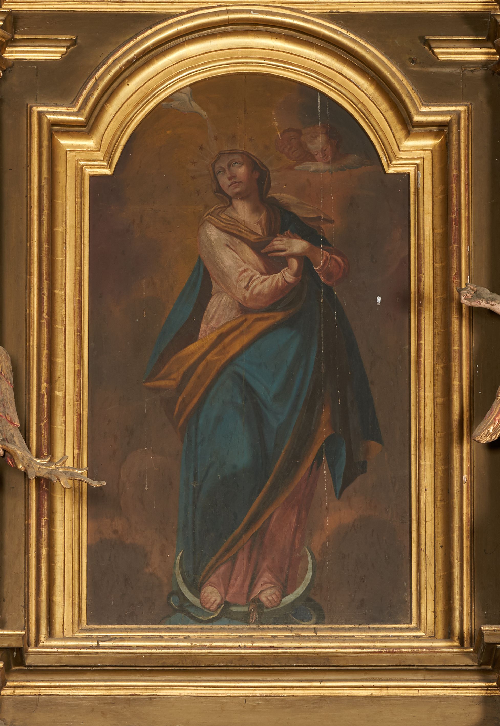 The painting of Our Lady of the Immaculate Conception was probably made by Piotr Kornecki in the 1850s. It depicts Our Lady of the Immaculate Conception in the type of an independent image of Mary, called "Absolute Immaculata," which was developed in the 17th century. Mary was depicted without any other biblical figures or symbols accompanying her, but as standing in glory, adored by angels, with the dove of the Holy Spirit floating over her head.