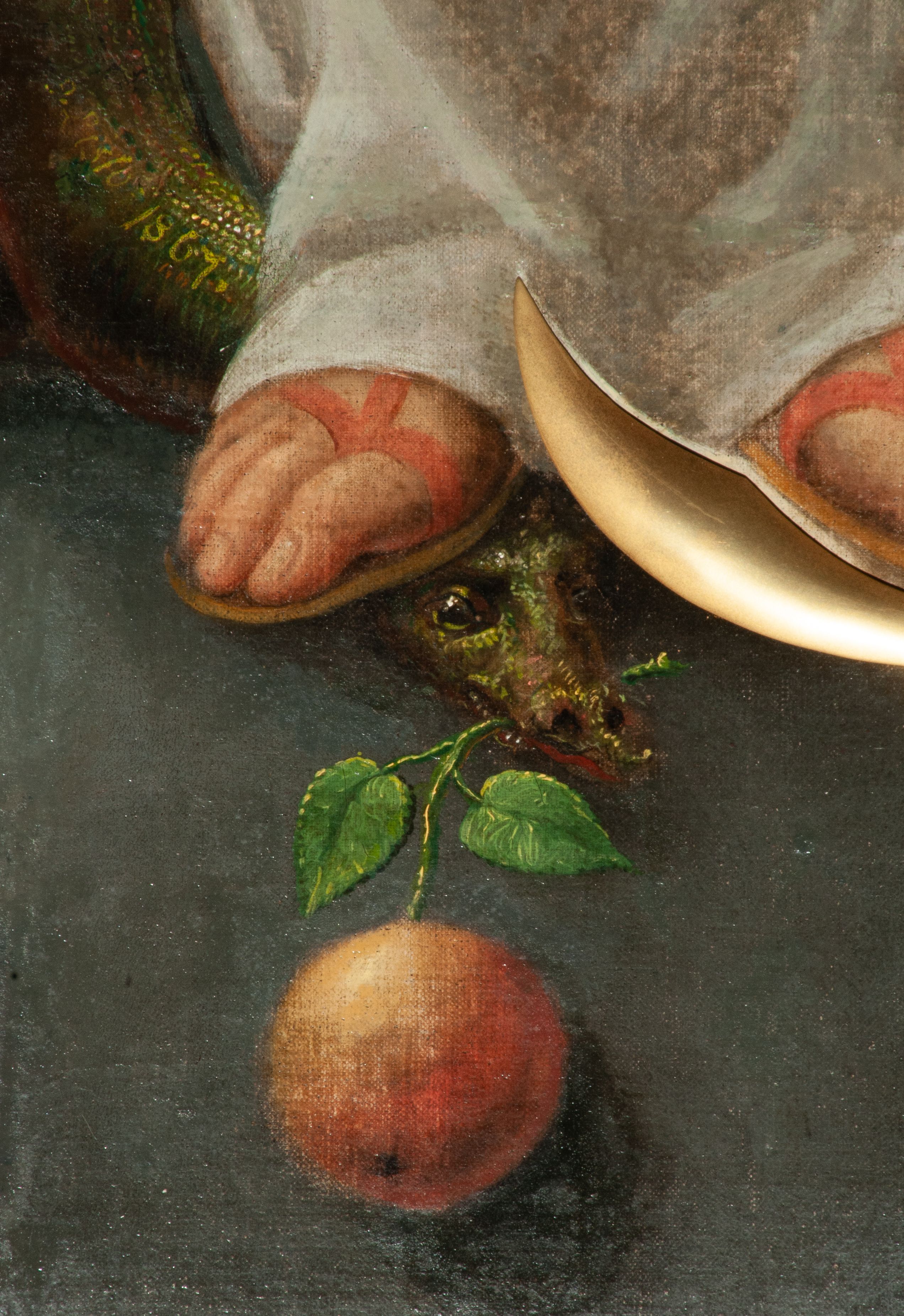 The painting "Our Lady of the Immaculate Conception" was painted in 1867 by Cracovian painter Teodor Baltazar Stachowicz (1800-1873). On the opposite side of the church nave, there is his second painting depicting Our Lady of the Immaculate Conception. The paintings were most probably ordered after the fire of the church in 1867, which partially consumed the previous painting decor of the side altars.