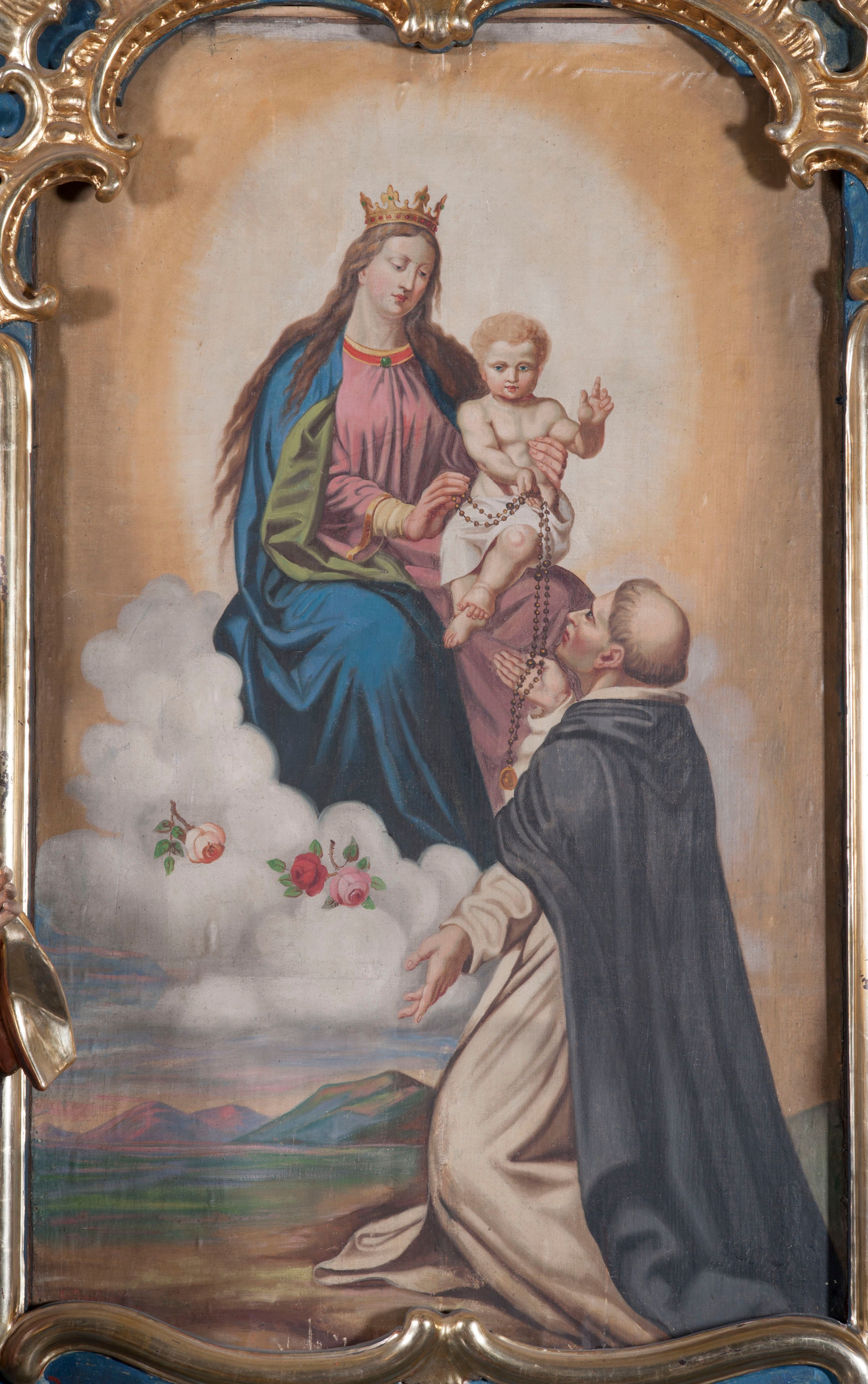 The painting "Our Lady of the Rosary and St. Dominic" was probably created in the second half of the 20th century. Saint Dominic is strongly associated with the cult of the Rosary. According to legend, the Virgin Mary gave him a rosary and encouraged him to recite its mysteries.