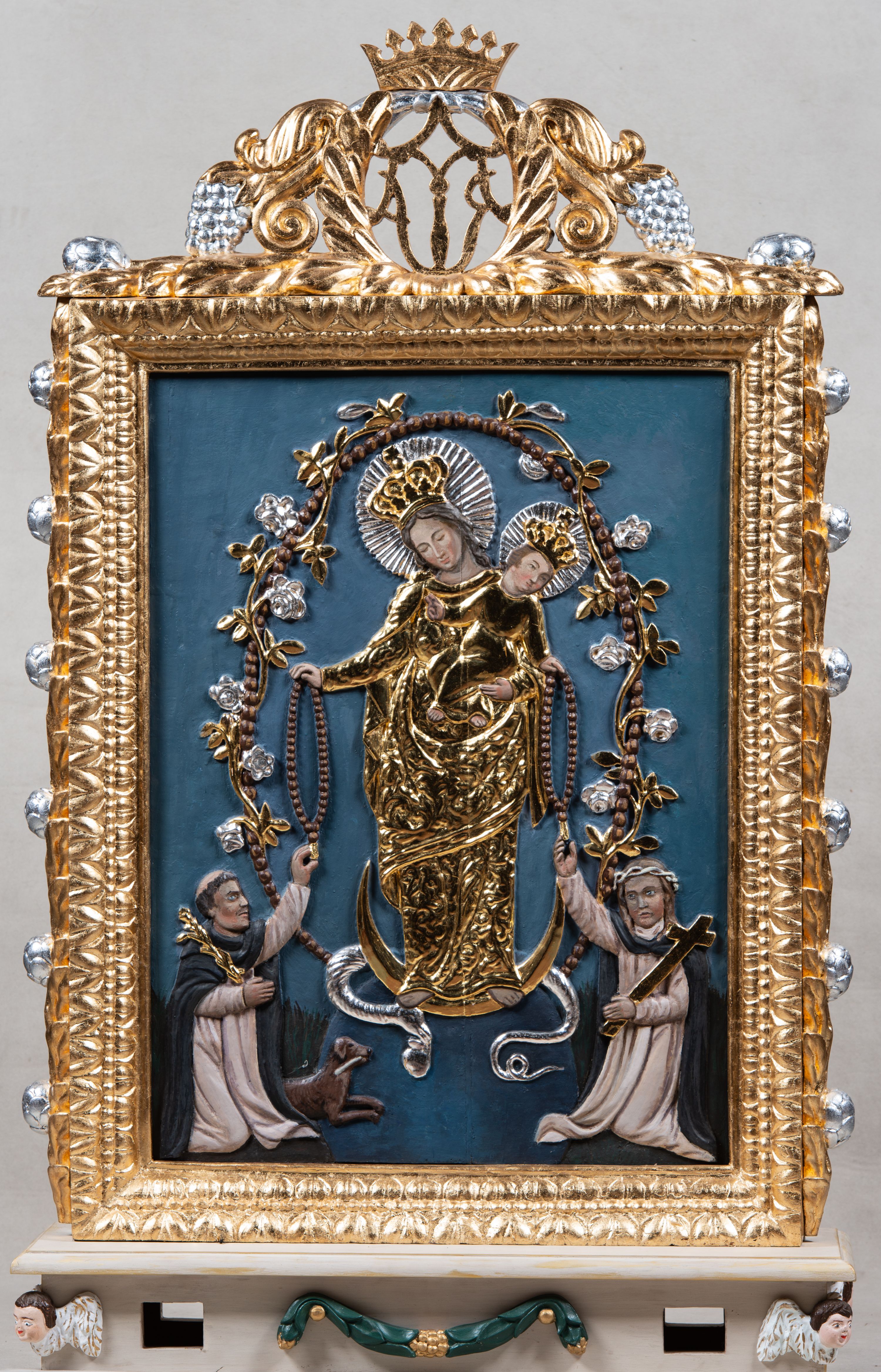 A procession float with paintings of Our Lady of the Rosary with the saints of Dominicans was created in the 19th century and it may have belonged to the Our Lady of Consolation Brotherhood existing by the parish in Stryszów since 1687. It depicts a traditional iconography of Our Lady of the Rosary. On the obverse side she is presented with St. Dominic - the first propagator of praying a rosary and on the reverse side - with St. Dominic and St. Catherine of Siena. This combination was aimed at putting together the image of the founder of the order and the most revered saint with the cult of the Rosary - strongly propagated by the whole order.