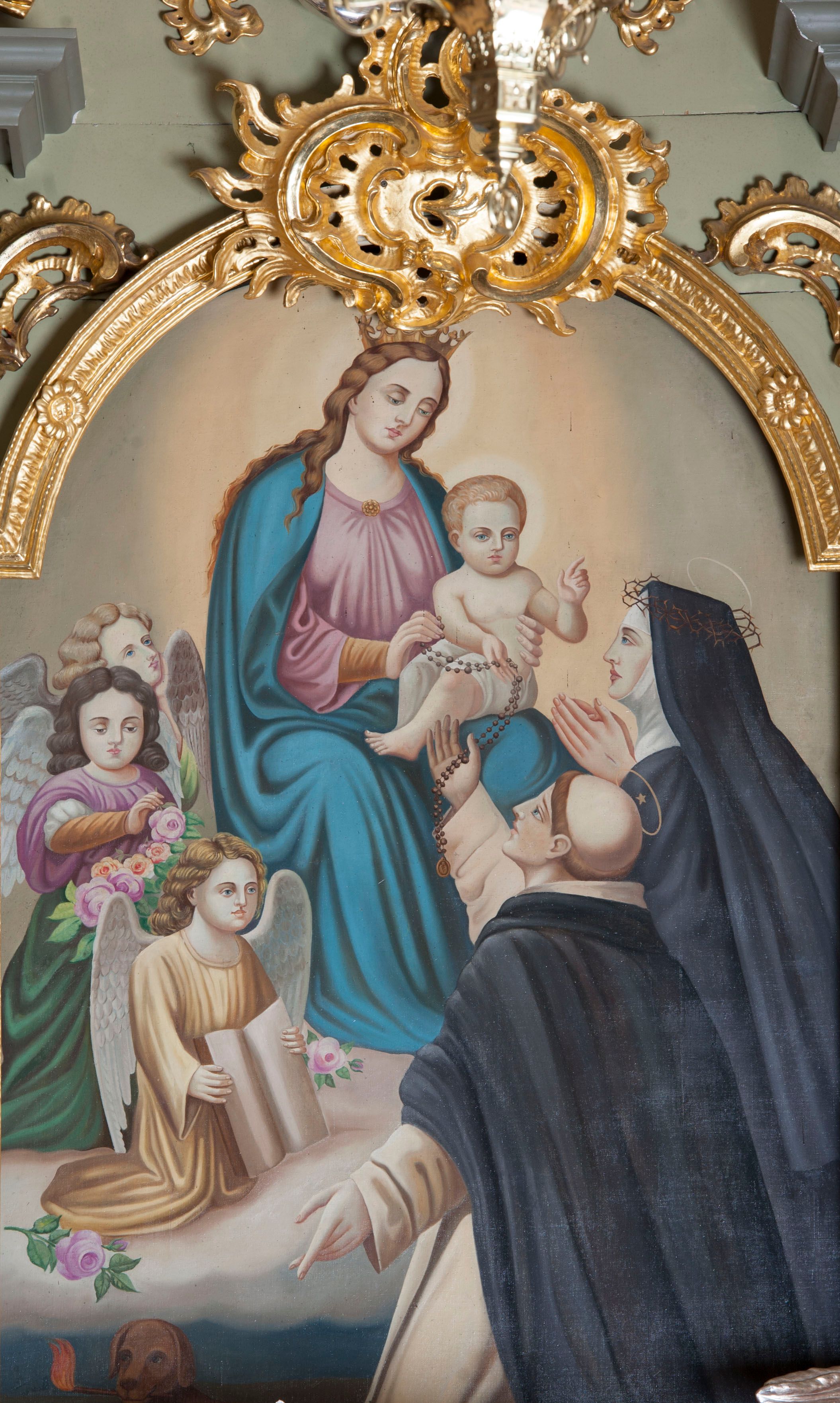 The paining on the sliding panel of the high altar at the church in Krempachy depicts Our Lady of the Rosary giving rosaries to Dominican saints: St. Catherine of Siena and St. Dominic. The prayer was popularised by a Dominican, Alanus de Rupe, who linked its origin to St. Dominic. The first Brotherhood of the Holy Rosary was established in 1475 by Jakub Sprenger, the prior of the Dominican monastery in Cologne. The painting was created by an unknown artist in the 19th century.