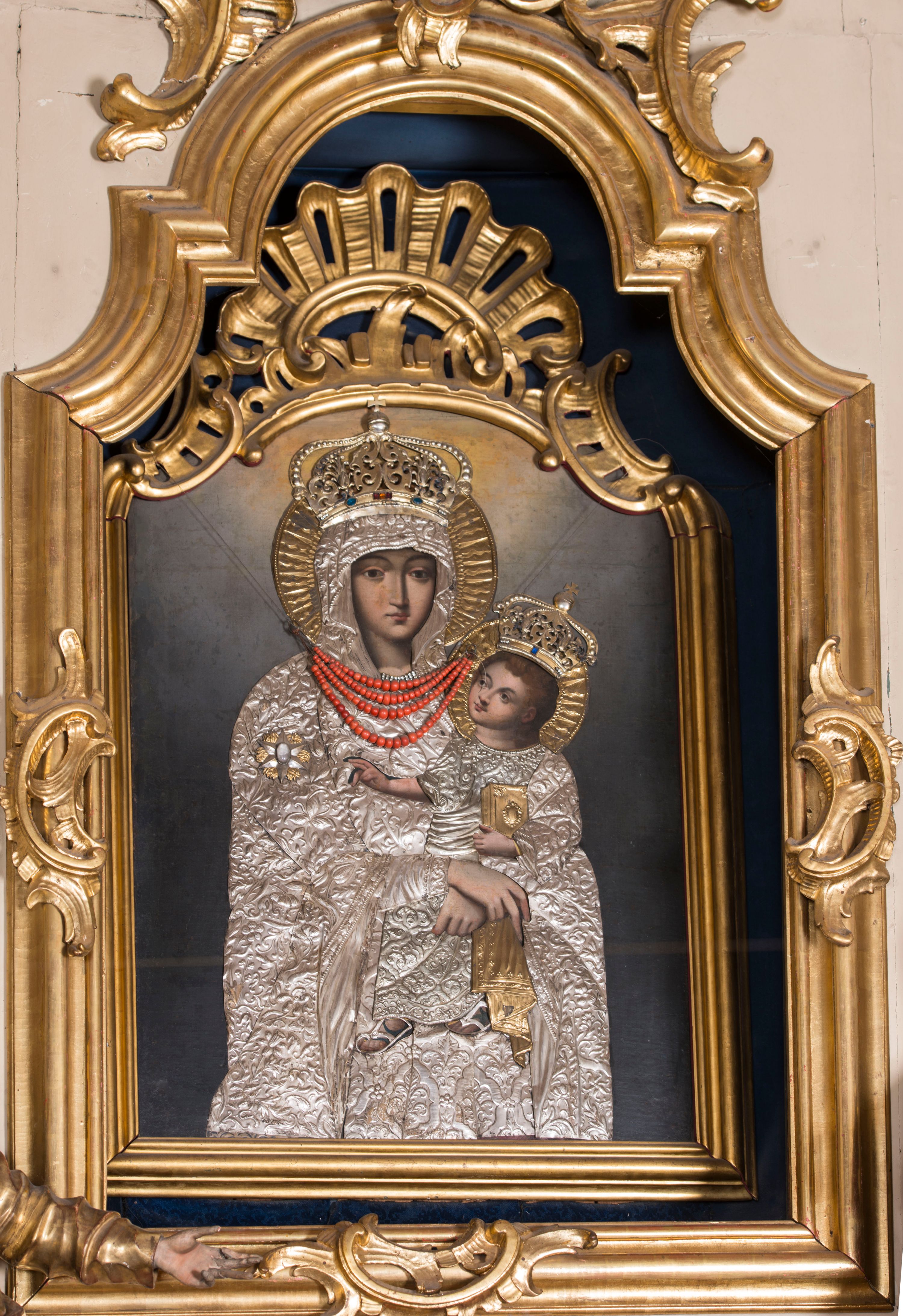 The painting was supposedly brought from Rome by a parish priest, Hannibal Orgas, in 1626. The current robe is from 1836. The painting of Our Lady of the Snows is based on the miraculous icon of Salus Populi Romani, located in the Basilica of Santa Maria Maggiore in Rome.