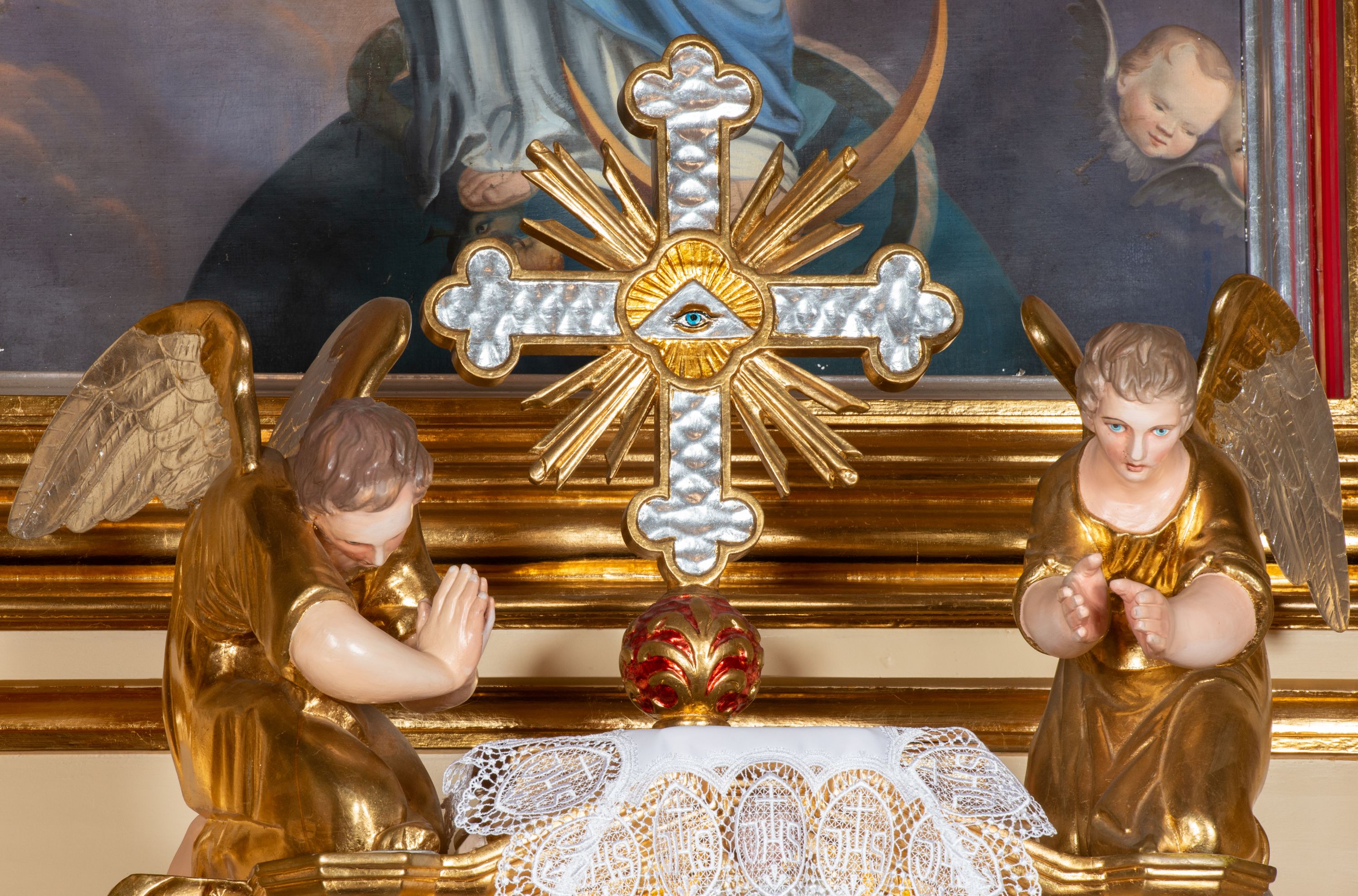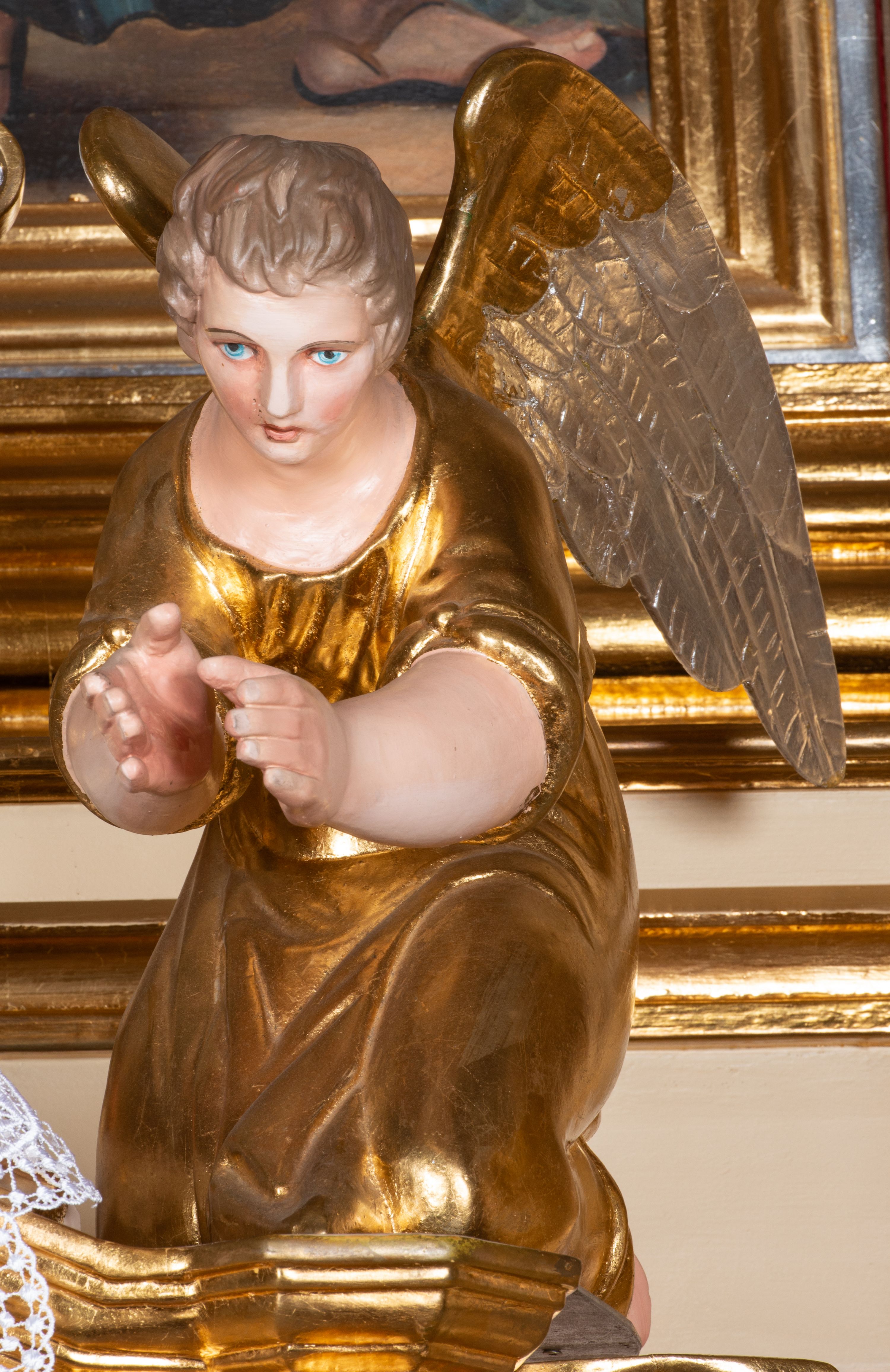 Figures of angels, free-standing, placed on the high altar were made in 19th century along with a set of other figures surrounding the tabernacle. It depicts angels adoring and praising God. The author of these sculptures is unfortunately unknown.