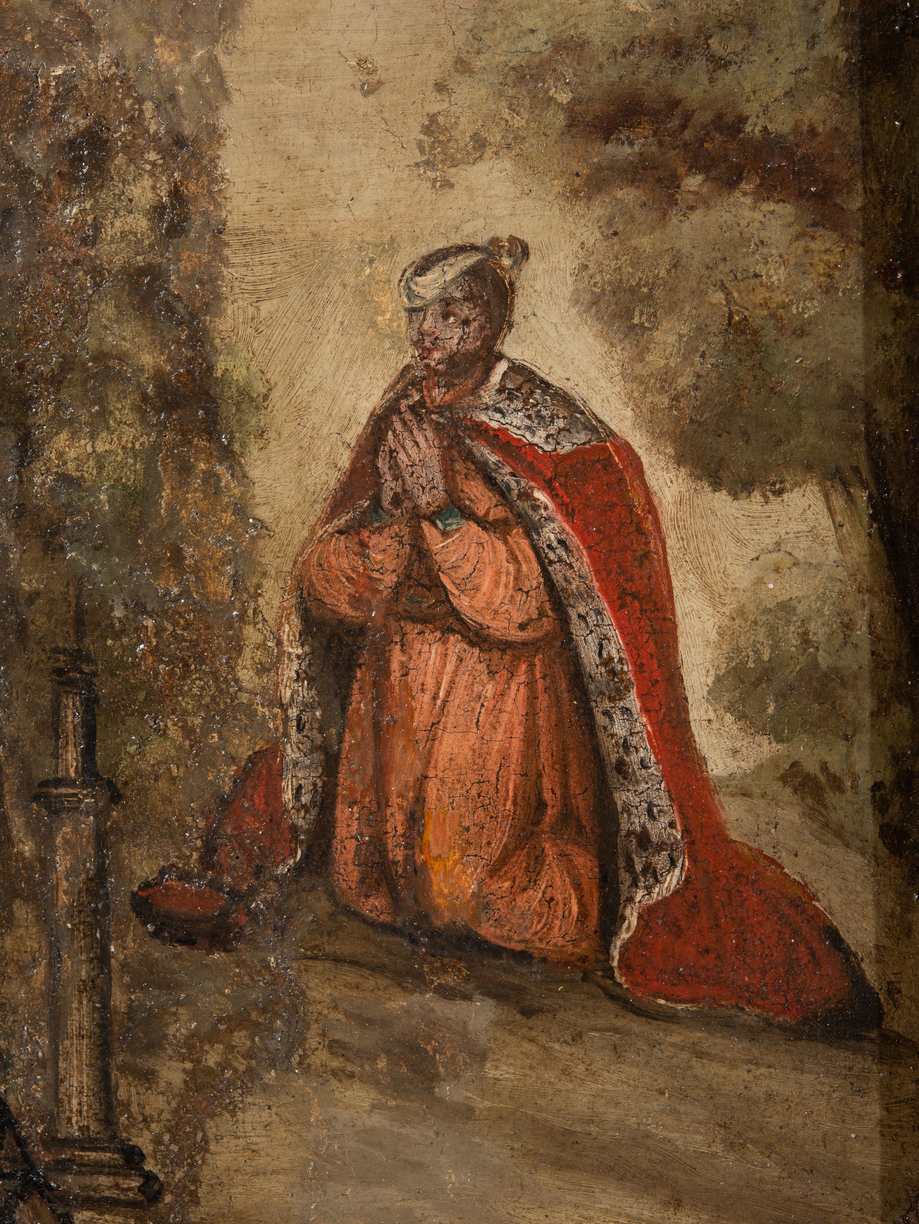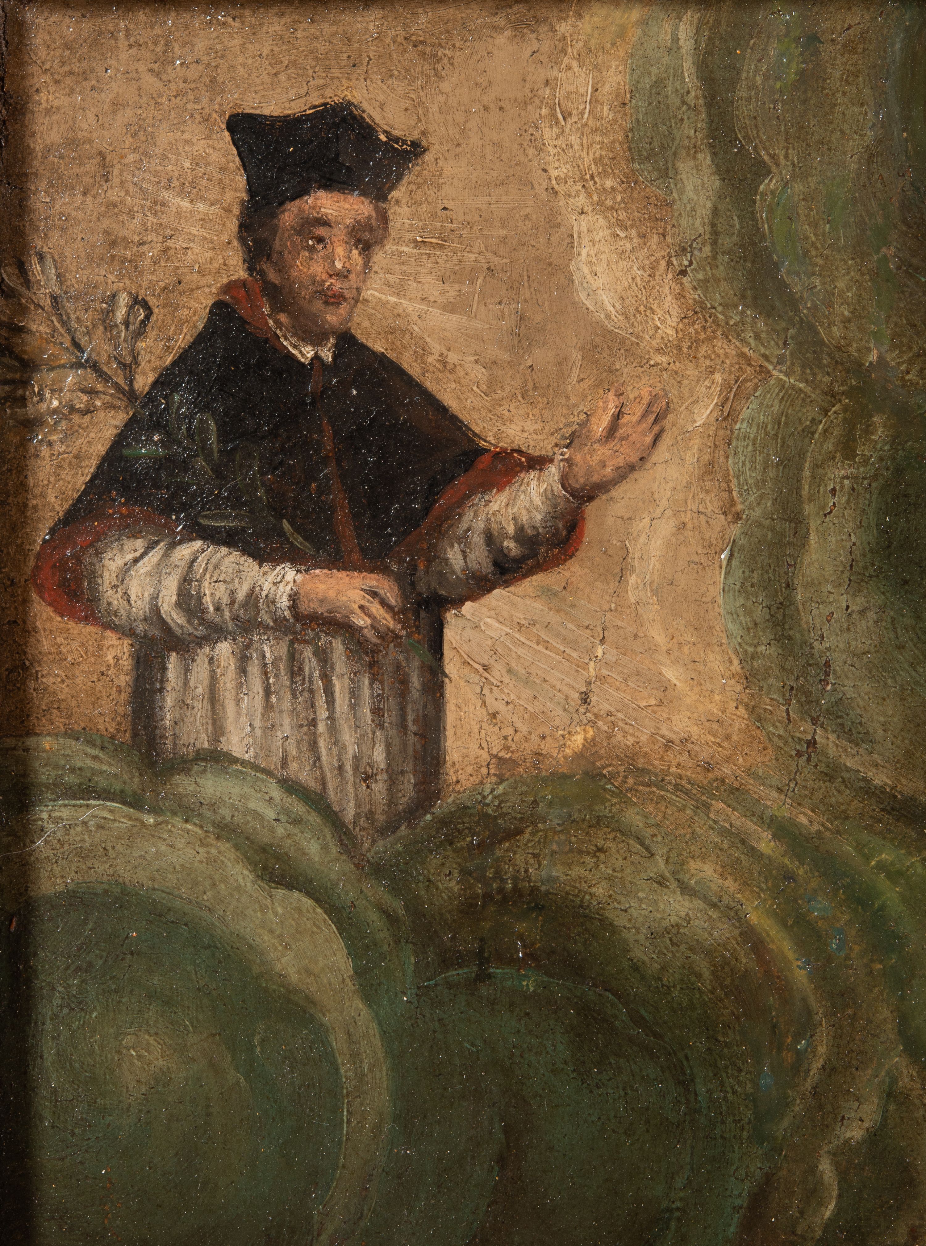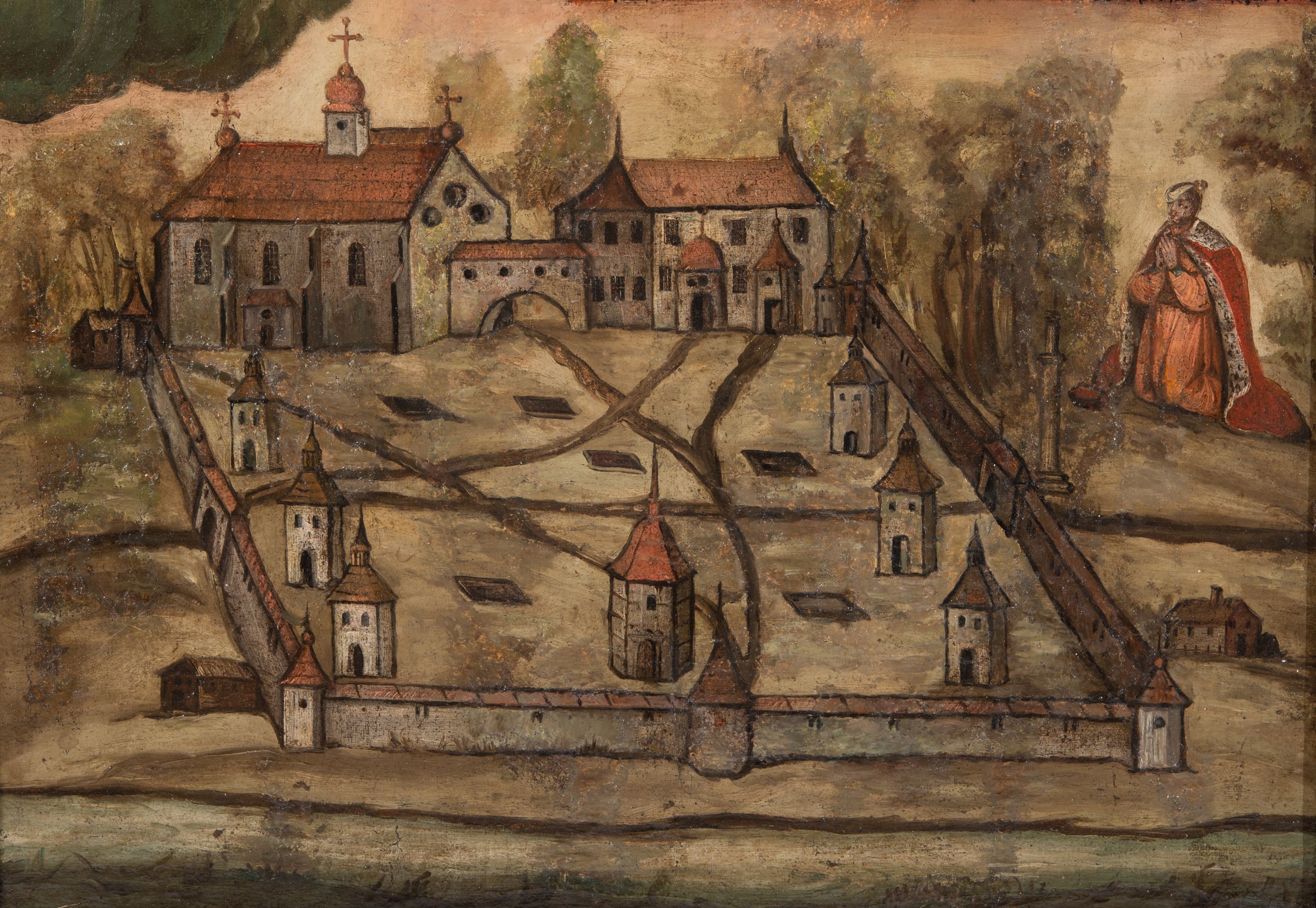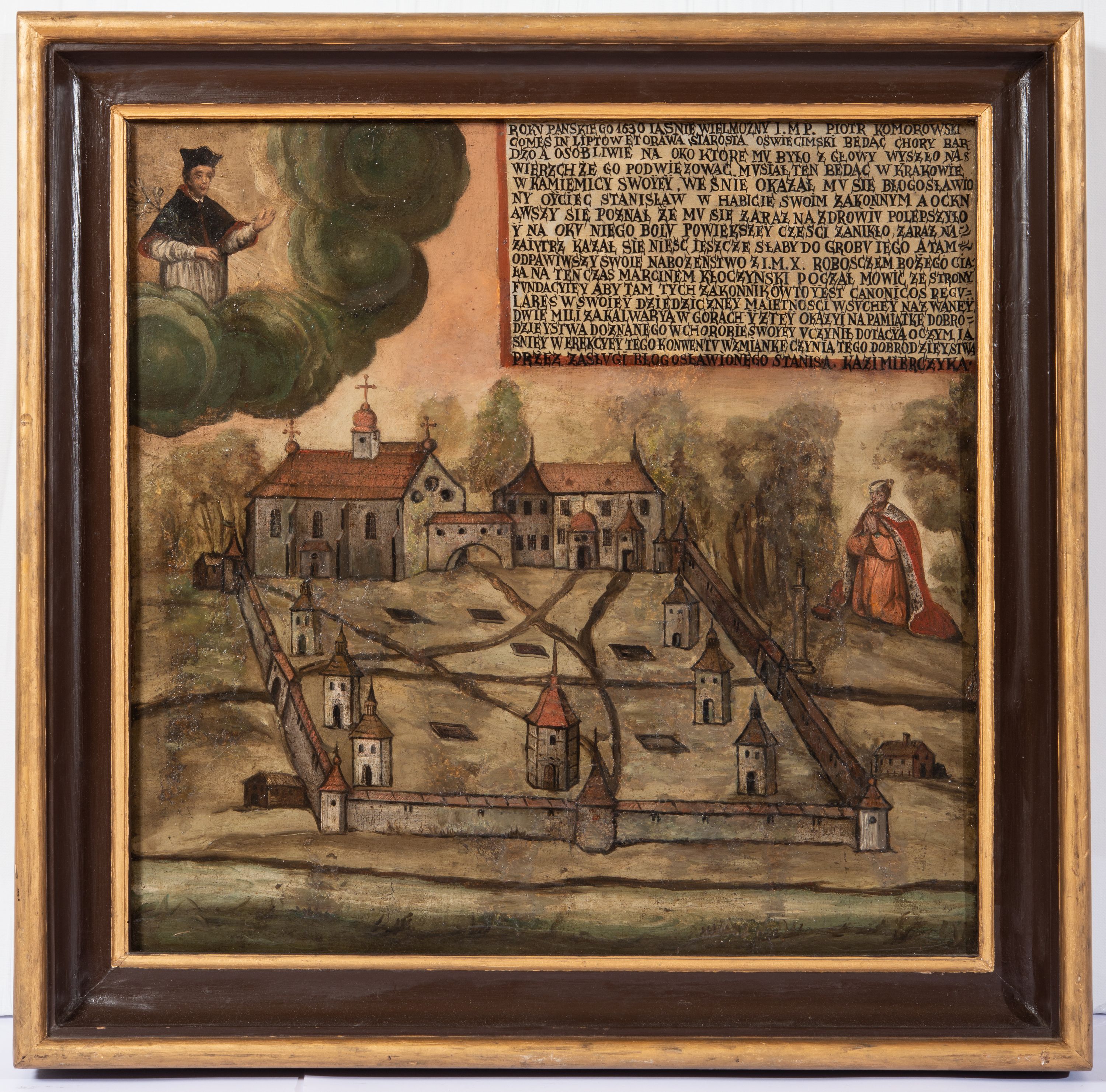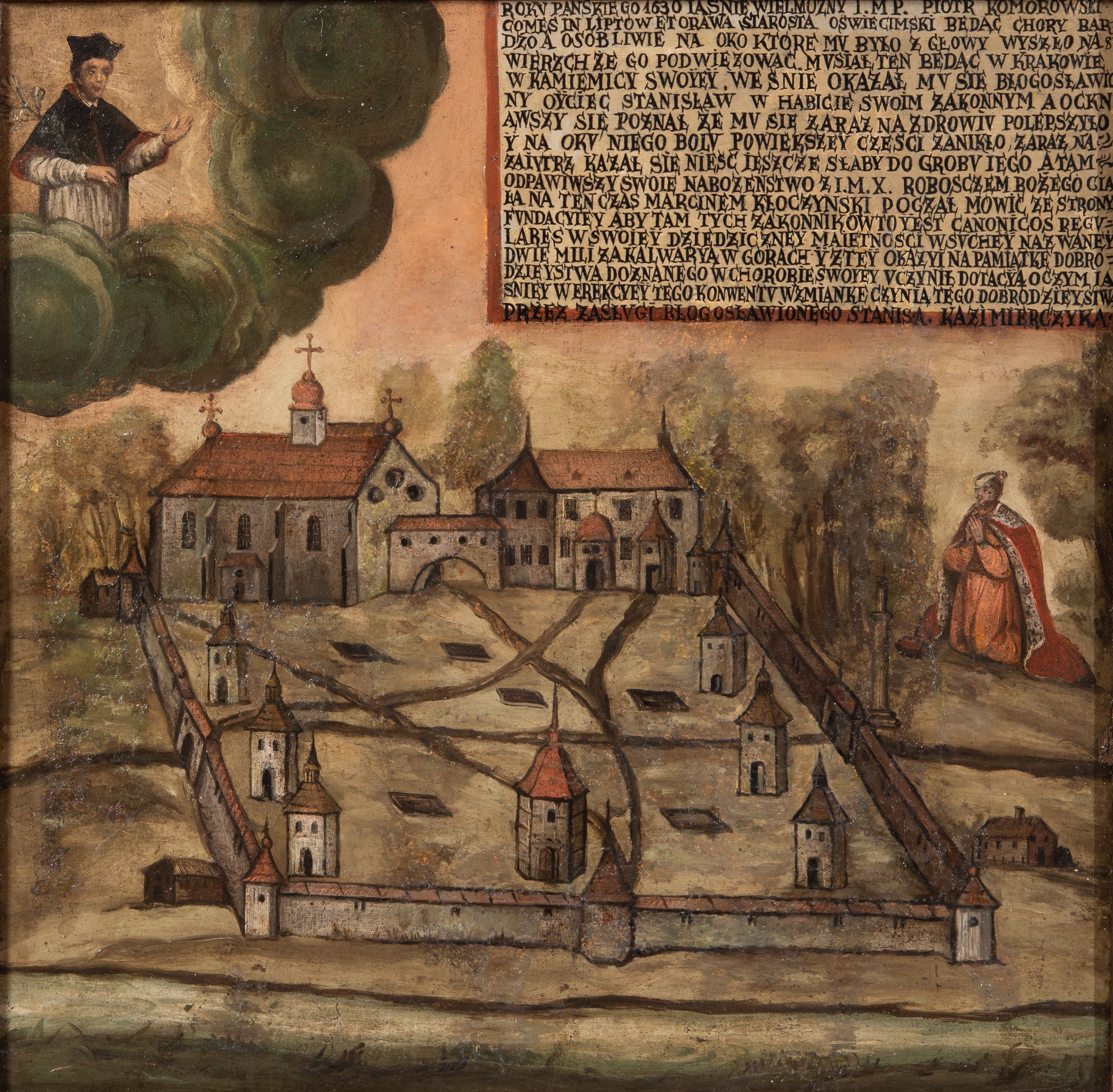 The votive image commissioned by Piotr Komorowski in 1630 depicts a story of his healing by, at present, St. Stanisław Kazimierczyk and plans for the future thanksgiving foundation. It was painted for the Corpus Christi Church in Kazimierz, a city nearby Cracow, currently its district. It hung at the tomb of Stanisław Kazimierczyk, who was buried there.