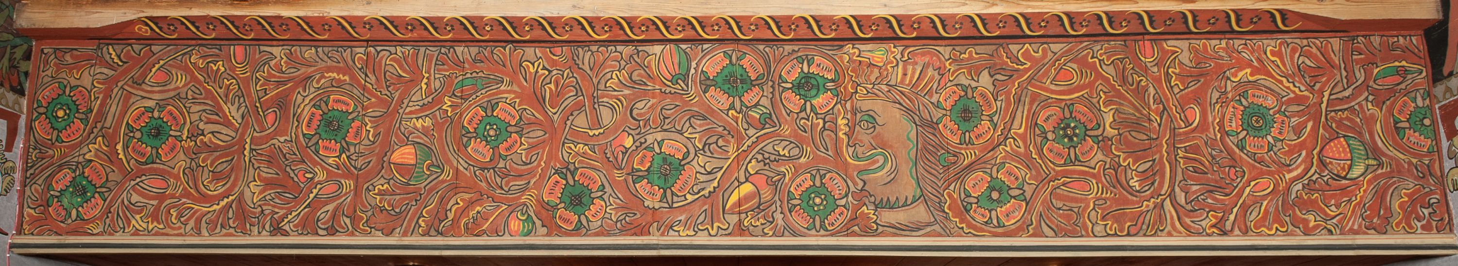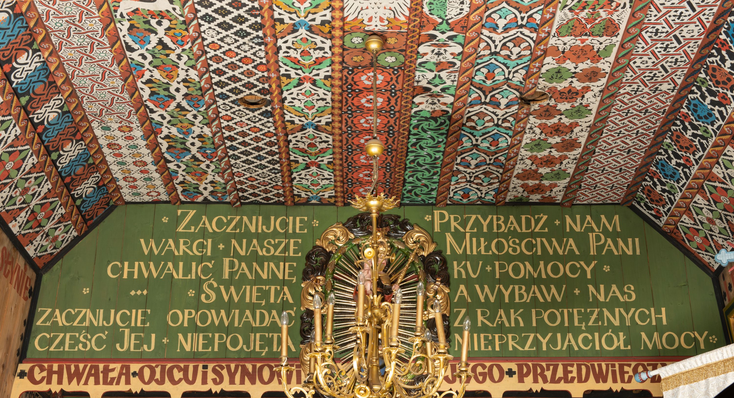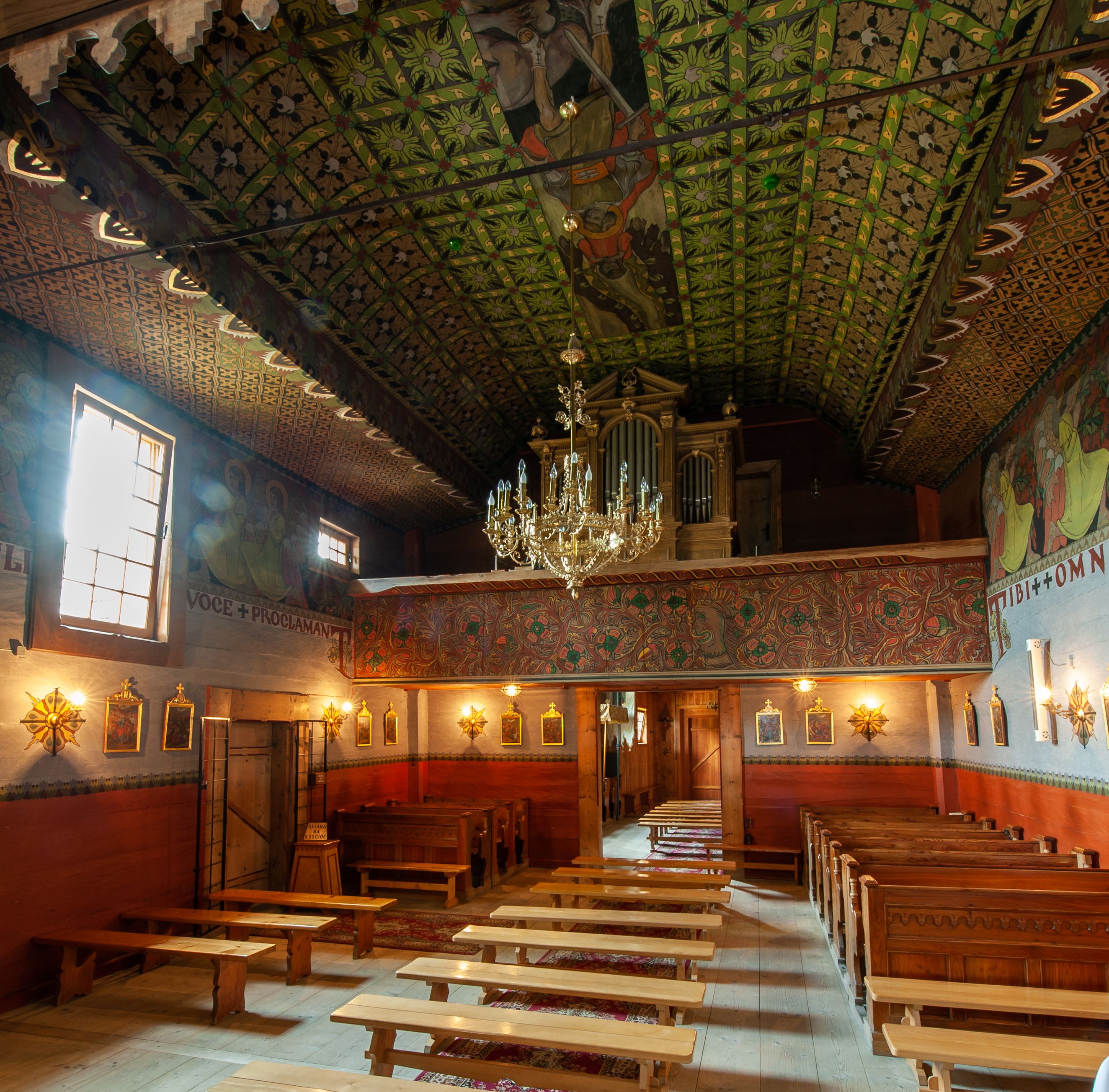 The oldest polychrome fragments originate from around the year 1500. They were subsequently used to board the walls and ceilings of the front ante-church and were discovered during the renovation in 1932. Its fragments may be seen on the atrium ceiling before the tower, the rood beam and the choir sill, though, in most cases it is a reconstruction. Remaining parts were made in 1935 by Władyslaw Cichoń, Adam Dobrzański and Eugeniusz Pisarek.