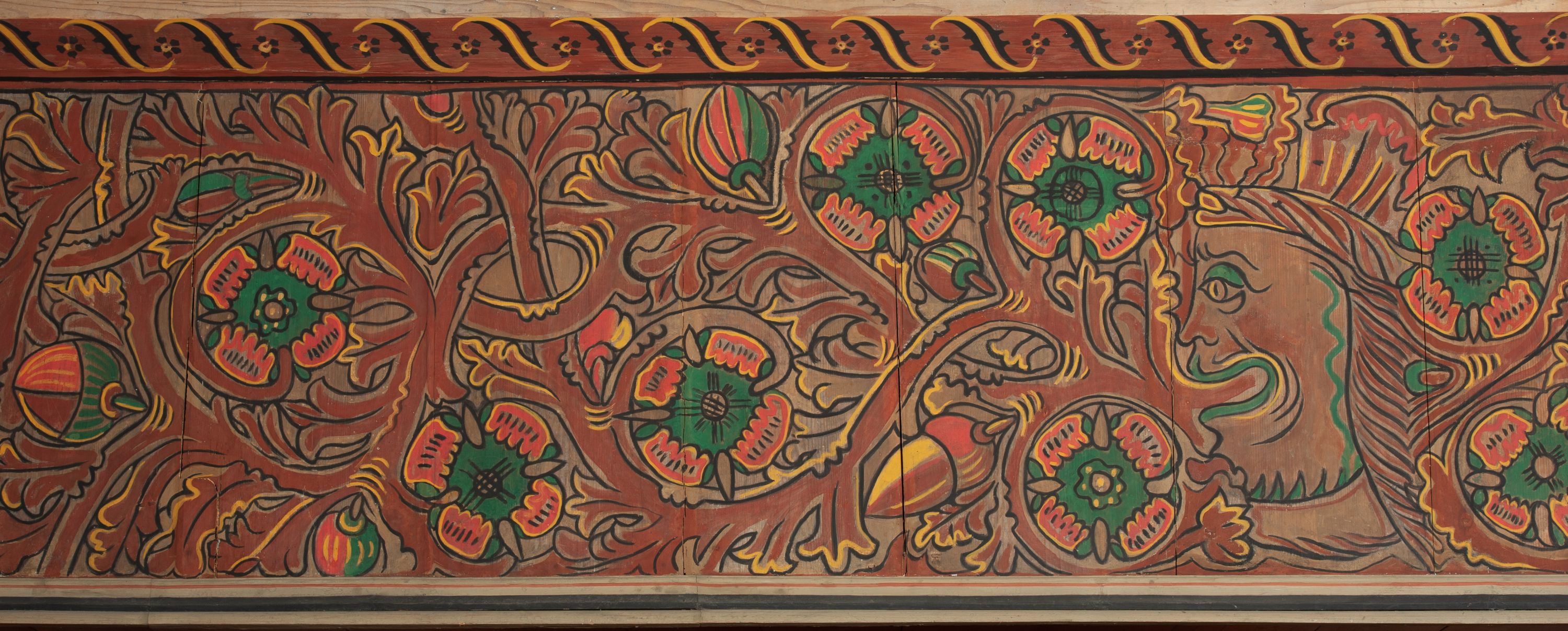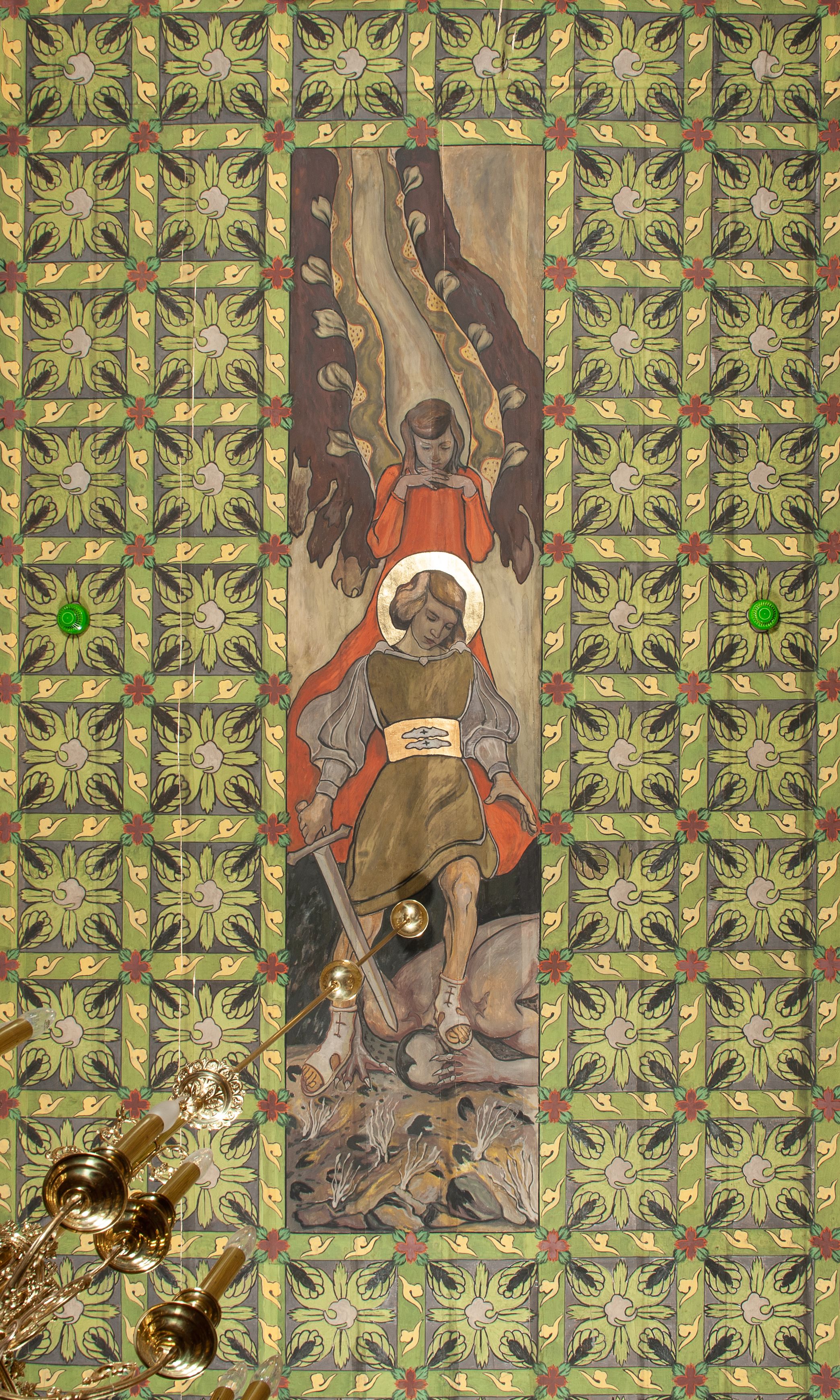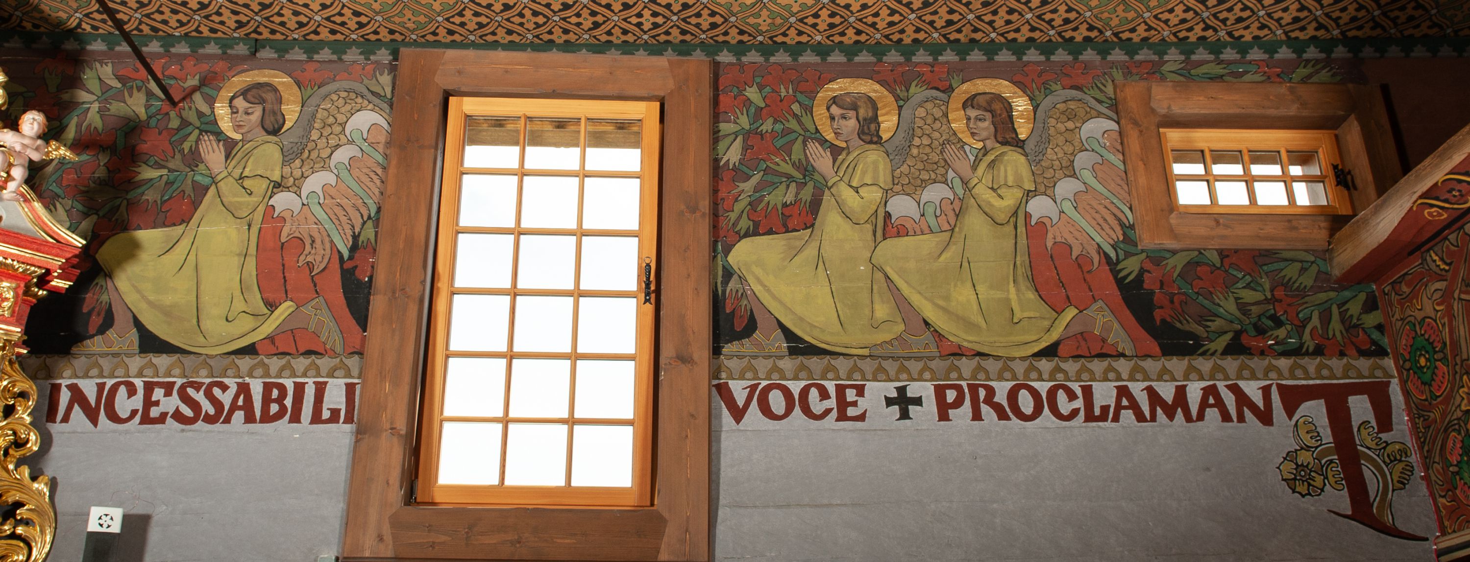 The oldest polychrome fragments originate from around the year 1500. They were subsequently used to board the walls and ceilings of the front ante-church and were discovered during the renovation in 1932. Its fragments may be seen on the atrium ceiling before the tower, the rood beam and the choir sill, though, in most cases it is a reconstruction. Remaining parts were made in 1935 by Władyslaw Cichoń, Adam Dobrzański and Eugeniusz Pisarek.