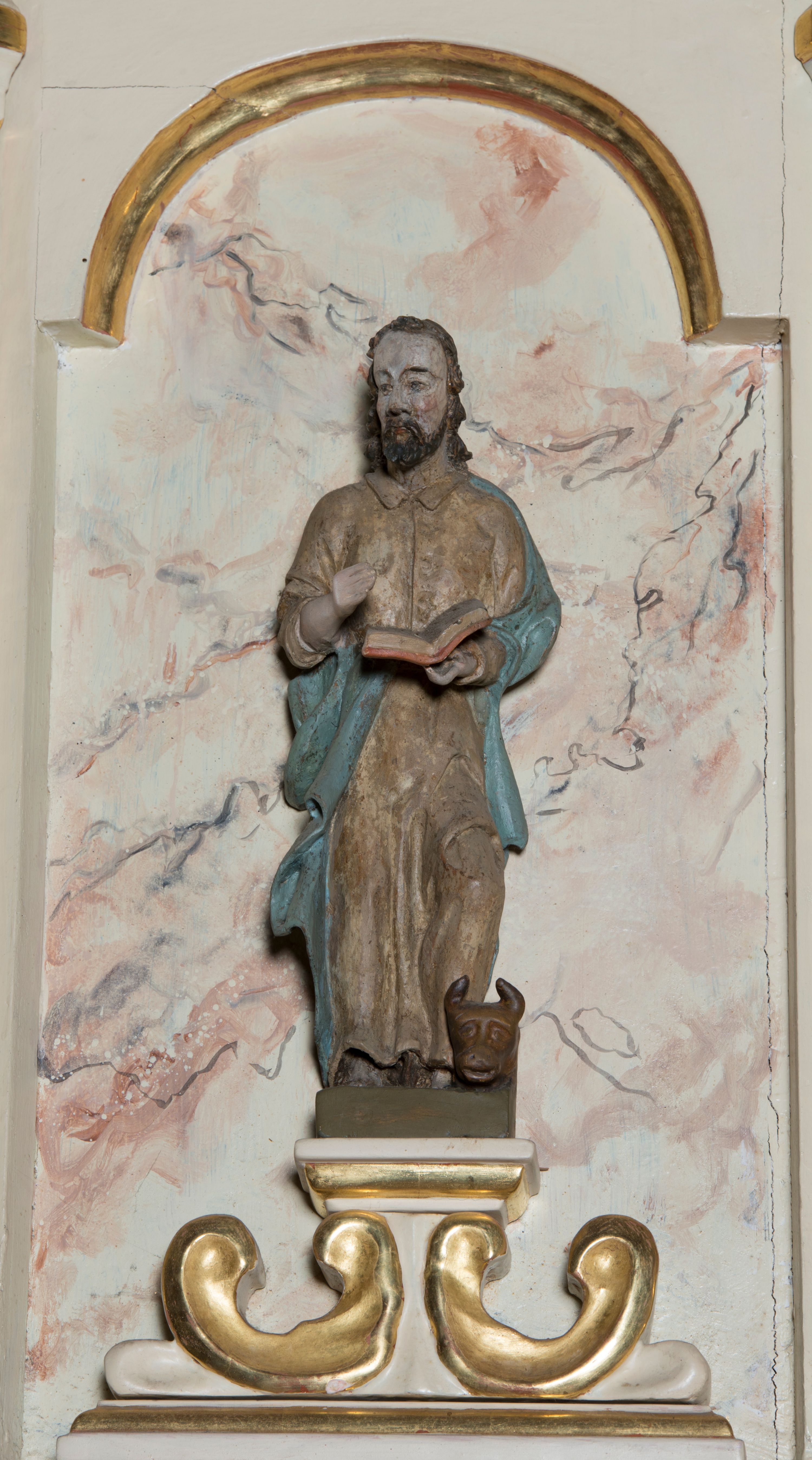 The pulpit was made in 1882 by carpenters from Morawica. The statues probably come from the previous pulpit. Its destiny was associated with reading liturgical texts and preaching.