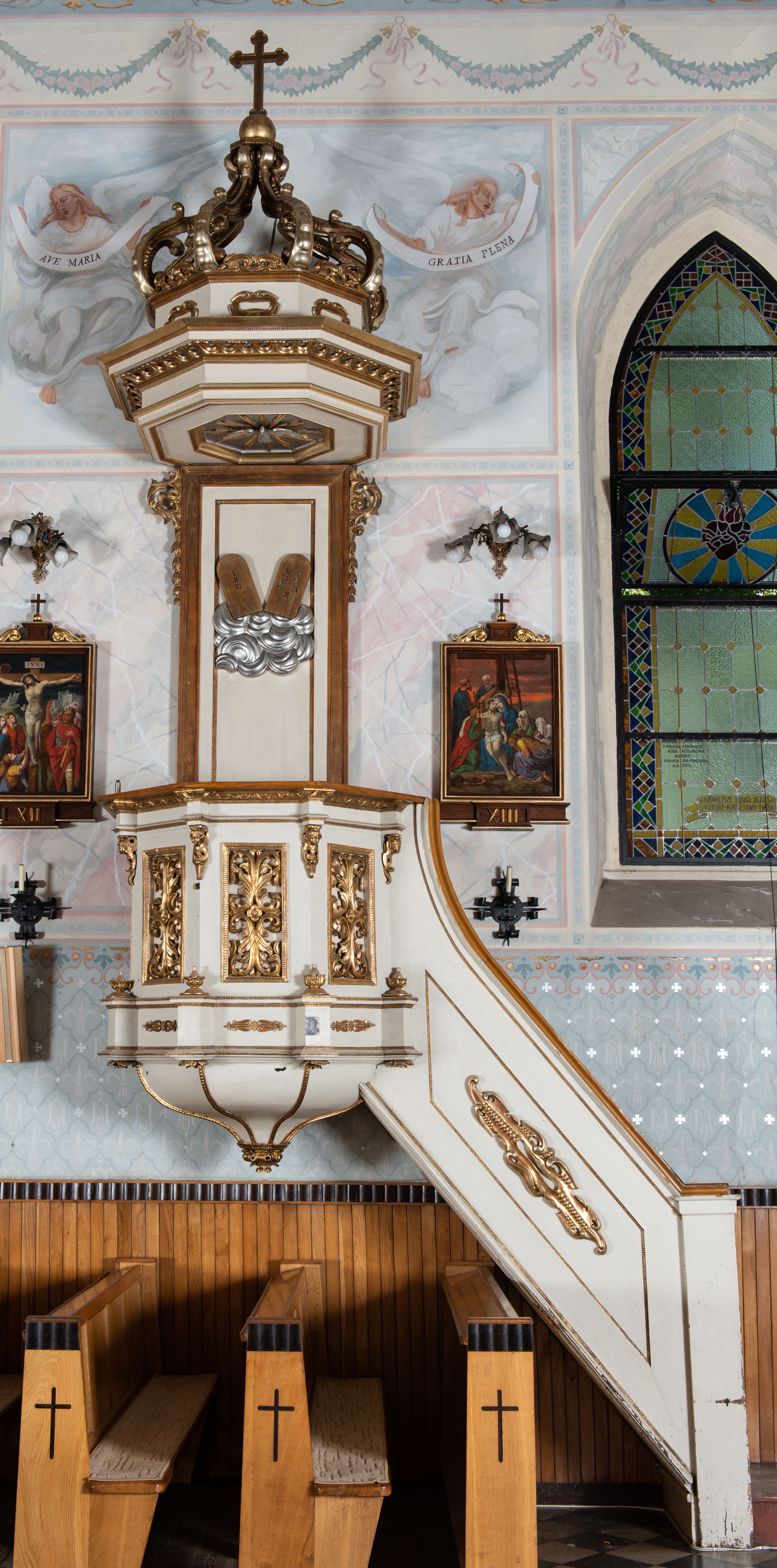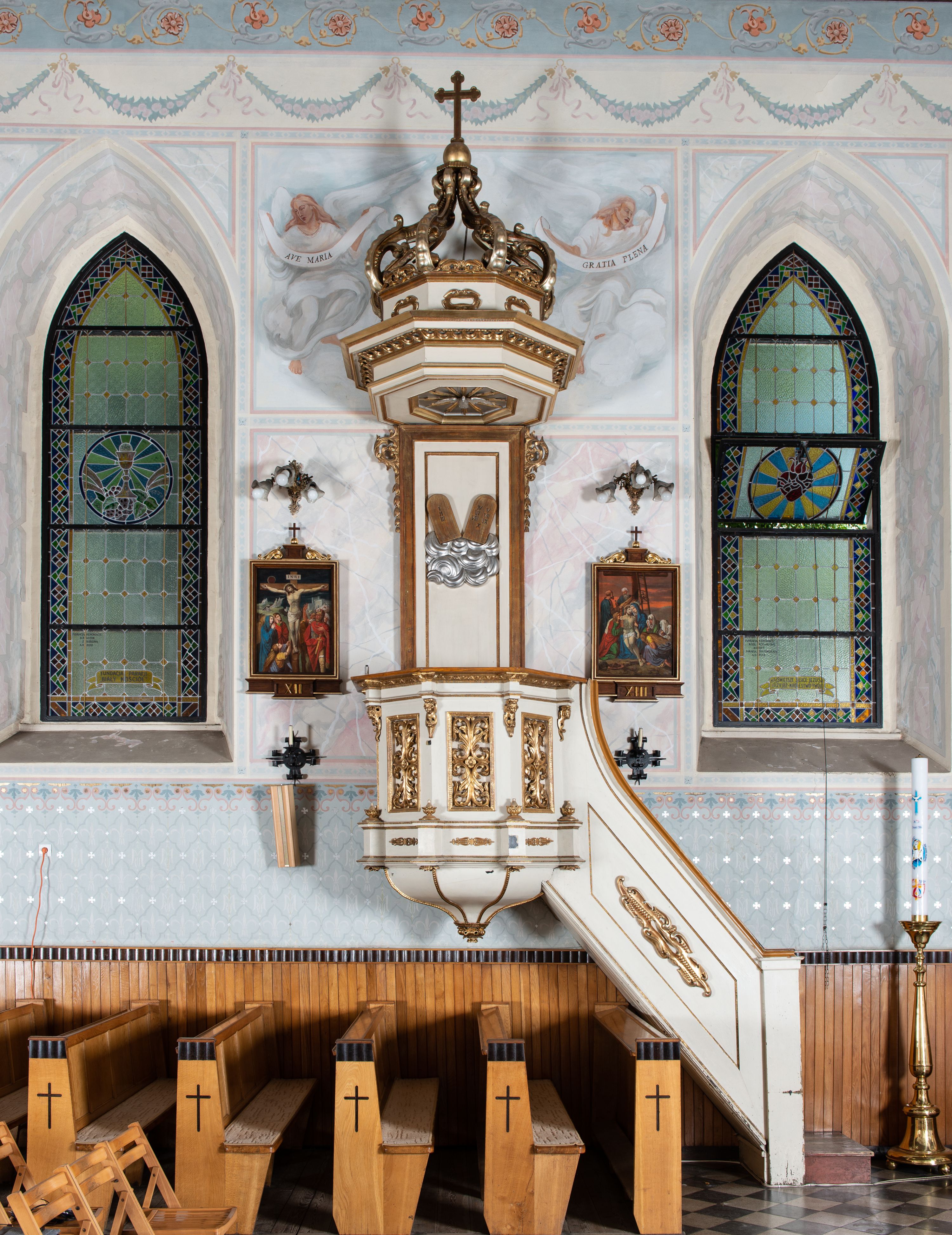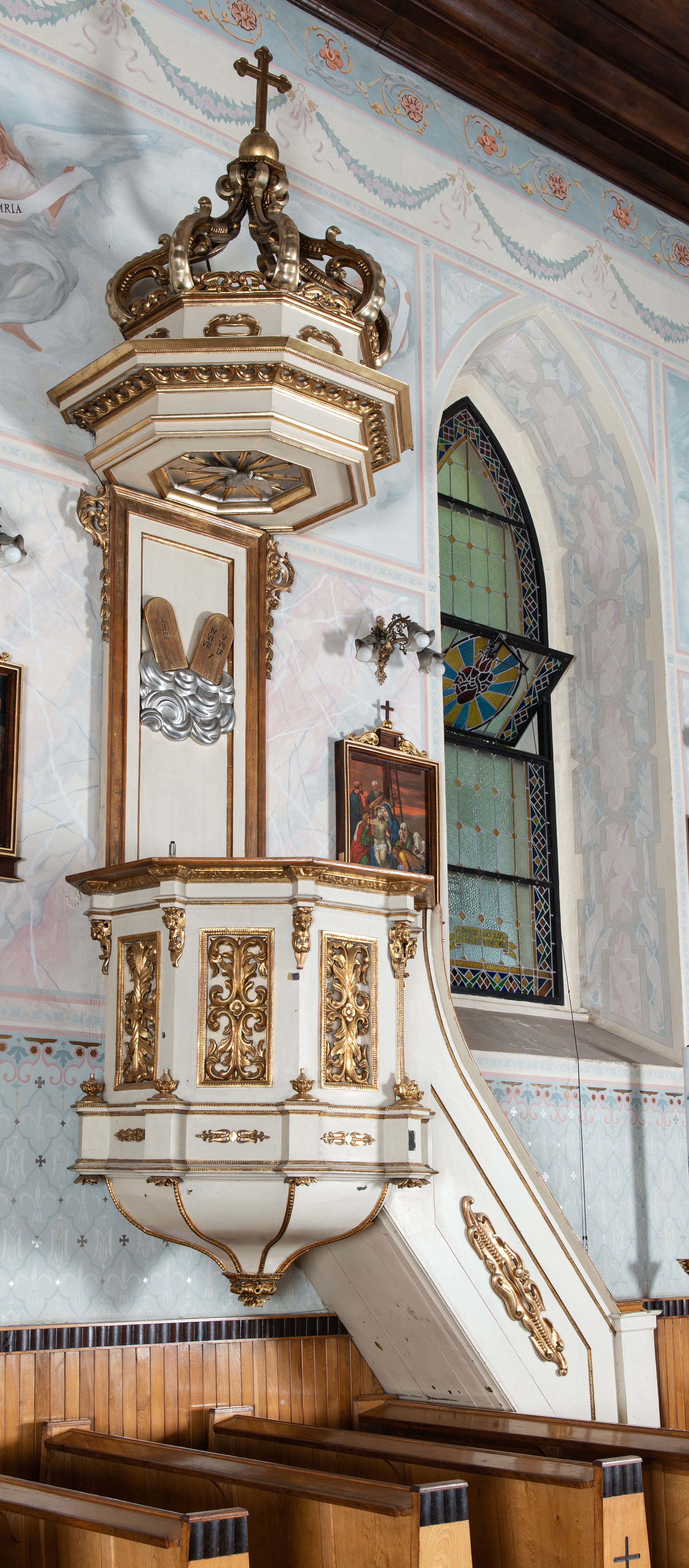 The pulpit by sculptor Paweł Turbas of Olkusz is characterised by an eclectic style and was made in the fourth quarter of the 19th century. Influence of historicism and inspiration from works of Wit Stwosz (as well as of local artists and his collaborators) are visible in his works.