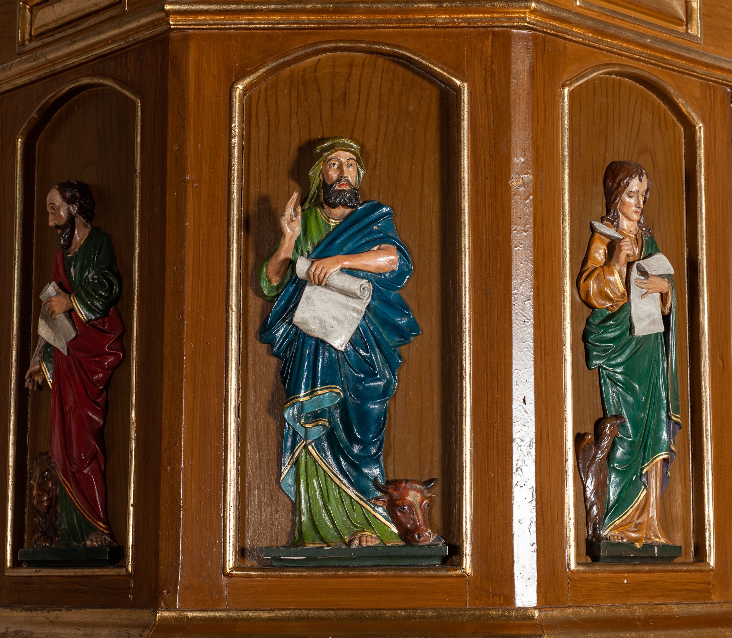 The pulpit created by an unknown author is an example of the local workshop skills from 1916. The most important elements of the pulpit in the church in Gorzków are the evangelists sculpted on the walls of the basket, presented in a typical iconographic manner: with scrolls in one hand and making a blessing gesture with the other hand, accompanied by their respective attributes.