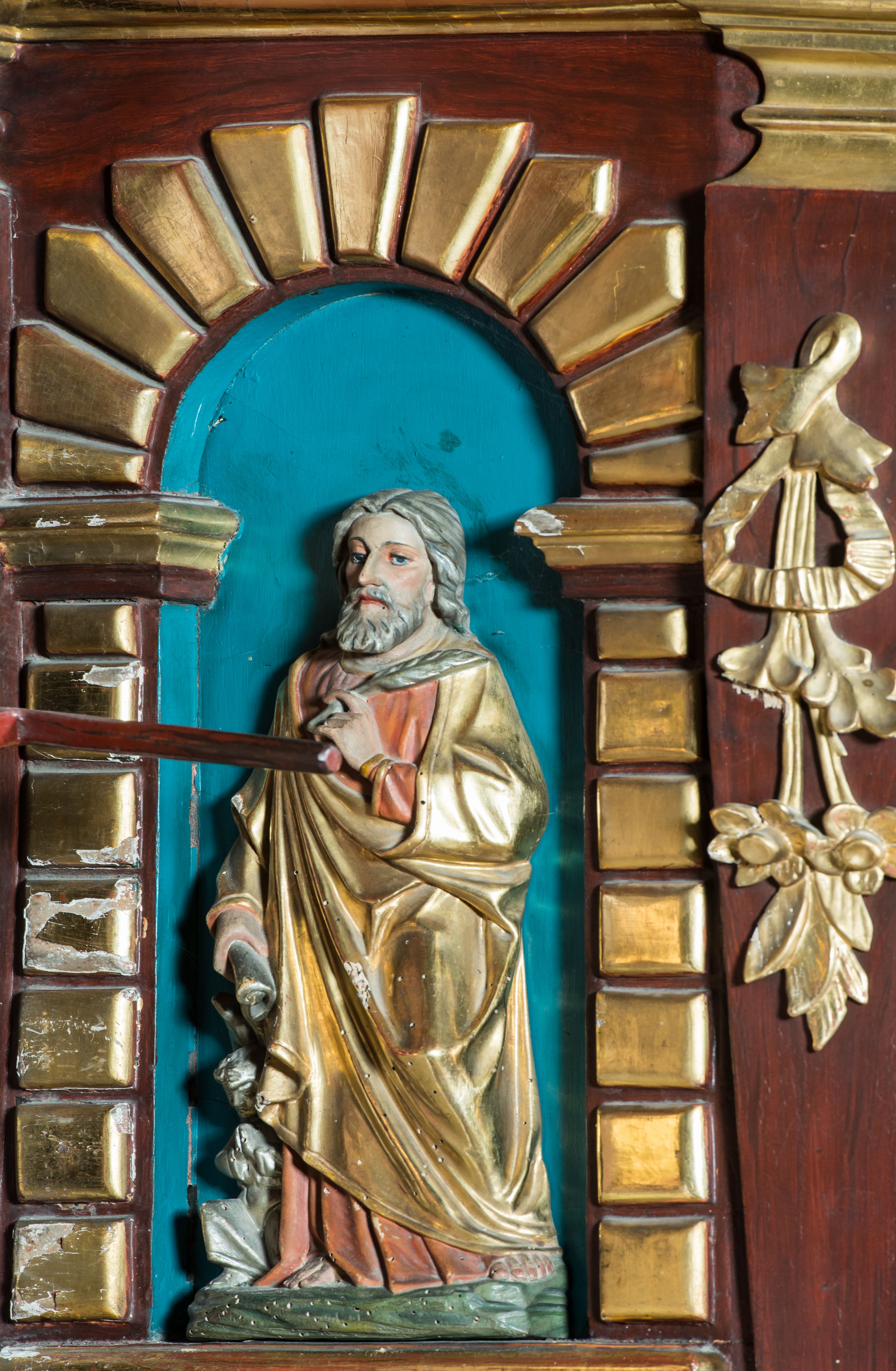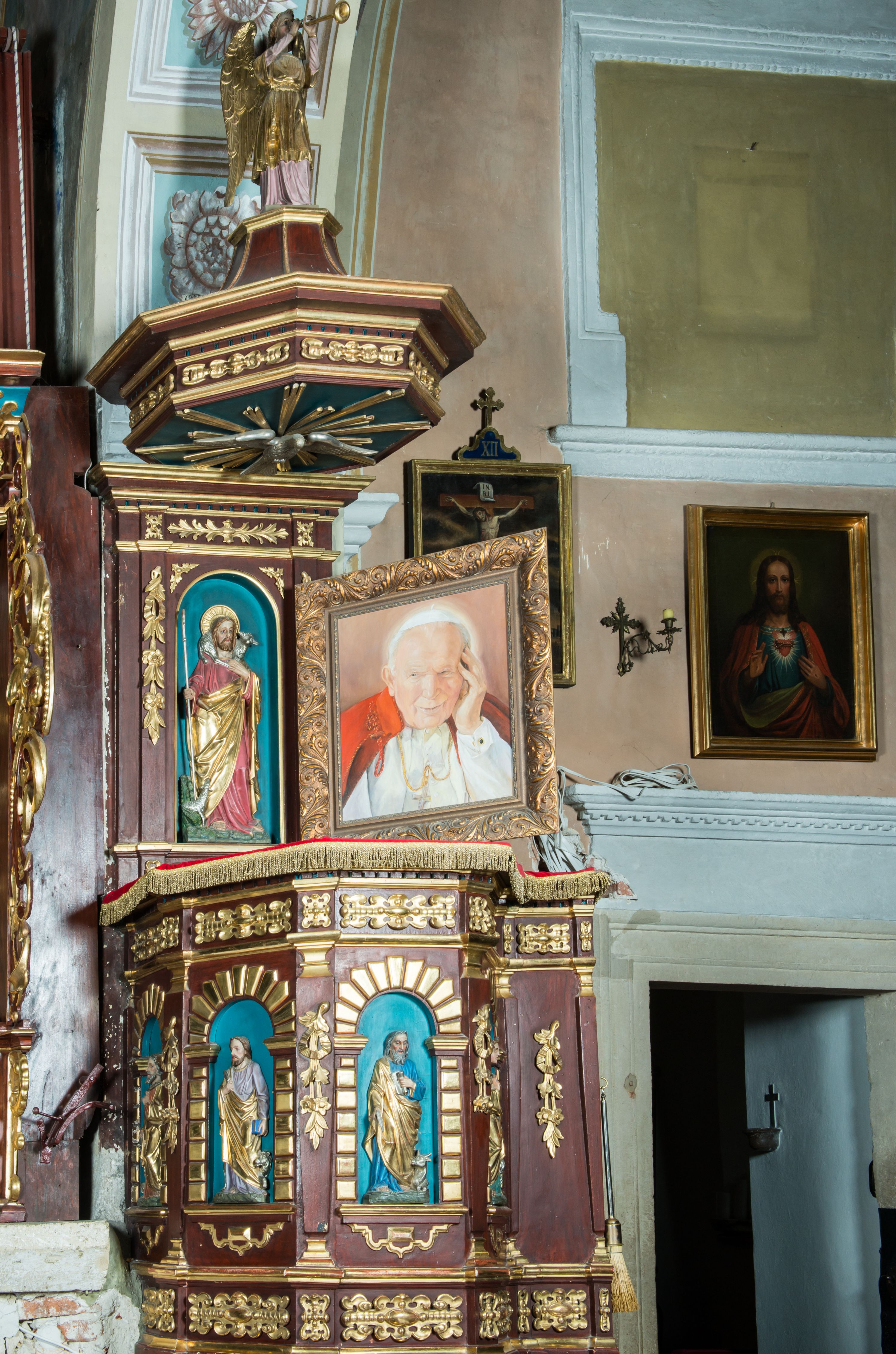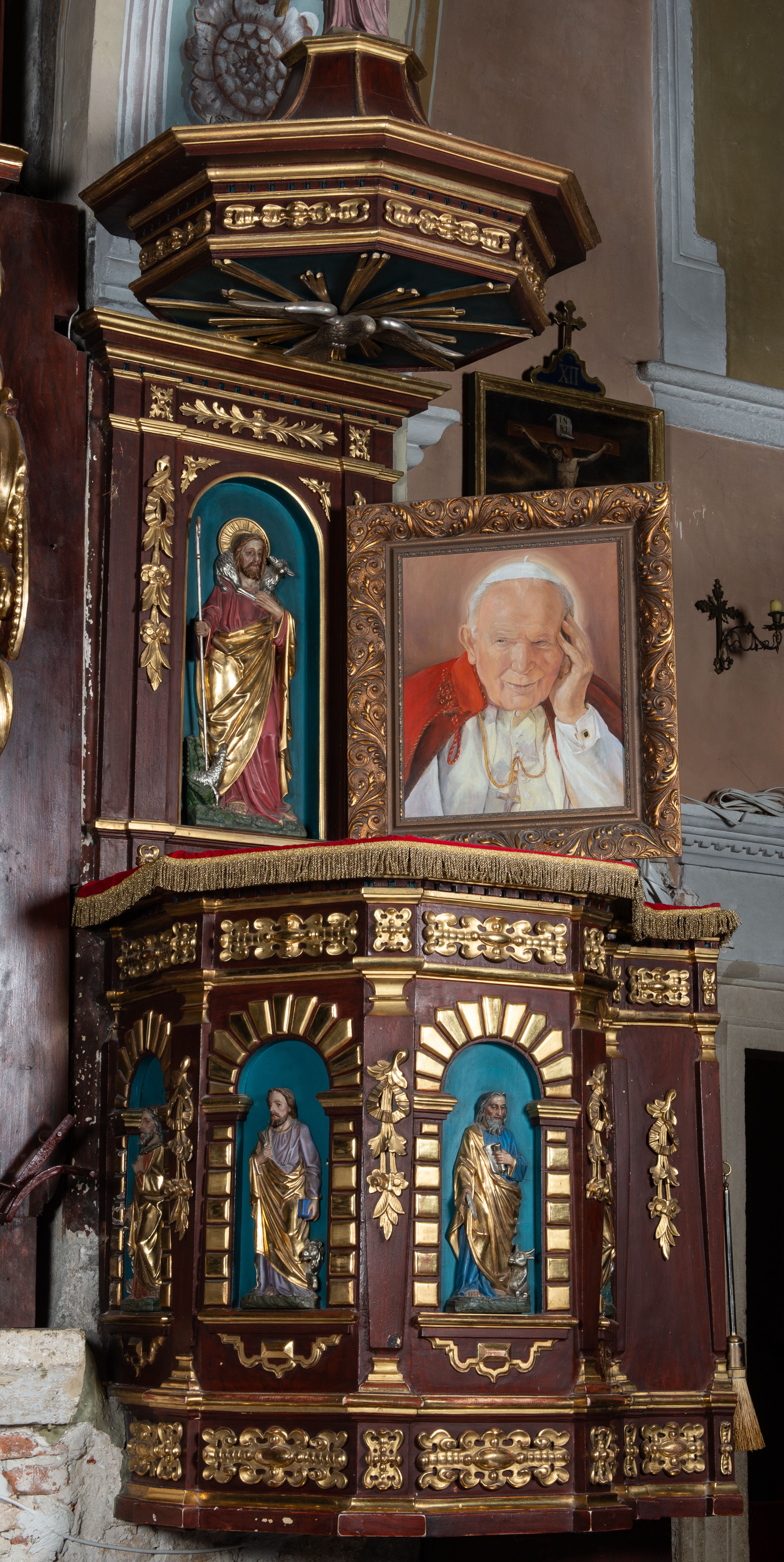 The pulpit was probably established soon after the church was built, between 1630 and 1650. It was partially re-shaped in the second half of the 19th century and the statues of the evangelists on the walls of the basket and the relief of Christ the Good Shepherd come from that period. Probably also at that time it was deprived of a decorative overhang at the base.