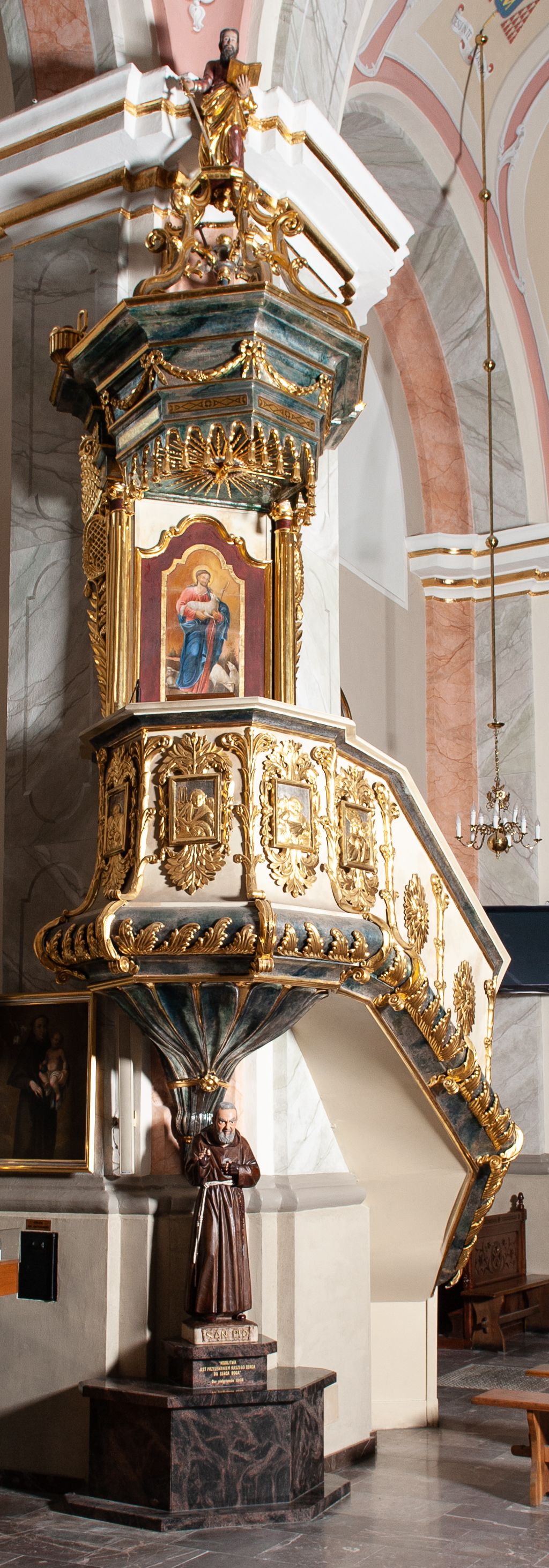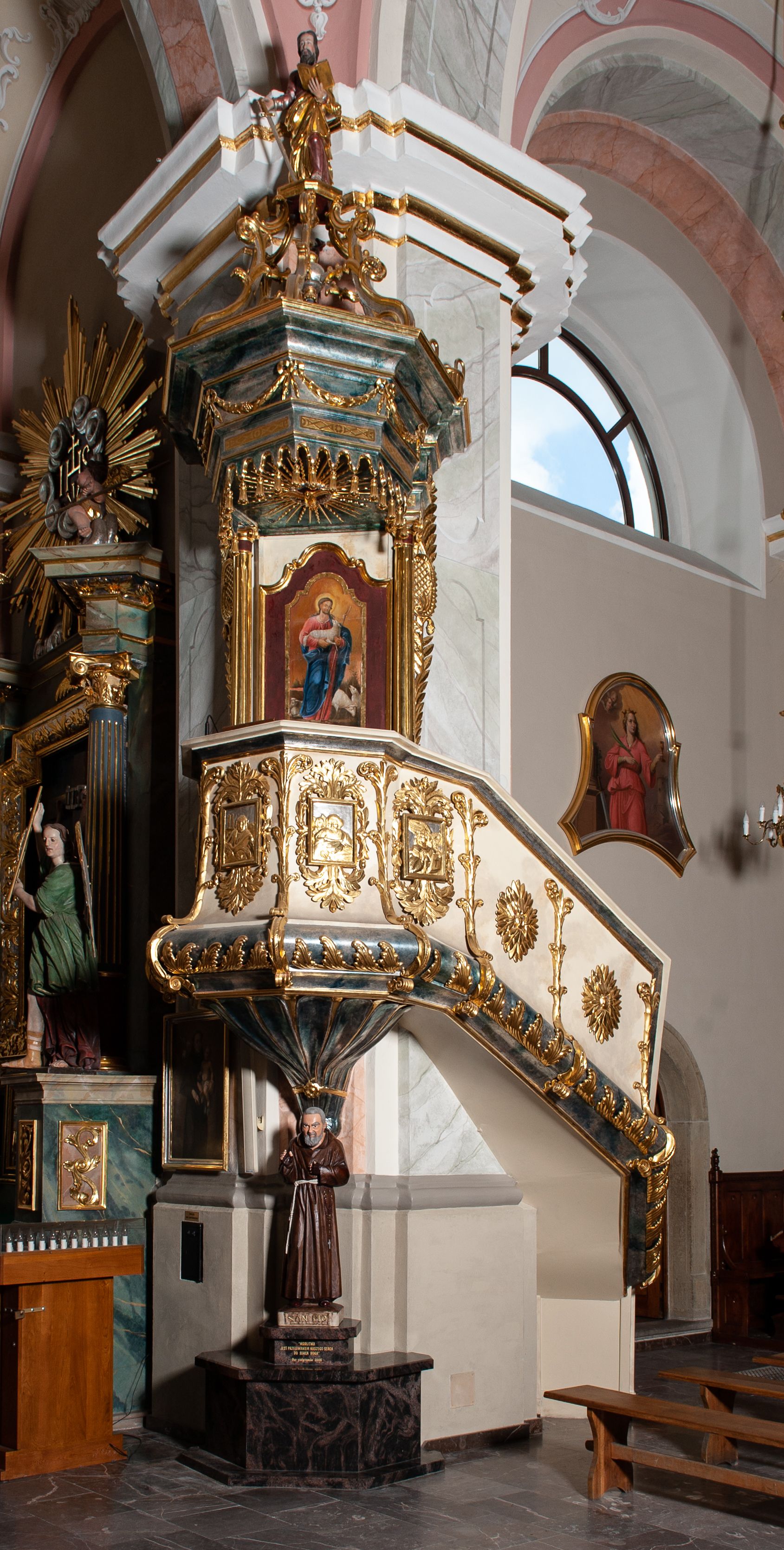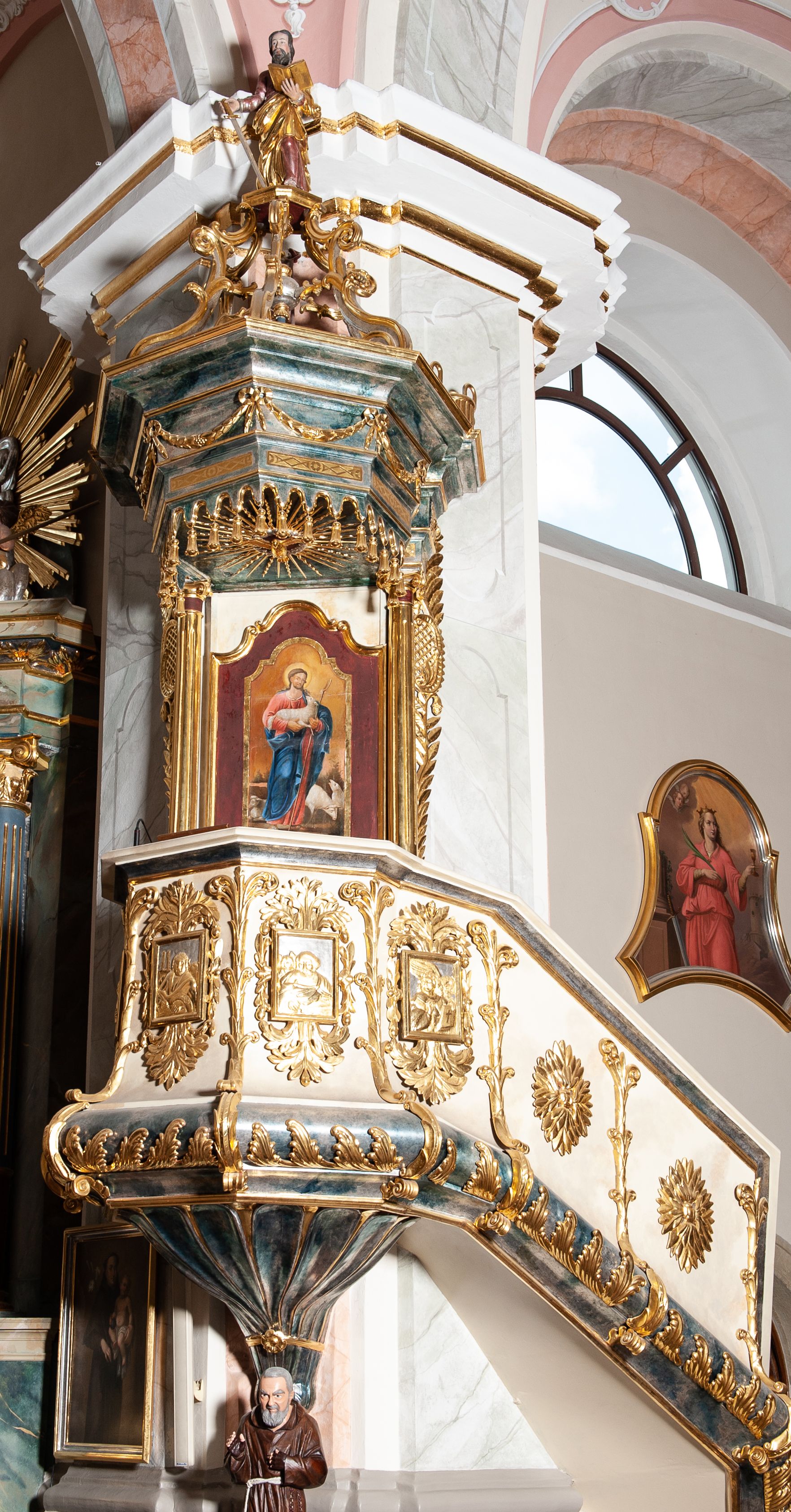 The pulpit was built in 1830 or 1831. It was initially located next to the first pillar of the nave. Its primary purpose was to provide an elevation for reading liturgical texts and delivering sermons. A canopy intrados is decorated with the relief with the representation of the Holy Spirit in a form of a dove. It symbolizes the inspiration of the Holy Spirit the one who speaks. Its structure is characterised by classicist decorations, typical for pulpits created in this period. The walls of the basket are decorated with the reliefs of four evangelists, and the rear of the pulpit displays Christ as the Good Shepherd.