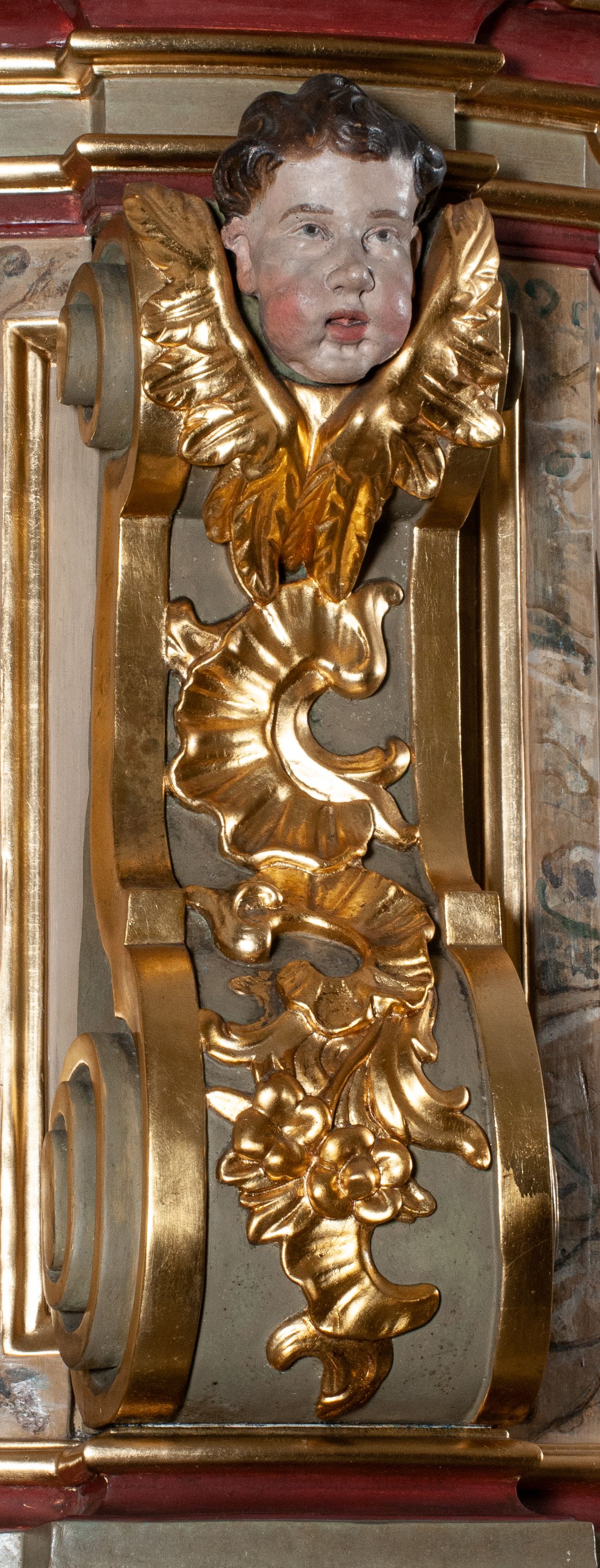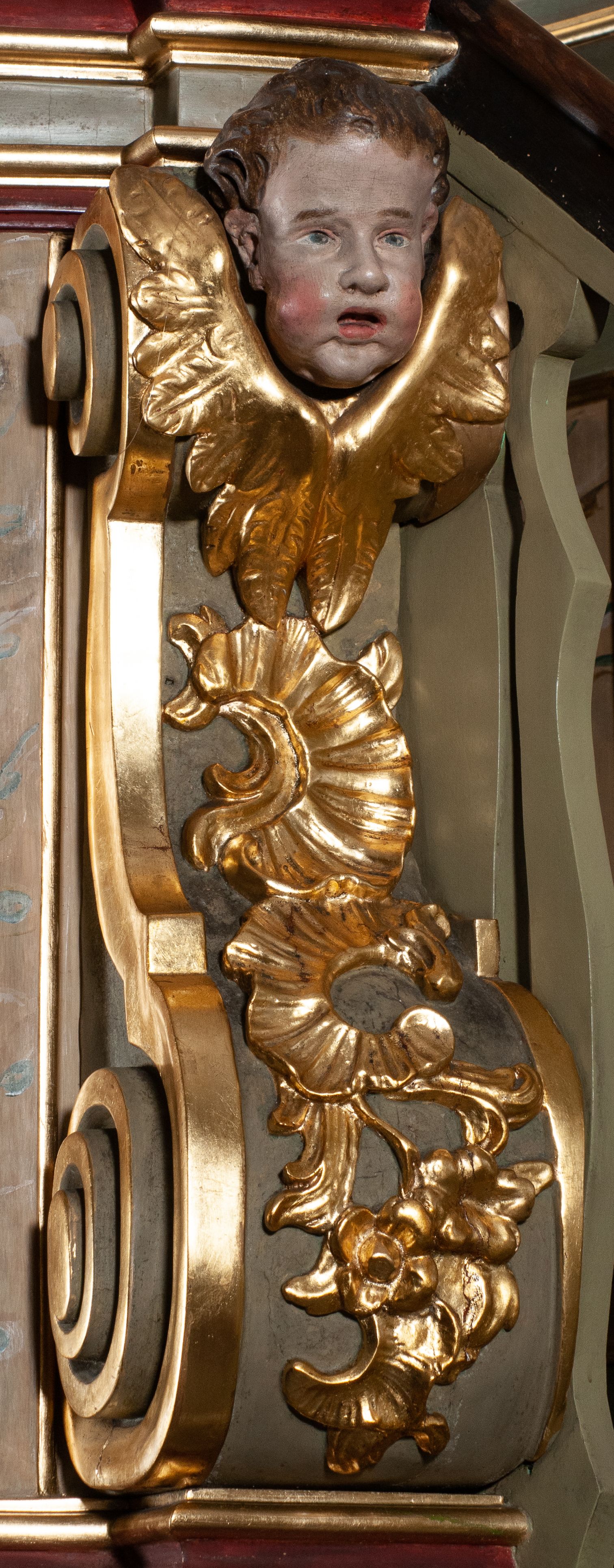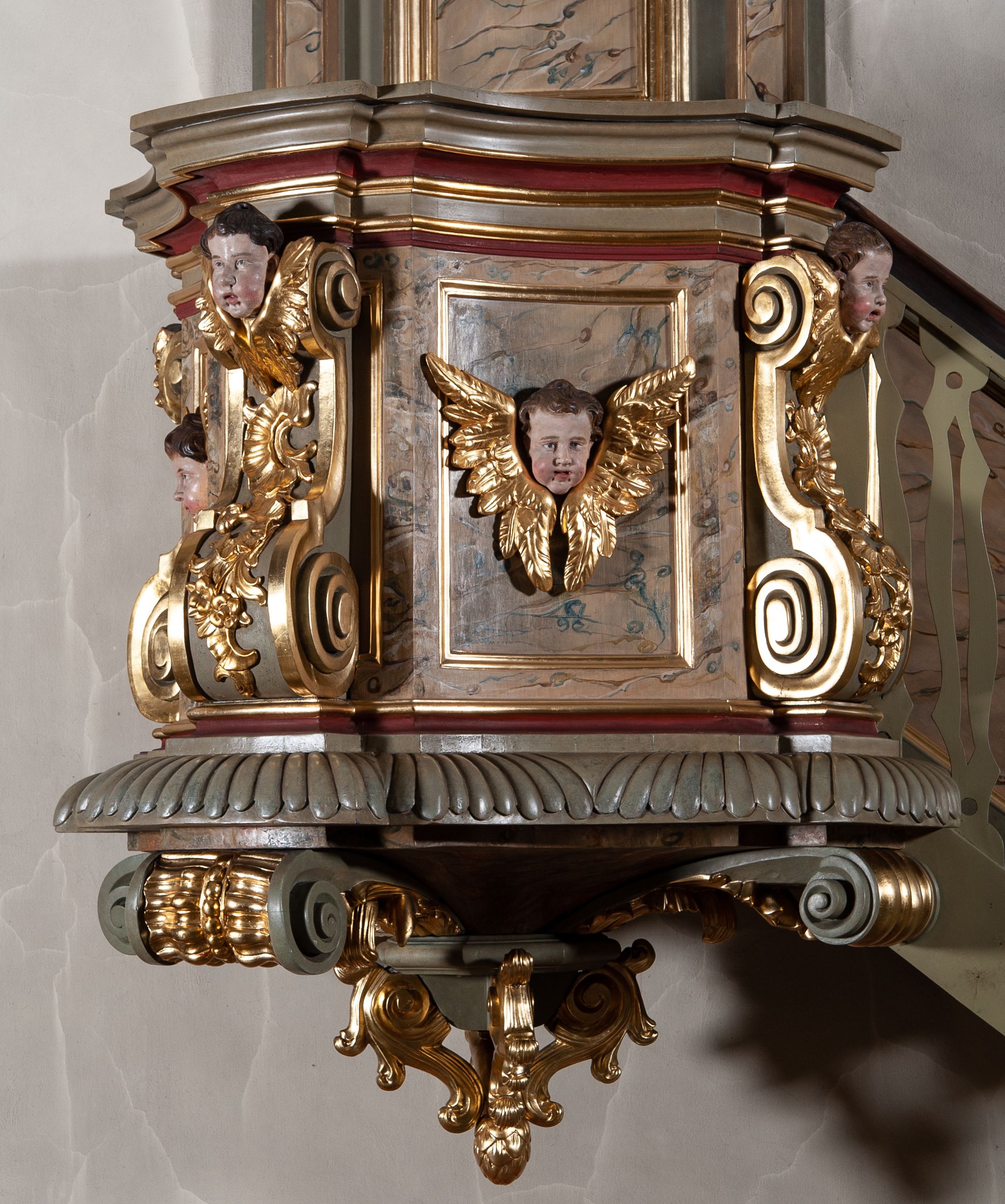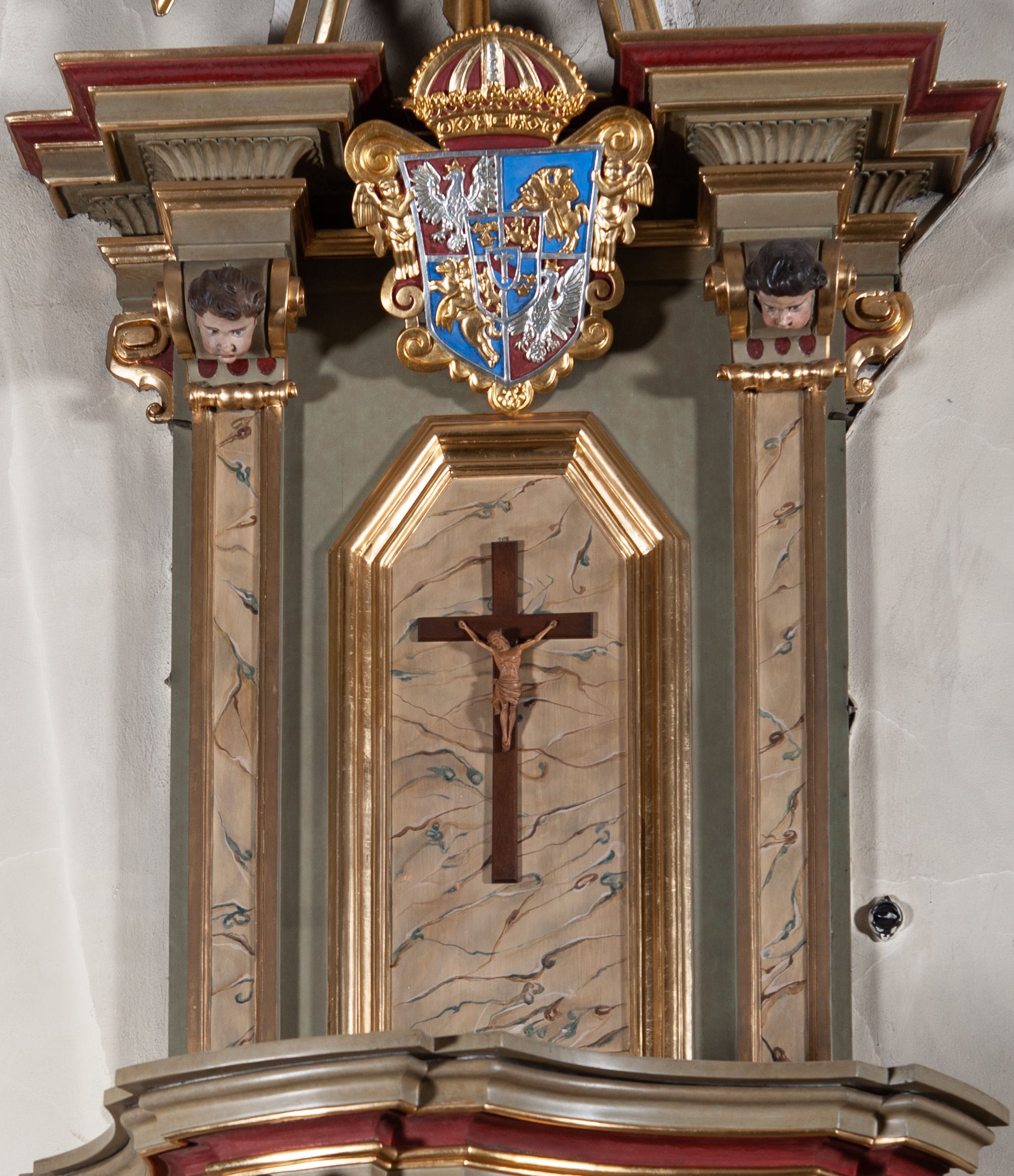 The pulpit was made in the second half of the 18th century. Its form, colour scheme and ornaments used indicate the influence of Rococo and Classicistic styles.
