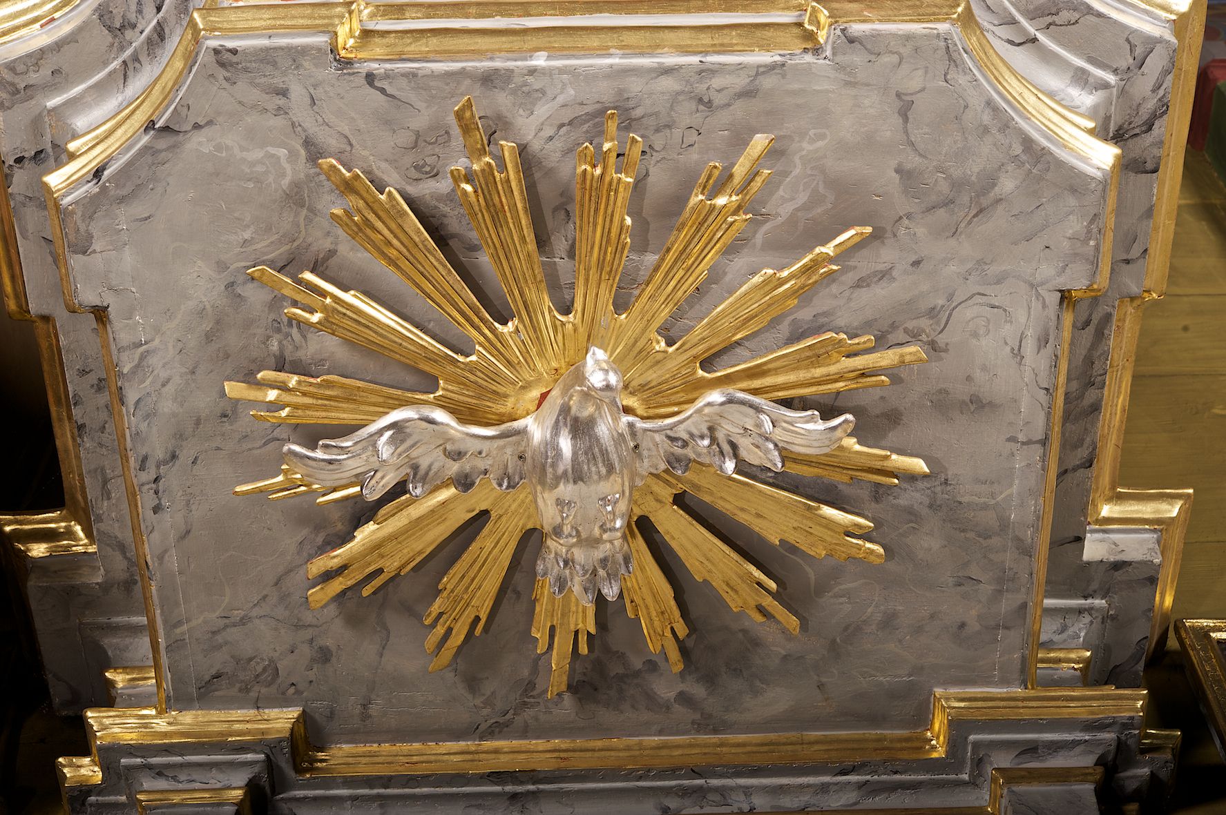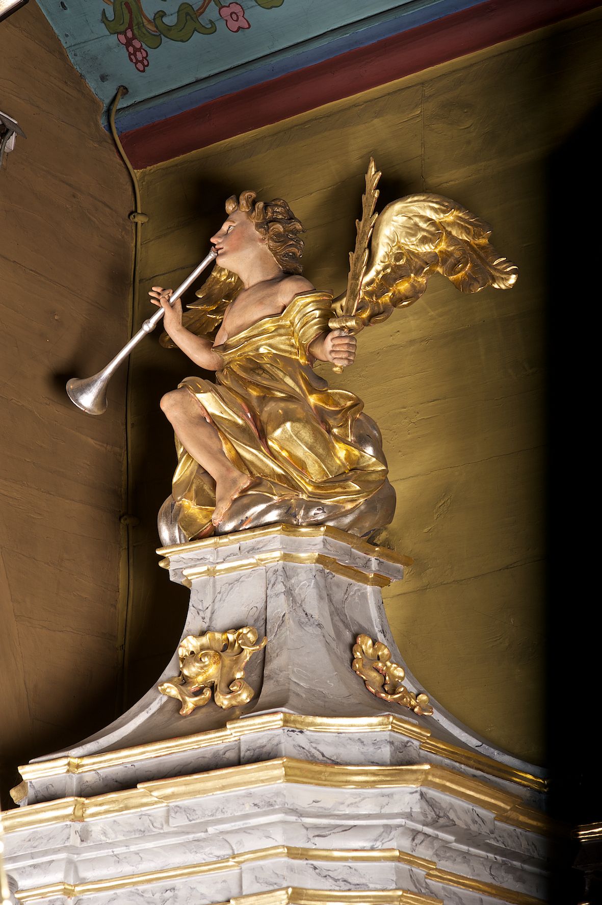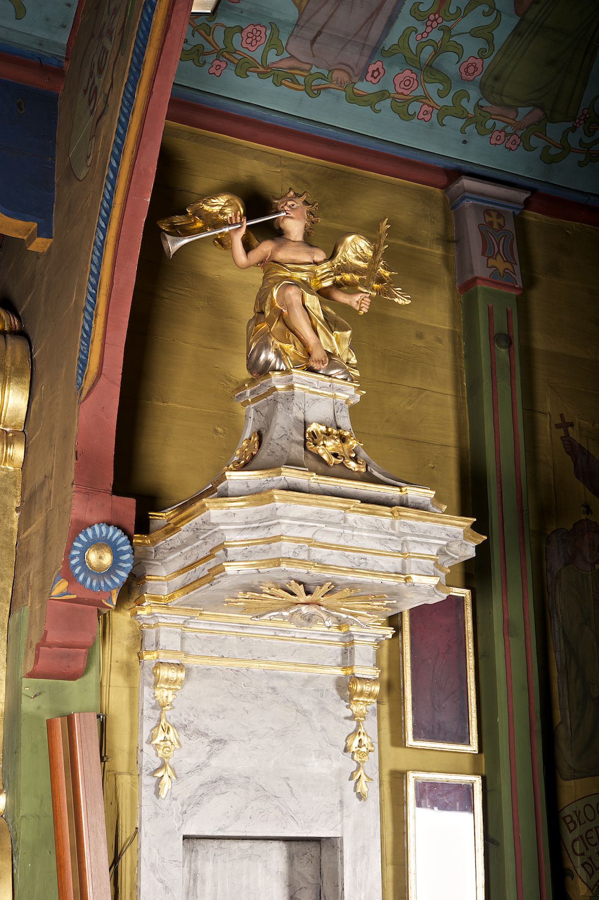 The pulpit of the church in Górka Kościelnicka was made between 1774 and 1796 and is an example of a rococo work. Its structure – a concave-convex form of the basket and the use of rocaille ornament are typical of pulpits created in that period.