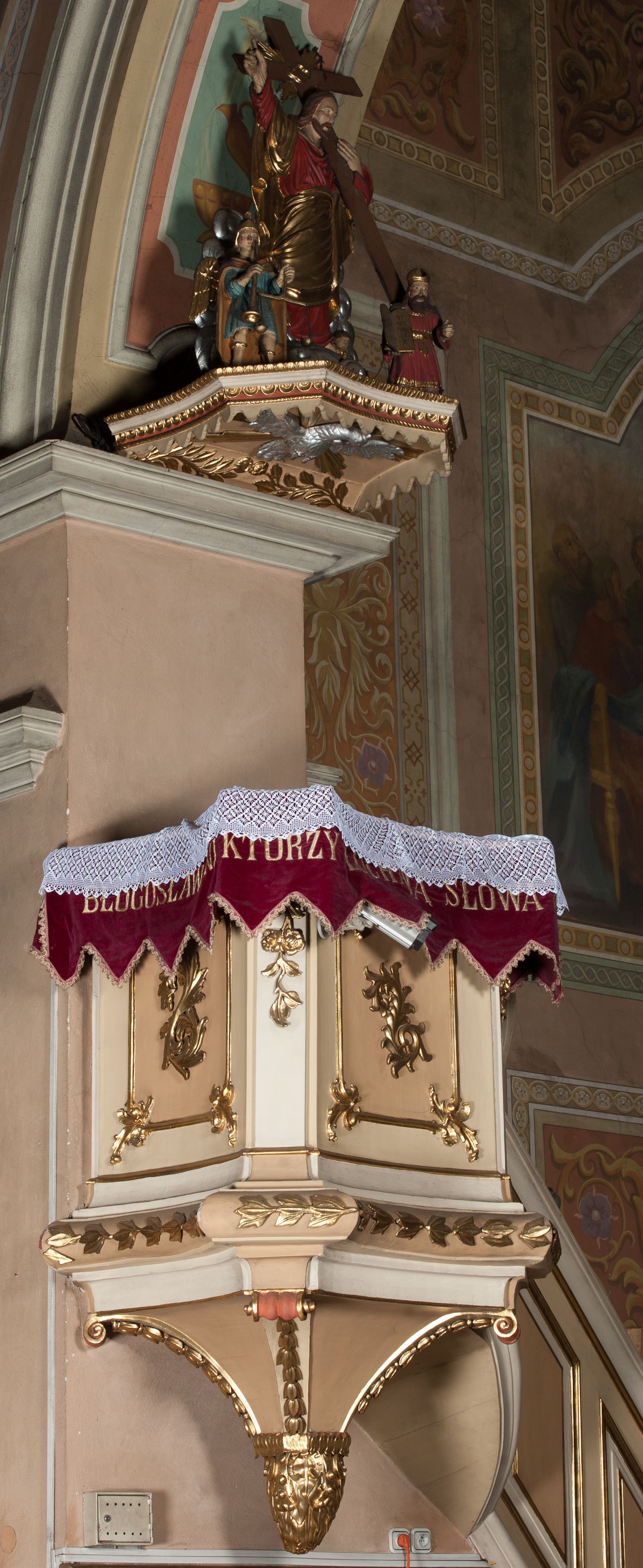 The pulpit was probably built in the second half of the 18th century. Probably in the 19th century, a new canopy with a sculptural group was installed to it.