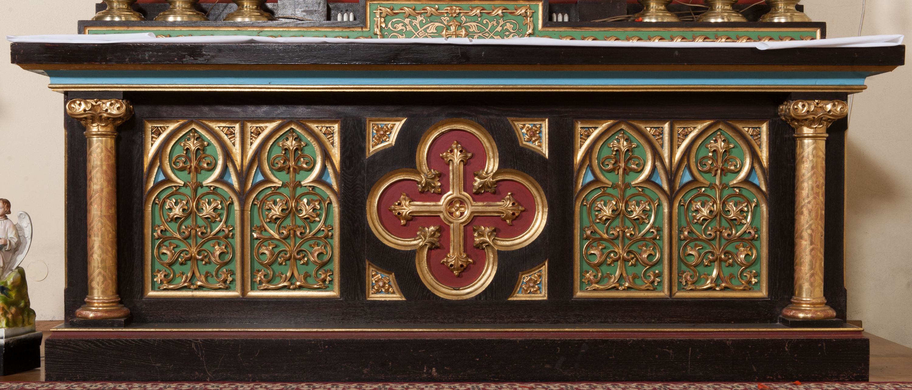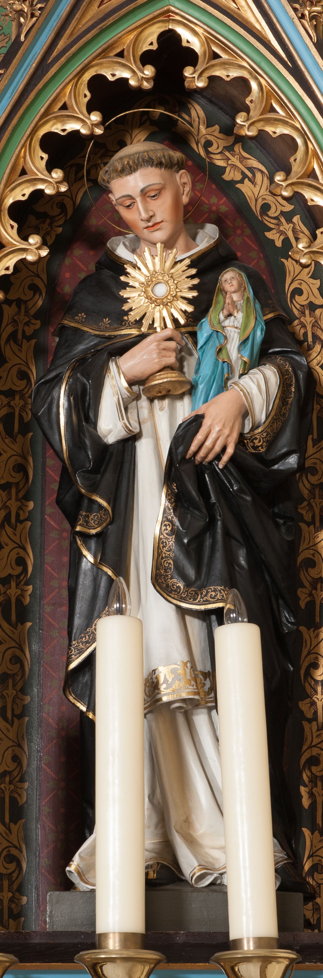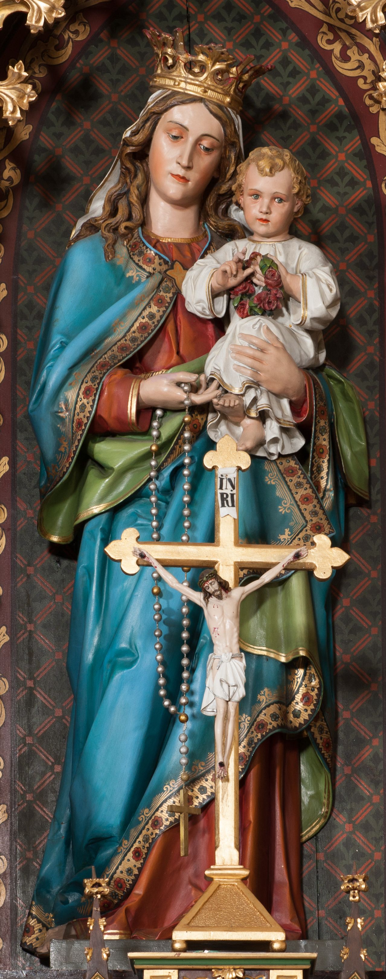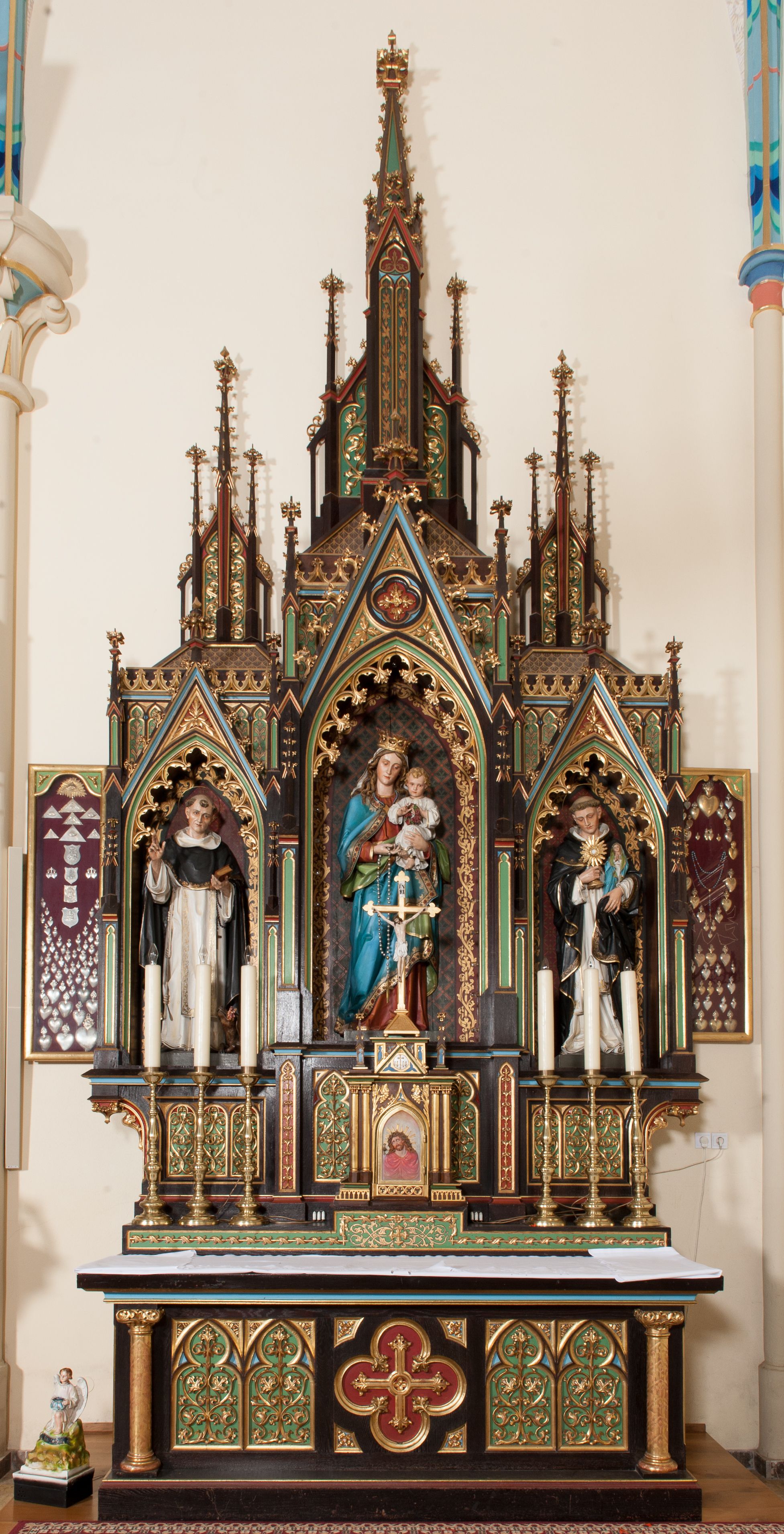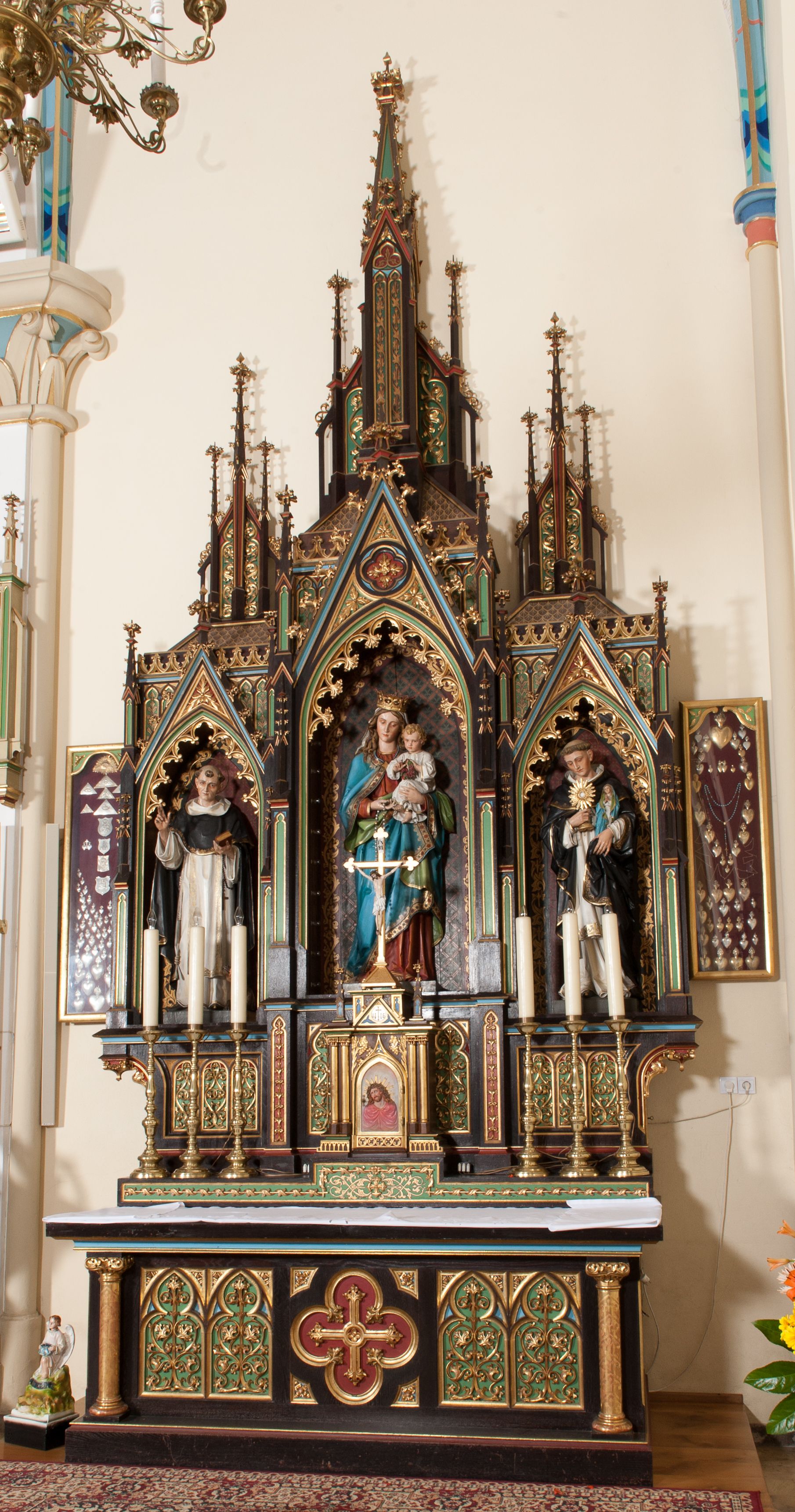 The side altar and the two remaining altars in the church in Krzeszów were commissioned and funded by father Michał Bochenek, the parish priest of the parish in Krzeszów in 1900-1945, right after the new temple of Our Lady of Perpetual Help was built in 1903, in the sculpture workshop of Tyrolean sculptor Ferdinand Stuflesser (1855-1926). Apart from the side altar, there are other works by this sculptor in the church, i.e. another side altar, the high altar with sculpture decoration and reliefs depicting stations of the cross. Ferdinand Stuflesser was running one of the leading sculpture workshops in Gröden that he founded in 1875. The altar was made in neo-gothic style. In the main alcove, there is a sculpture of Madonna and the Child, and on the sides there are two figures of Dominican saints : Saint Hyacinth and Saint Dominic.