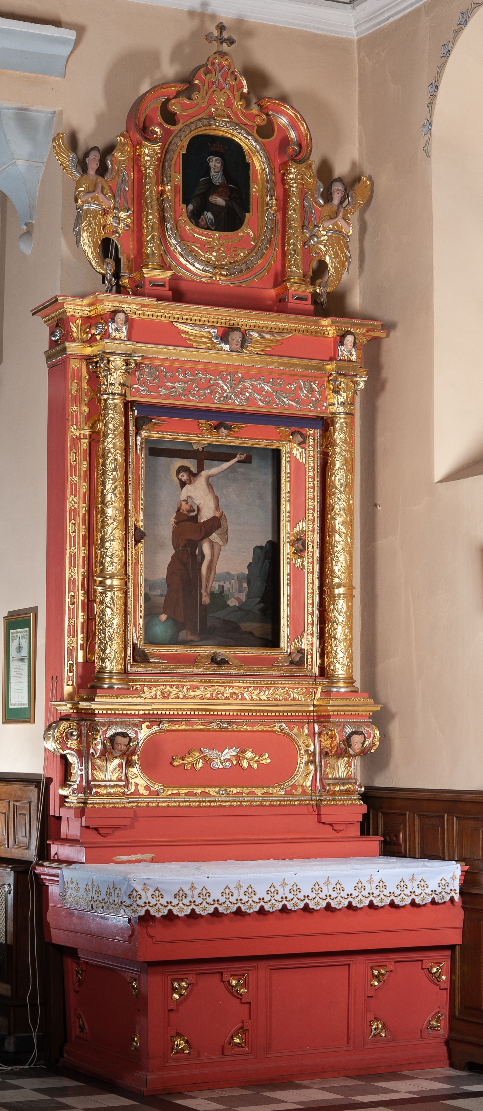 The right side altar of the church in Radziszów was built around the middle of the 17th century. It took shape of an aedicula, i.e., of a shrine or a niche framed within a pair of columns flanking the theme presentation and supporting the extensive altar finial.