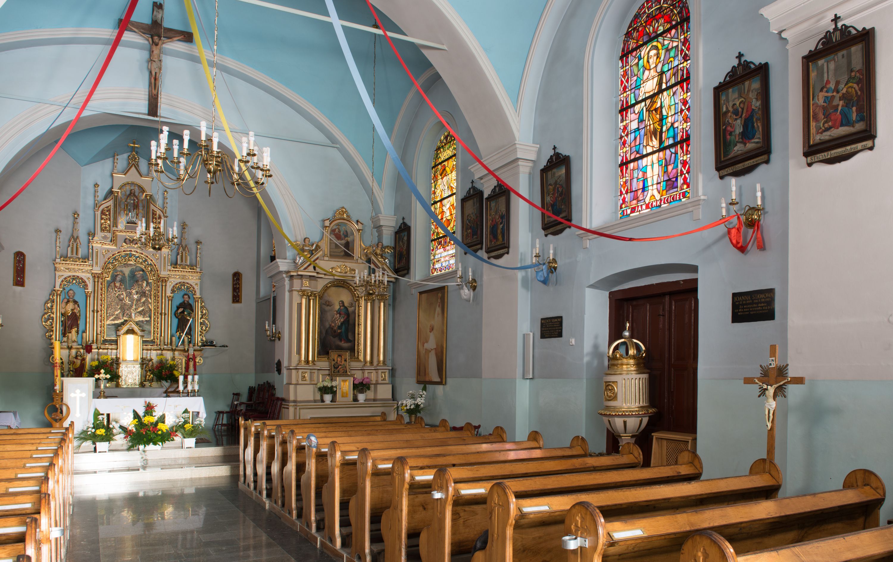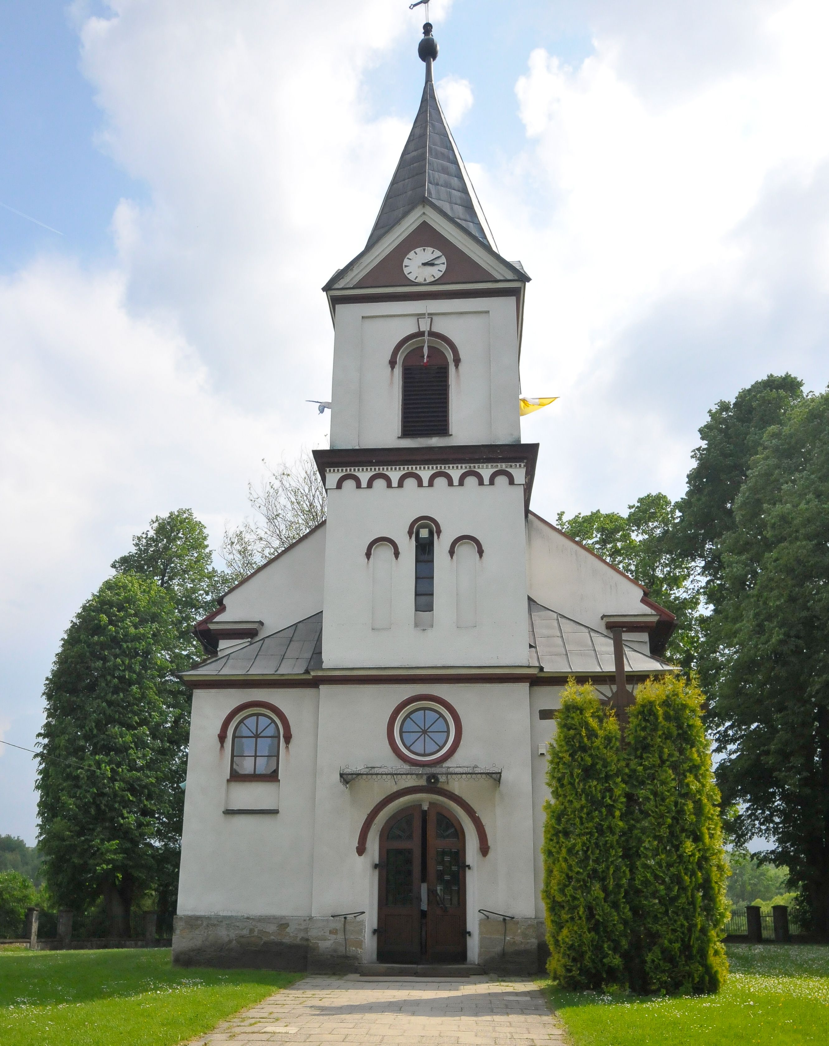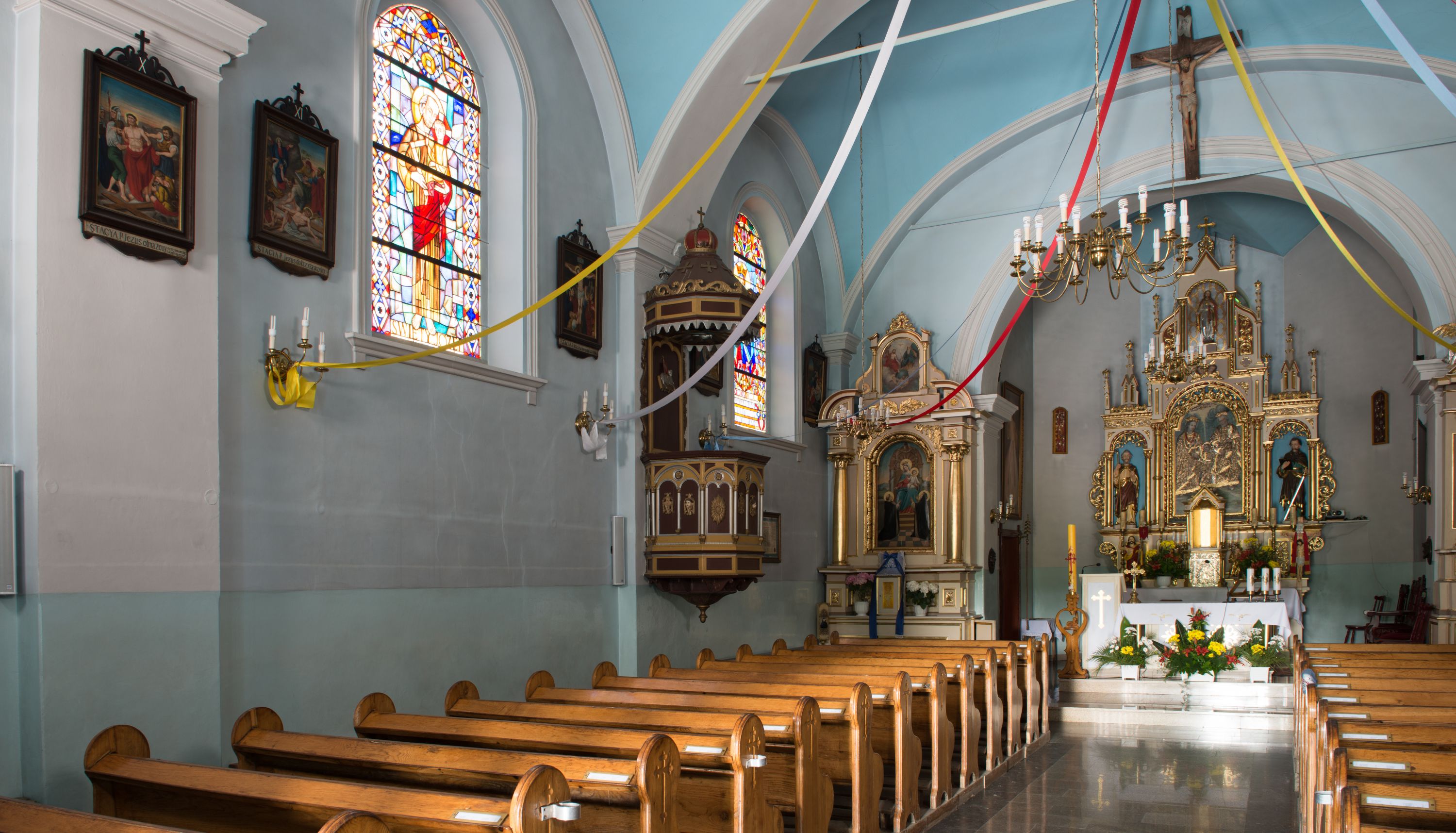 The parish in Łękawica was erected in 1908, shortly after the new church was built in 1902-1903. The temple was erected in the place of the masonry chapel from 1659, commissioned by Hieronim Przerębski. Józef Łepkowski mentions the Saint Adalbert chapel in Łękawica in 1863. Apparently, the chapel had been built to commemorate the saint bishop's stay in the area. The question of whether this was the same chapel, or what the more recent history of the church in Łękawica was require further investigation, since the history of the temple remains unknown. The new church was consecrated on June 16, 1910 by suffragan Anatol Nowak. The high altar was probably created soon after the temple was built. It was built in the eclectic style, with dominating neo-gothic and neo-renaissance elements. The two side altars can be also dated to this period. The painting of the Holy Family (from 1702) is located in the main area. The trapezoid painting of St. Rosalia, with its concave arms and lower corners, enclosed with a suspended arc, and contained inside a profiled and gilded frame, was brought from the old temple. The painting probably originated in the finial of one of the altar reredoses from the old church in Łękawica. From this church, the bilaterally painted antependium from 1702 with the Grabie blazon and the "FZ CR SR" initials and the Godziebma blazon with the "WZ RR SR 1702", as well the Our Lady of the Snows painting from 1785 were brought to the new temple. The baptismal font and the pulpit belong to the new church furnishing set which was created after the church was built. Among the interesting monuments mentioned in the Catalogue of Art Monuments are also a renaissance picture of St. Mary Magdalene on parchment, altar cross with the figure of Christ Crucified made of ivory created in the seventeenth century, as well as two baroque candle holders.
