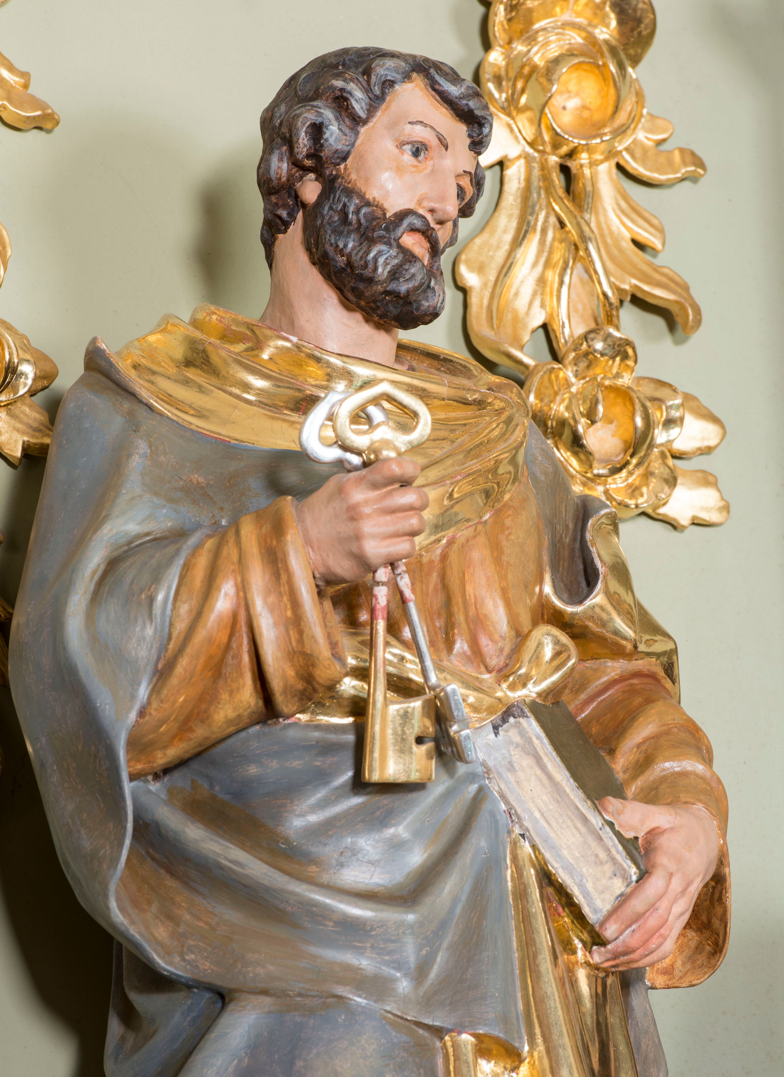 The sculpture of St. Peter was re-mounted on the high altar in place of the older one, which, together with other sculptures (according to the church inventory from the mid-20th century), was placed in the bellows room [on the tower] in numbers: 7 large, 7 medium, 3 small". St. Peter was portrayed in traditional iconographic depiction with the following attributes: two keys symbolising the power of the vicar of Christ and a book referring to an Apostolic Mission in which he took part.
