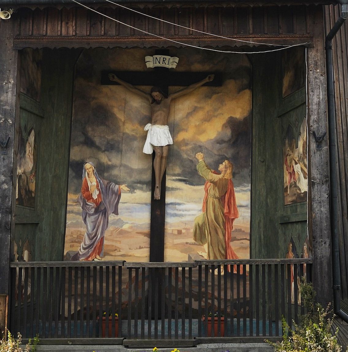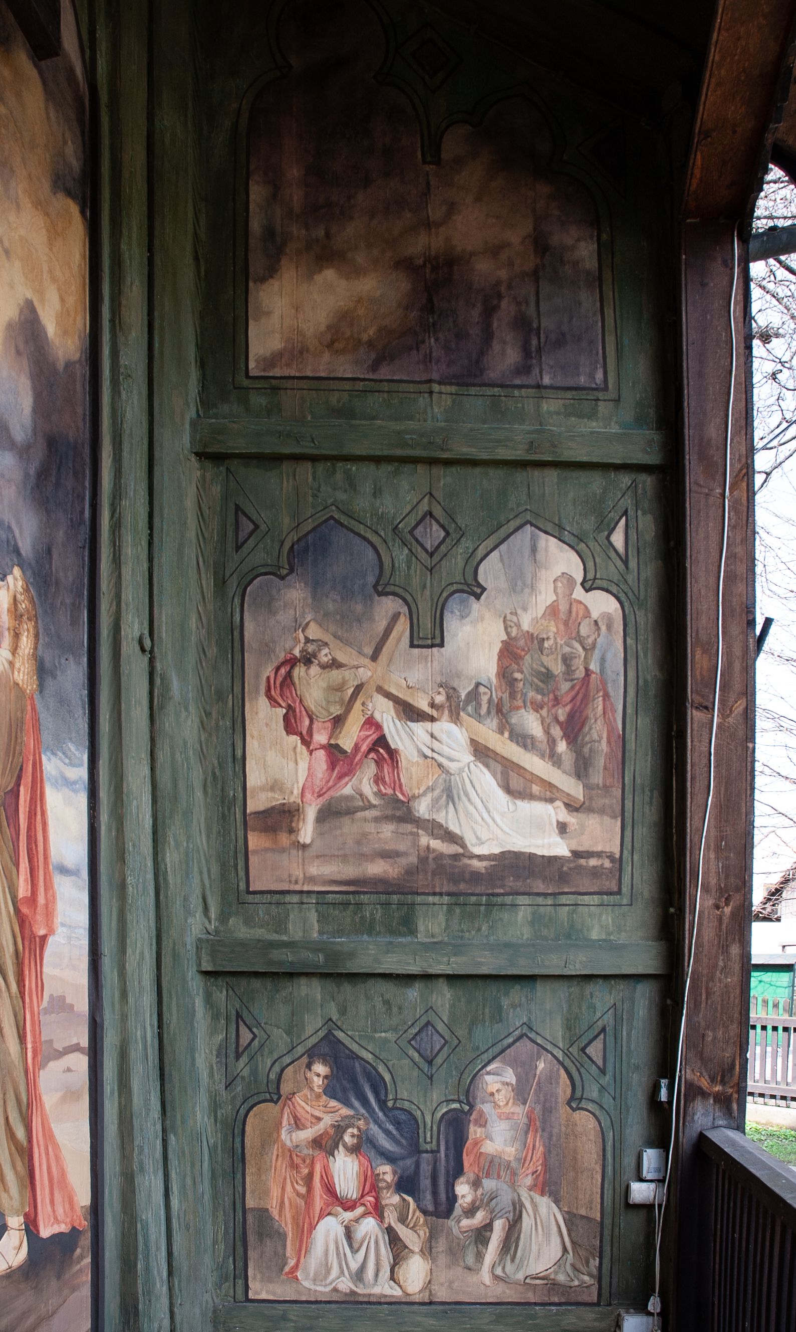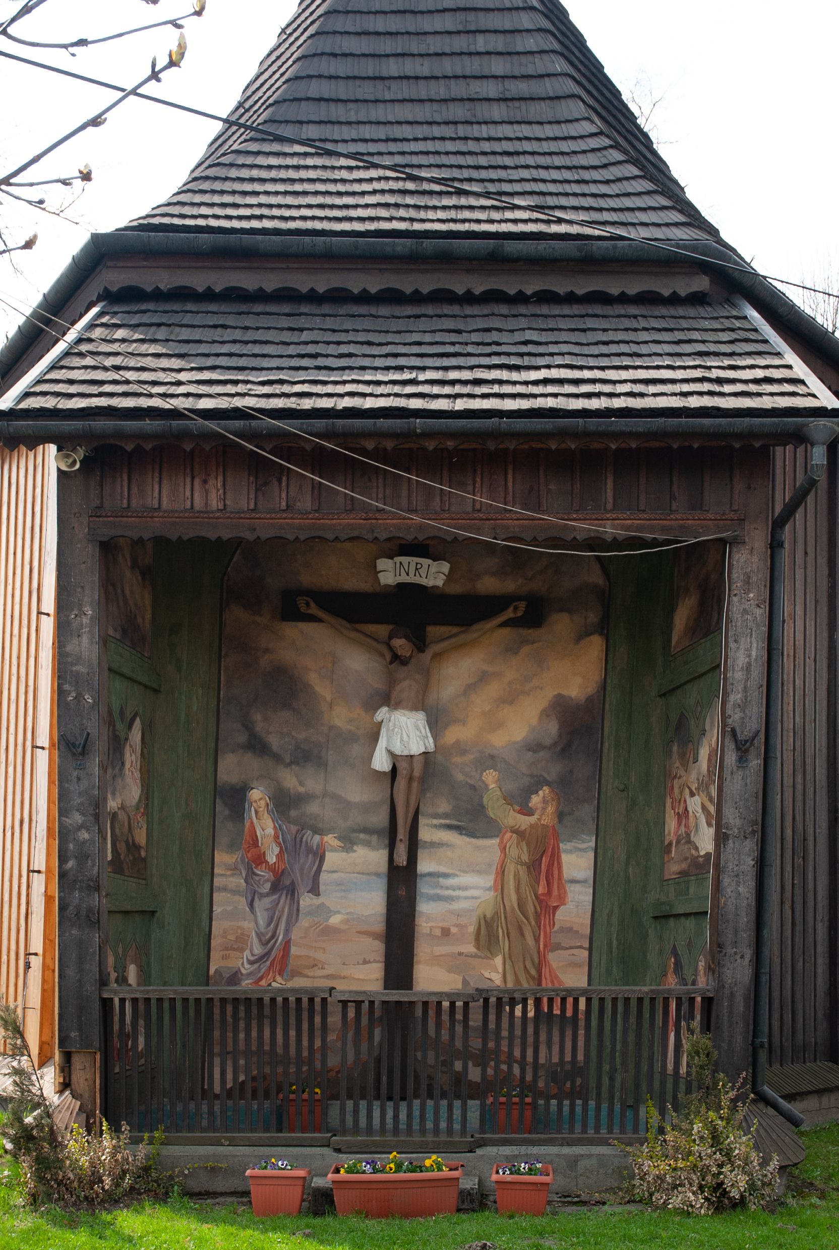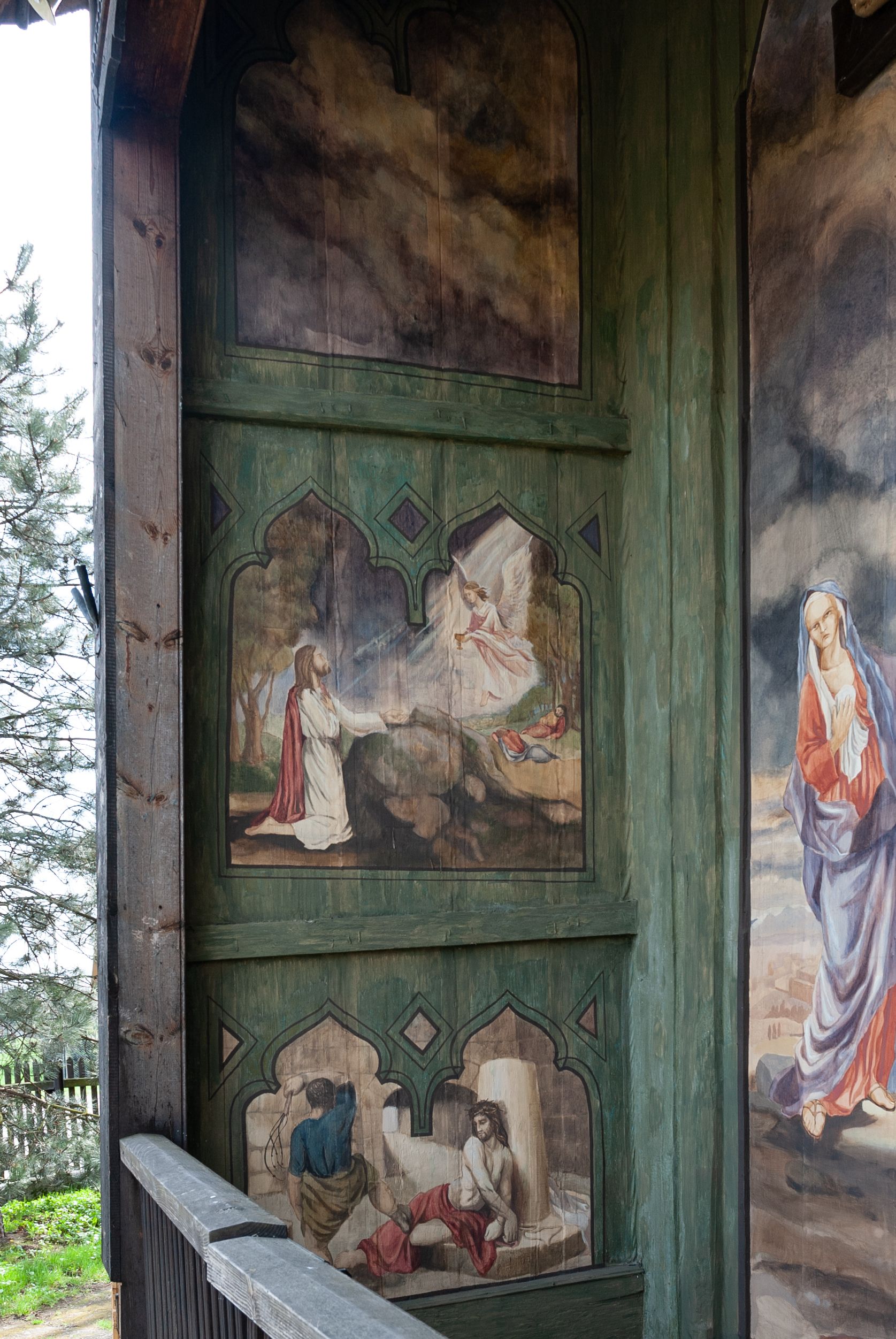 A garden with a 19th-century statue of the Christ Crucified, was decorated inside with a polychrome with scenes of the Passion of Christ, made by an unknown by first name Różecki of Kętka in April 1989. Thanks to the polychrome in the garden, a carved crucifix was set in a wider context. The depiction of Crucifixion with Mary and St. John – the main scene of the Passion whose series is located on the side walls of the garden, was created.