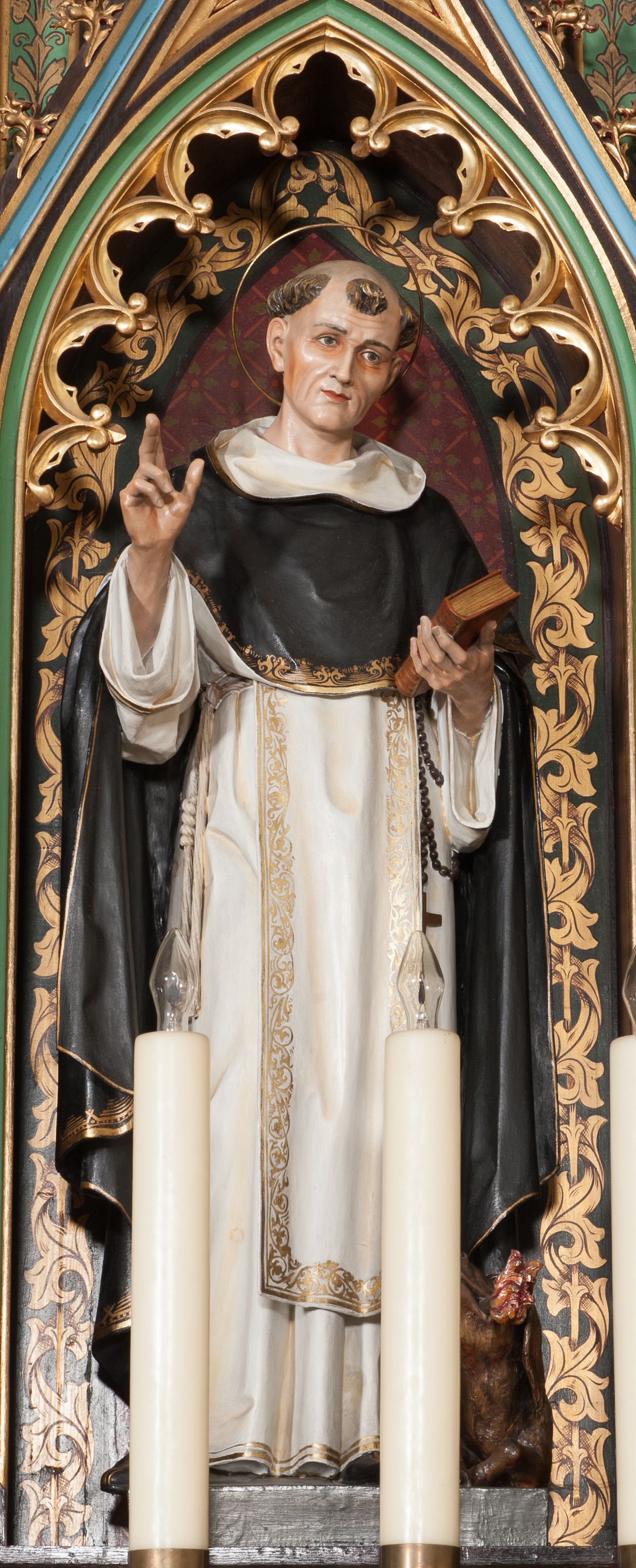 The sculpture of Saint Hyacinth along with the entire side altar was made for the newly-built church of Our Lady of Perpetual Help in Krzeszów around the year 1903 in the sculpture workshop of Tyrolean sculptor Ferdinand Stuflesser. The funder of the work was a parish priest of the parish in Krzeszów, father Michał Bochenek. Stuflesser depicted Dominic, a patron and founder of the order of Dominican friar in a typical iconographic tradition: a habit and a Dominican coat with a dog by his side that is a symbol of the order (Domini canes - Dogs of the Lord, i.e. faithful servants).
