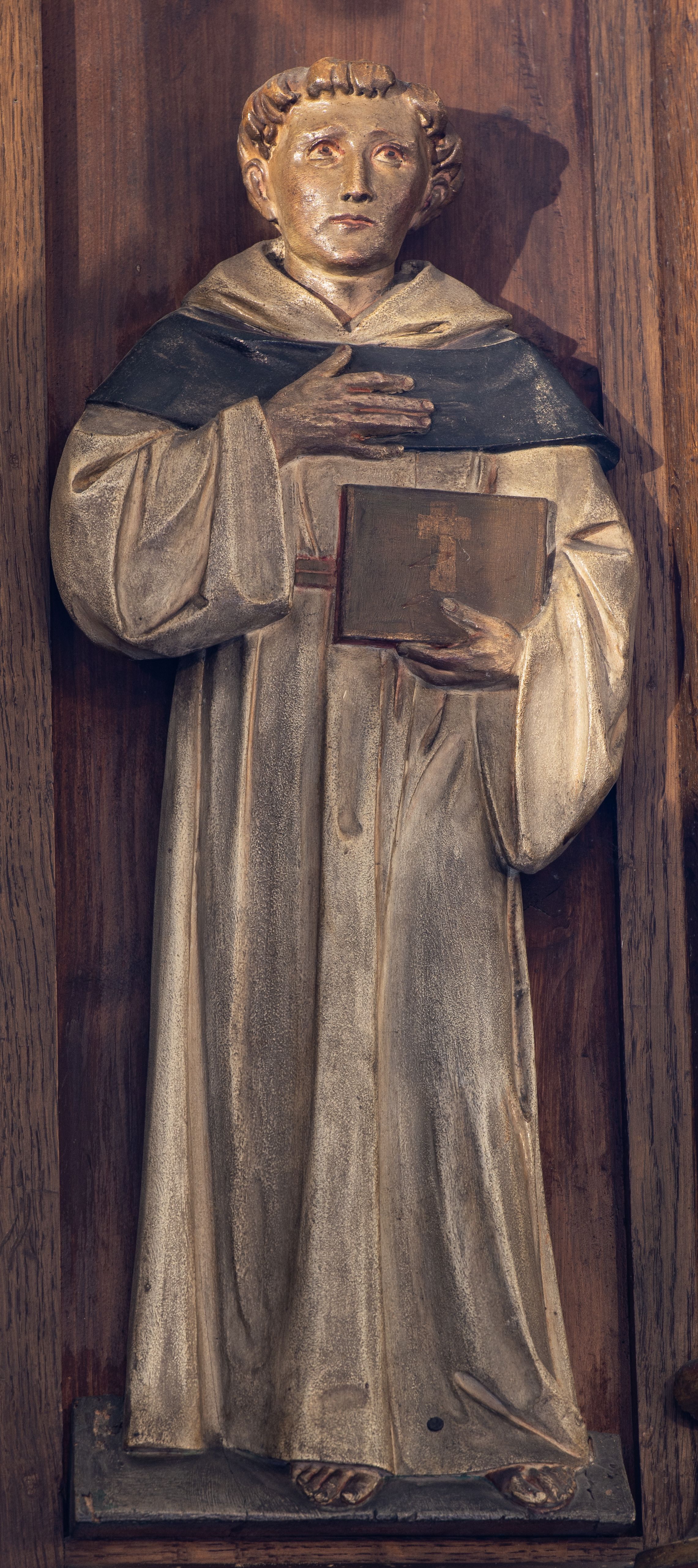 The sculpture of St. Hyacinth of Poland, along with the whole high altar, was created in the Cracovian sculpture workshop of Władysław Druciak in 1914. His works are described as an example of historicism in sacred sculpture of the early 20th century. St. Hyacinth of Poland studied in Italy, where he received Dominican habit from St. Dominic. He died in 1257 and was buried in the Dominican Church in Cracow.