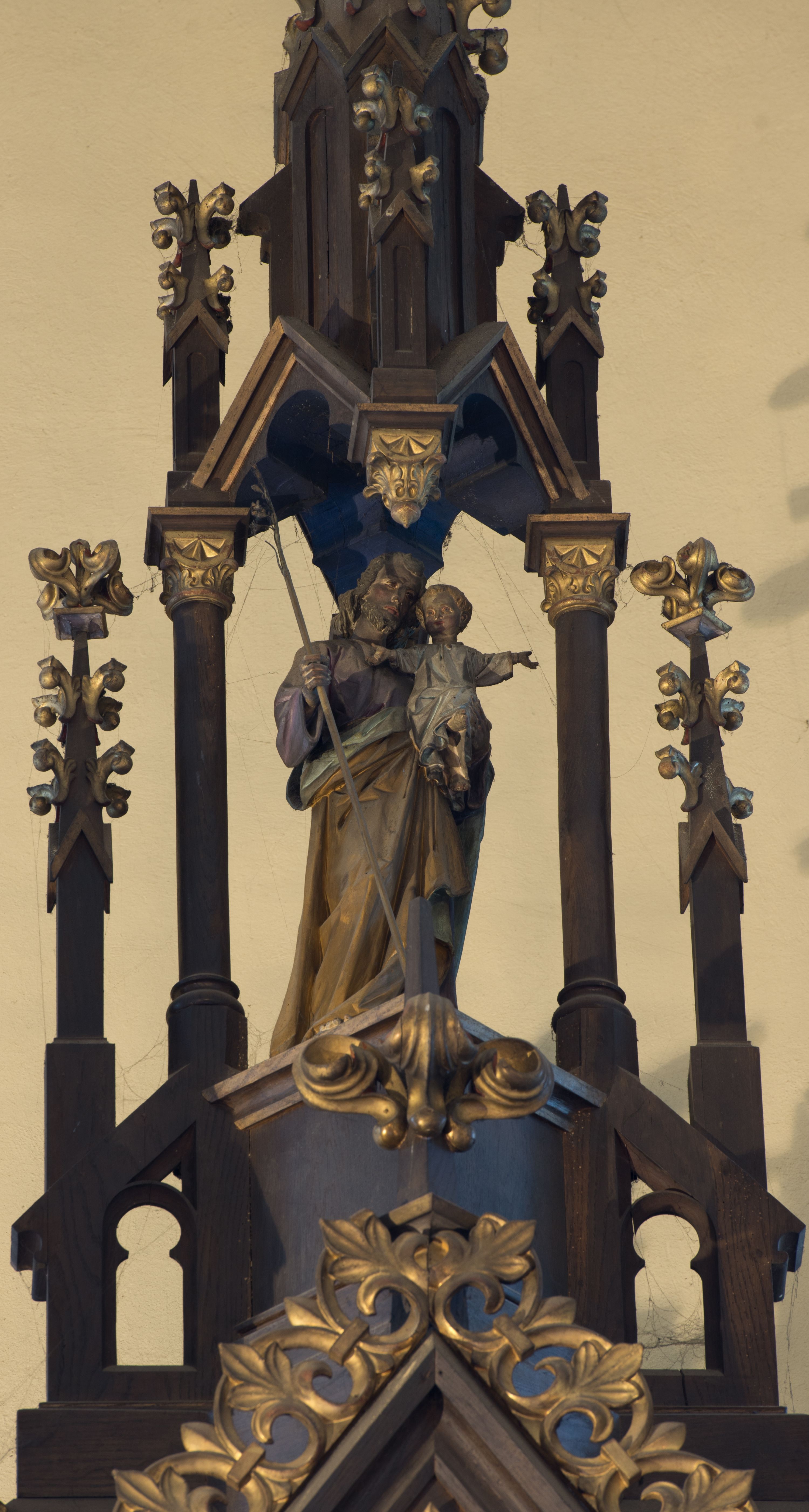 The sculpture of St. Joseph, along with the whole high altar, was created in the Cracovian sculpture workshop of Władysław Druciak in 1914. His works are described as an example of historicism in sacred sculpture of the early 20th century. Saint Joseph has been depicted in a traditional iconographic convention, i.e. with Baby Jesus in his arms, intended to show him as a guardian and protector of the Son of God, as well as with a white lily in his hand, a symbol of chastity.