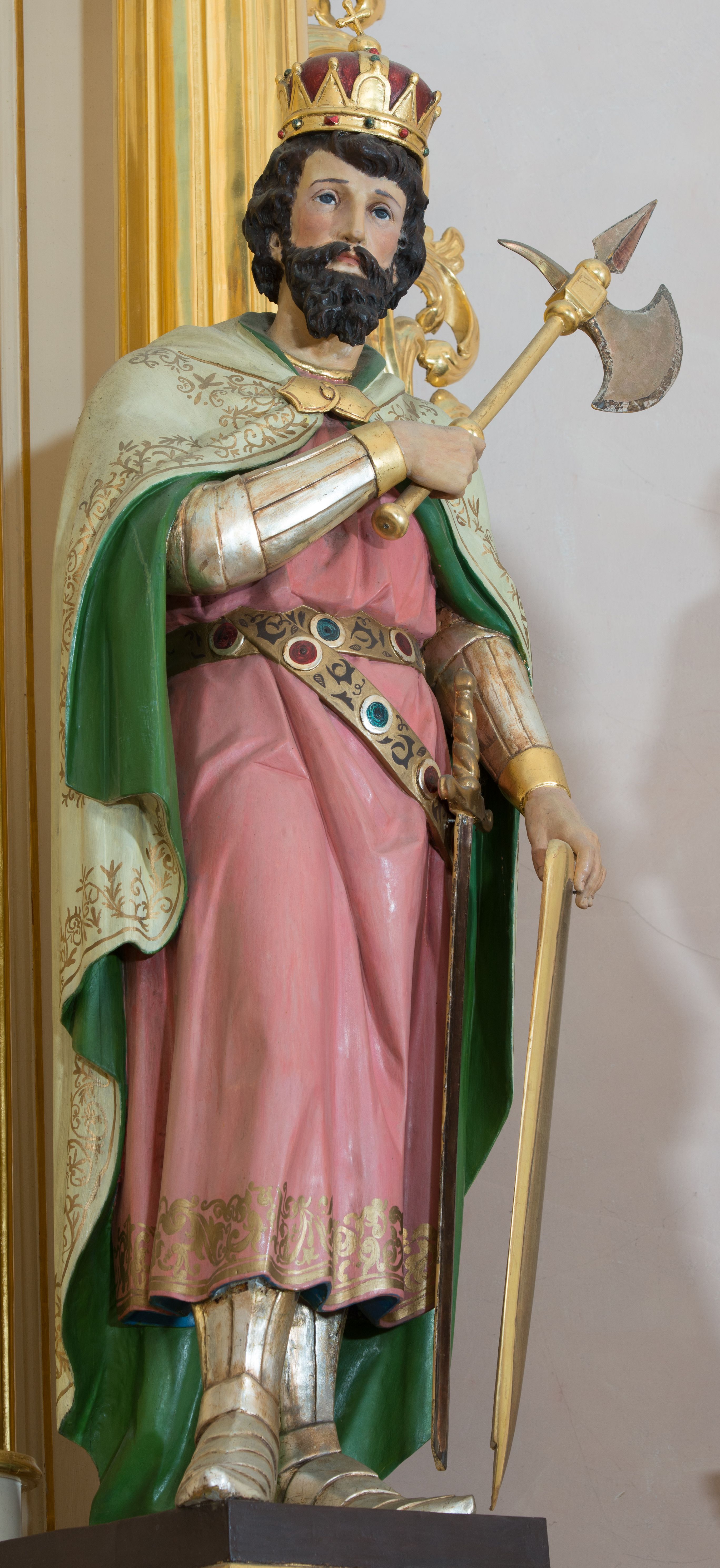 Unfortunately, research on furnishings of the church in Podwilk carried out so far, due to lack of archival records on the constructors, does not even try to determine a circle of potential authors of the reredoses and its sculptural decor. St. Ladislaus lived in the 11th century. He was a son of King Béla I of Hungary and the daughter of Mieszko II. He ascended to the Hungarian throne in 1077. He was famous for a saintly life and he was very popular among the subjects. He is the patron of Hungary. In iconography he is presented covered in armour and with the royal insignia. The sculpture presents formal characteristics close to works from the second half of the 19th century and the early 20th century.