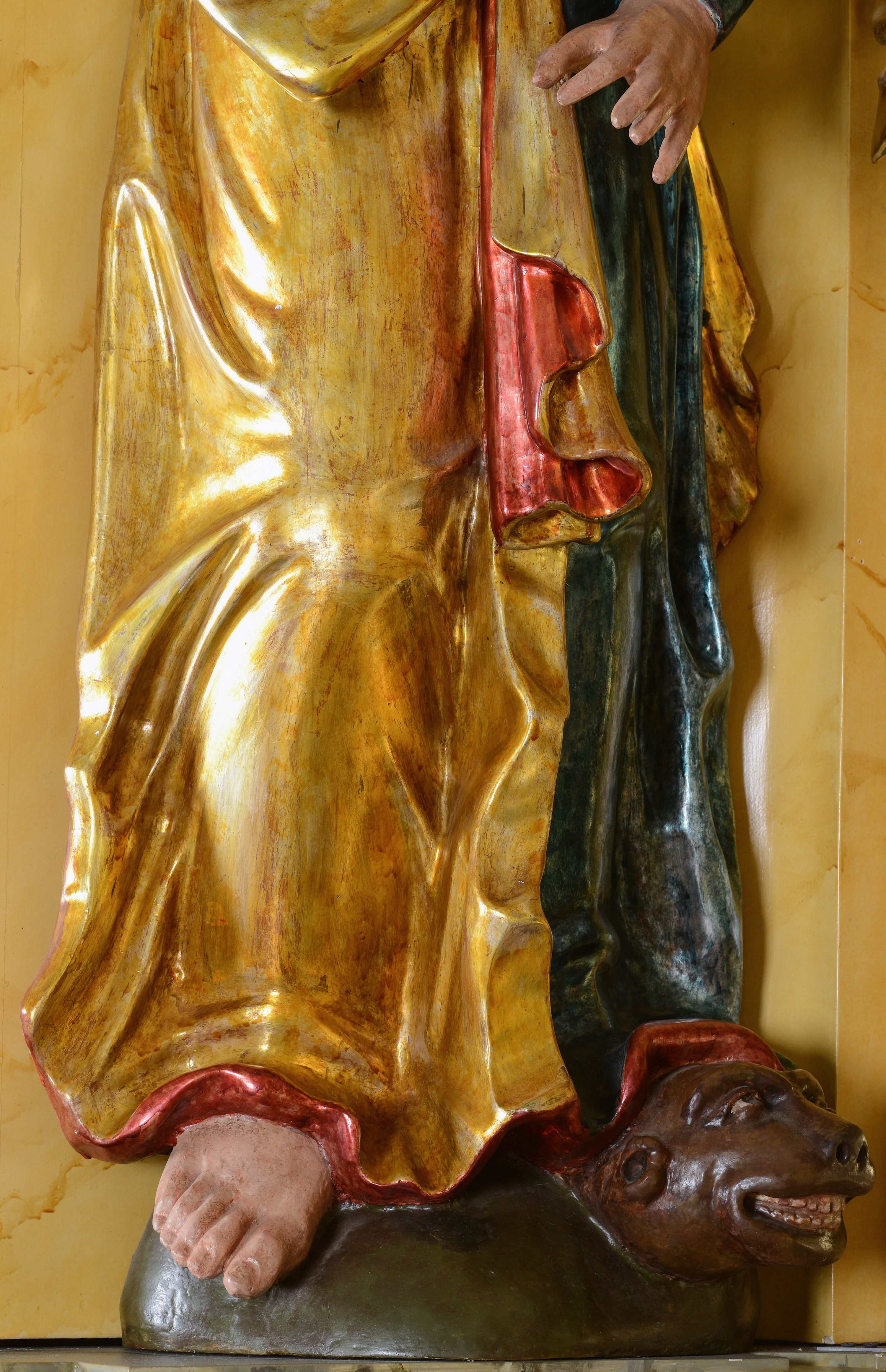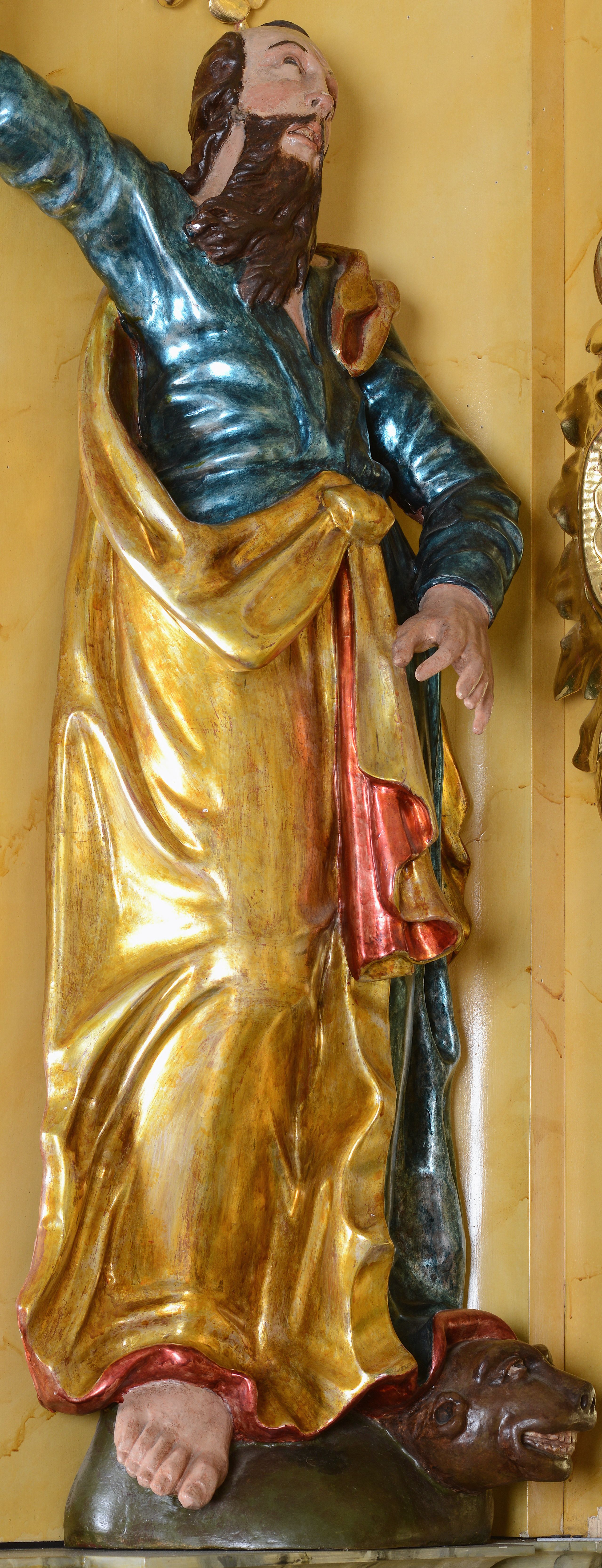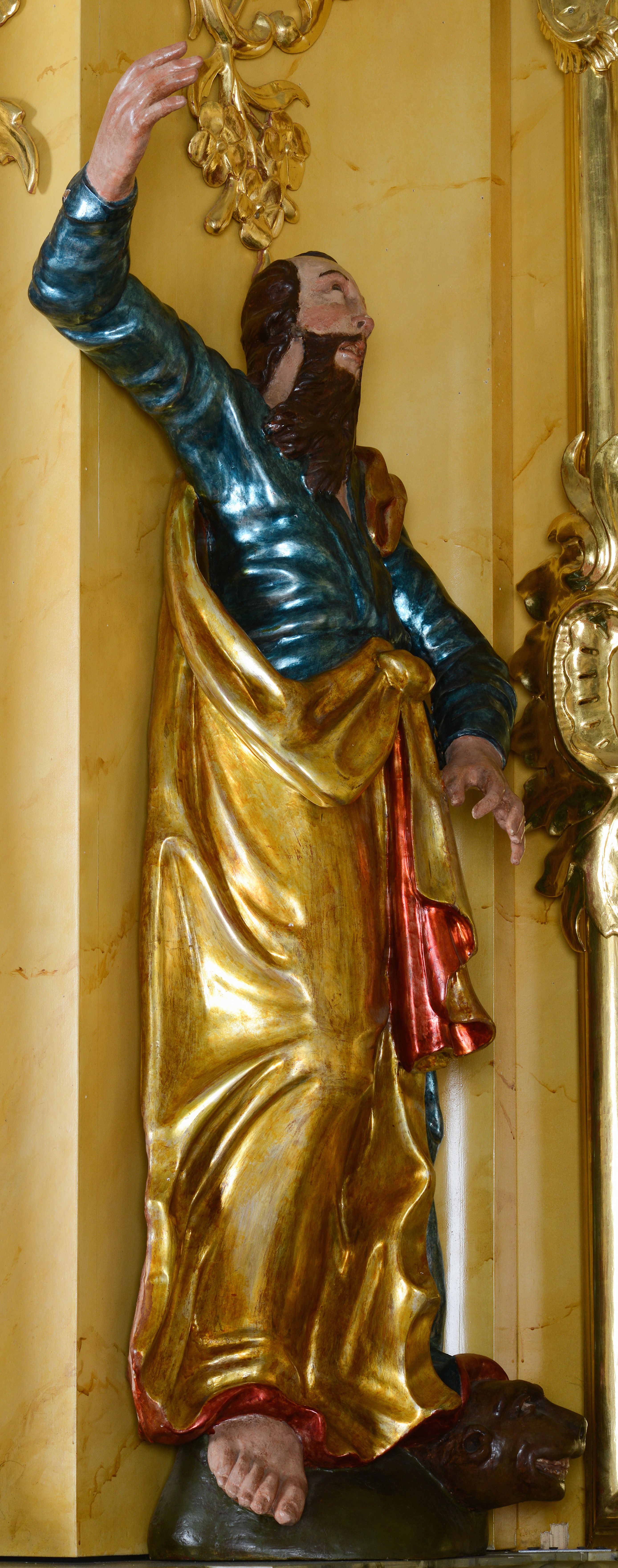 Unfortunately, research on furnishings of the St. Martin's church carried out so far, due to lack of archival records on the constructors, does not even try to determine a circle of potential authors of the reredoses and its sculptural decor. The sculpture was made in the second half of the 18th century and it depicts St. Marcus, who was cousin to St. Barnabas. St. Marcus accompanied St. Paul and St. Barnabas in their missionary journeys. He was not Christ's disciple, and he wrote the Gospel on the basis of the teaching of St. Peter the Apostle. According to tradition he died a martyr's death as the bishop of Alexandria, circa 74.