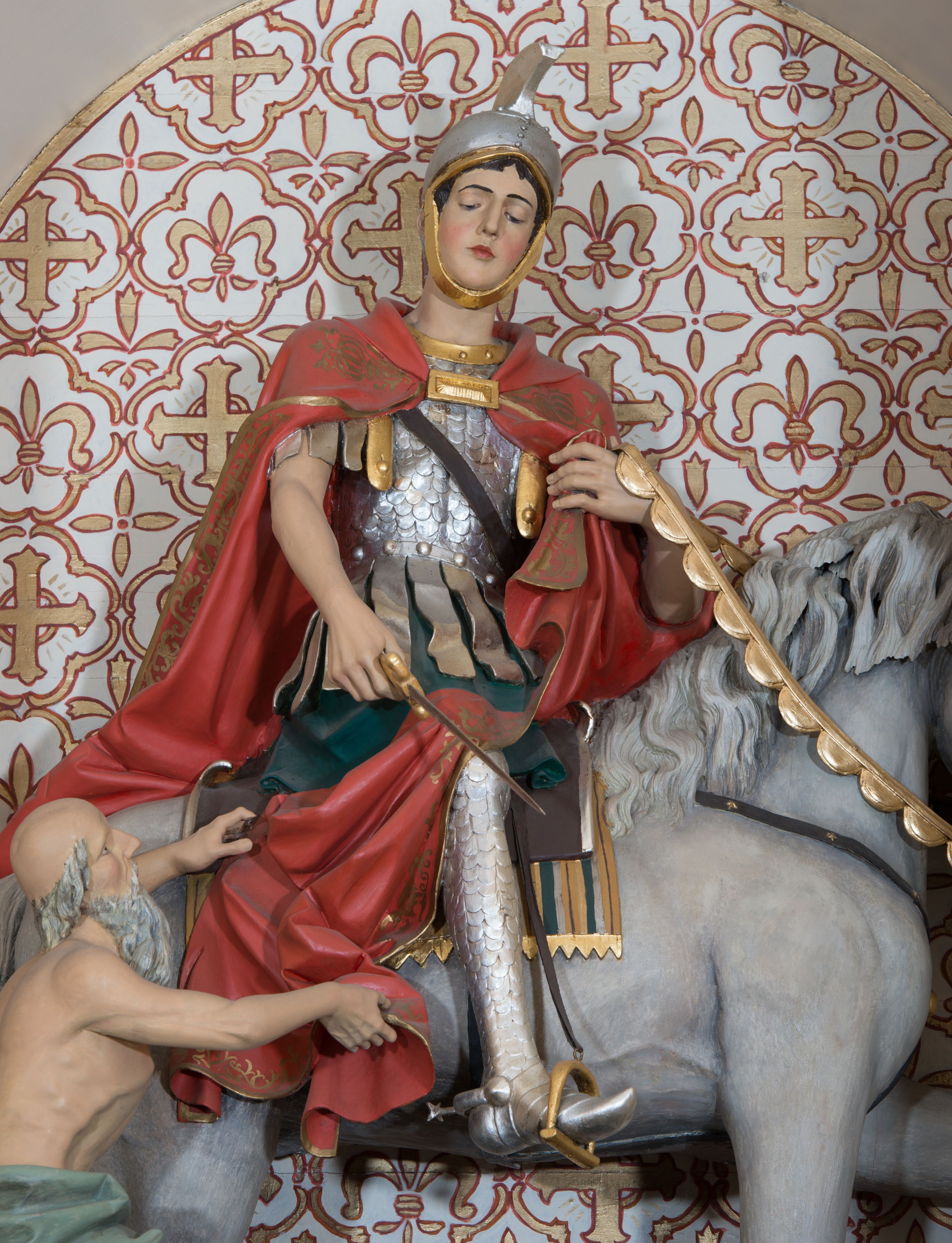 Sculpture of St. Martin was made in the second half of the 19th century or in the early 20th century. It represents St. Martin who letft the army of Constantine in Gaul and became a disciple of Hilary of Poitiers in 356. According to legend, he was to share his coat with the poor, which is why he is often depicted in iconography as a soldier sitting on a horse and cutting his coat with a sword for the poor.