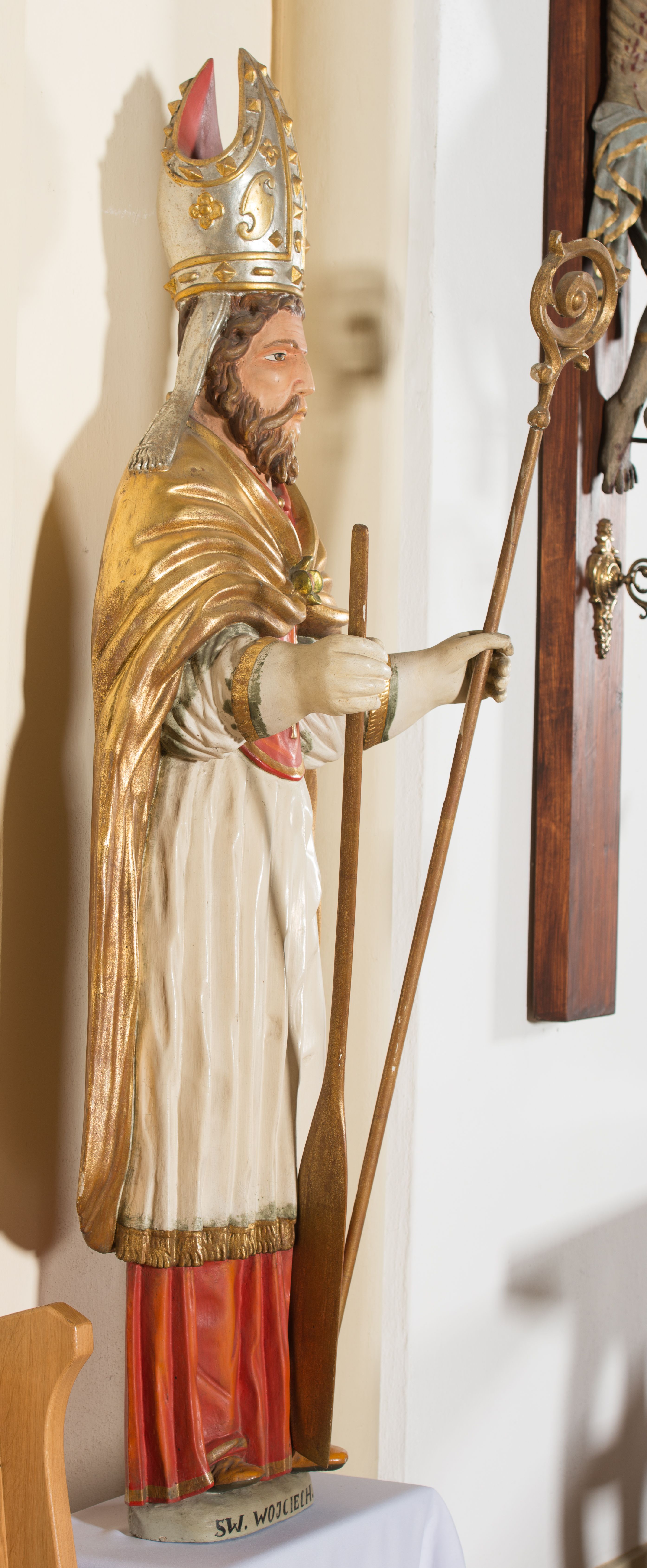 The Sculptor of Saint Adalbert was made by an anonymous artist in the first half of 17th century, after 1615, and then it was placed on the high altar in the church of Saint Catherine in Krzeszów that was built in 1613-1615 under the foundation of Piotr Komorowski. The sculpture was moved from the old church to the new one, built in the period of 1901-1903. It depicts Saint Adalbert that lived from 956 to 997. He was a bishop of Prague from 983. In 997, he set off to Poland and then to Prussia in order to convert pagans. He suffered a martyr's death, probably pierced with spears. The body of the saint was bought out and buried in Gniezno by the prince Bolesław Chrobry.