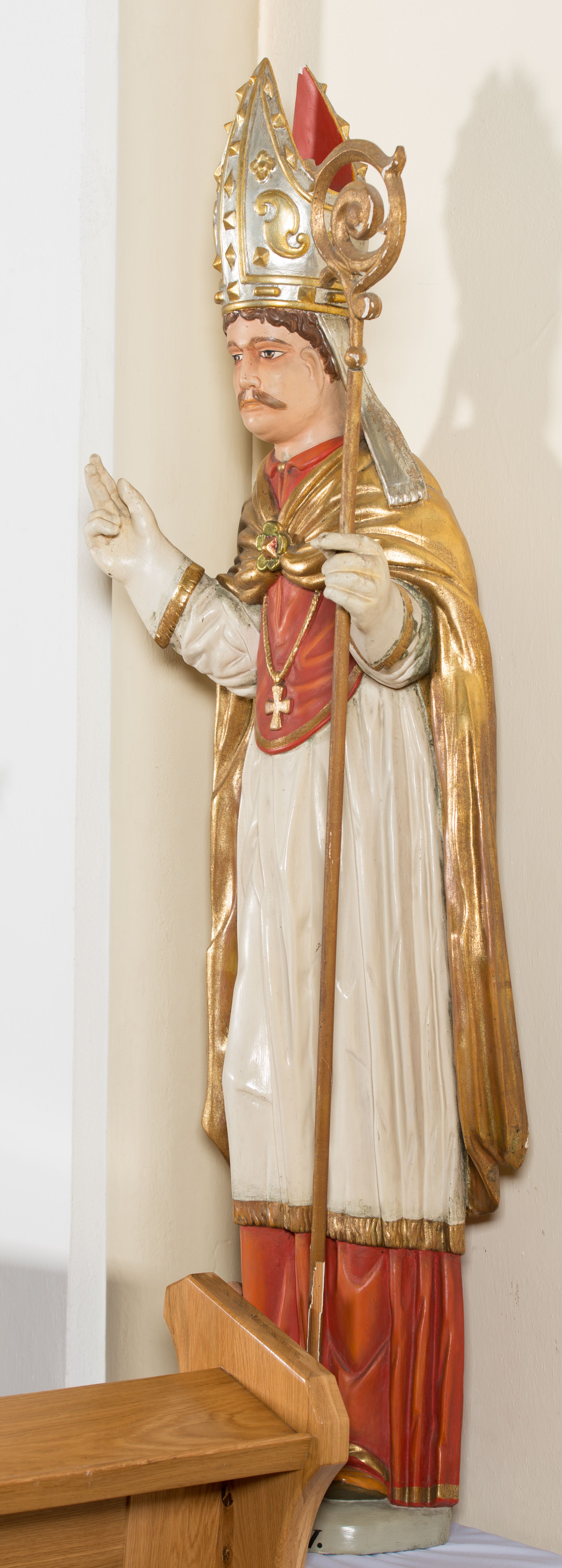 The sculpture of Saint Adalbert was made by an anonymous artist in the first half of 17th century, after 1615, and then it was placed on the high altar in the church of Saint Catherine in Krzeszów that was built in 1613-1615 under the foundation of Piotr Komorowski. The sculpture was moved from the old church to the new one, built in the period of 1901-1903. It depicts Saint Stanislaus who was born around 1030 in Szczepanów. Due to a conflict with king Bolesław II the Generous, he was murdered by the king's order in 1079 during a Mass in the Church of St. Michael on Skałka. He was a Bishop of Cracow and a martyr. He is one of the main patrons of Poland. In the work in question, at St. Stanislaus' feet there is a sculpture of Piotrowin, which refers to the legend of the resurrection of the deceased by the bishop.