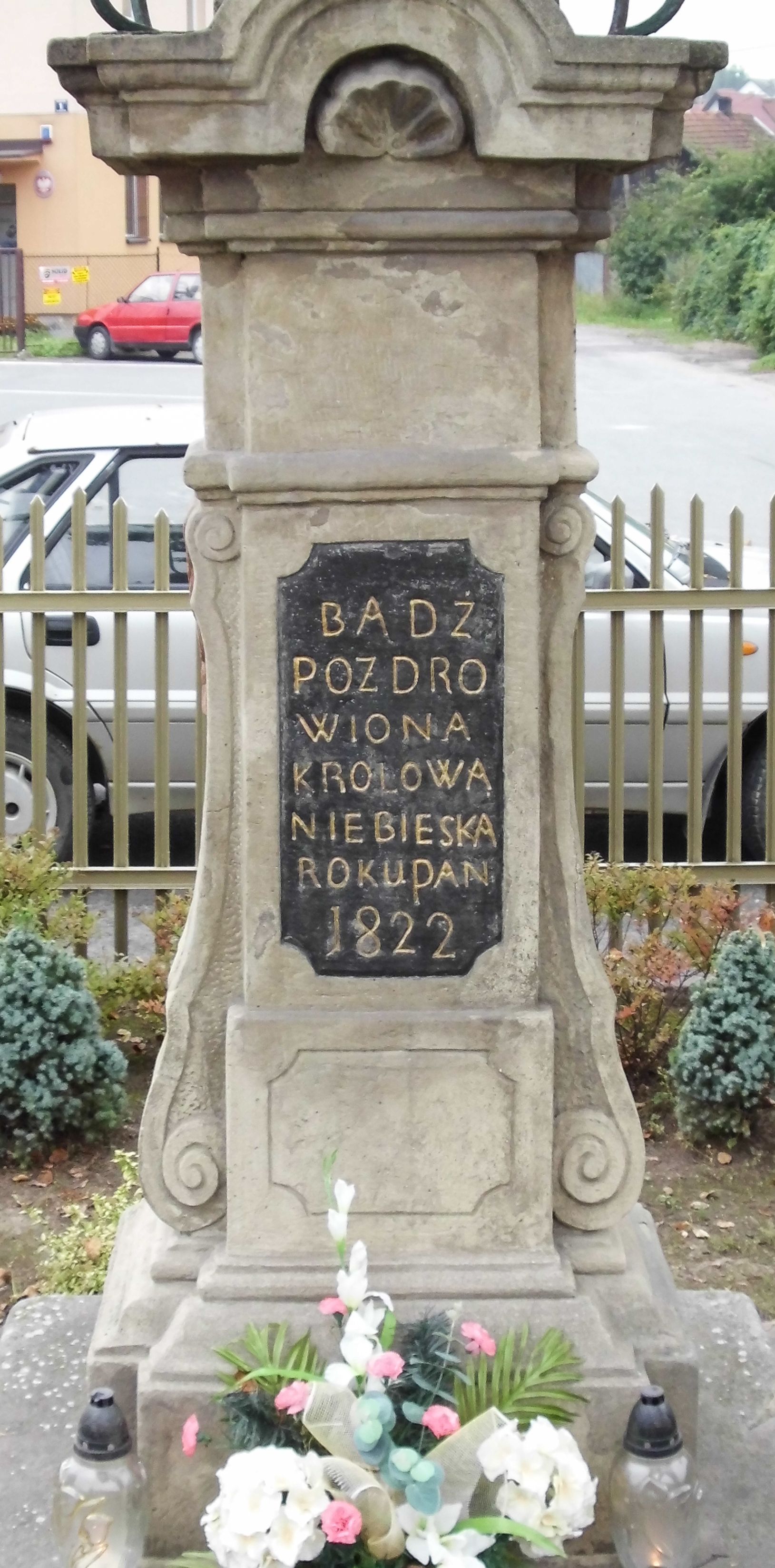 The shrine with a statue of Our Lady of the Rosary, set on a high decorative pedestal with the inscription "WE SALUTE YOU / QUEEN / OF HEAVEN / ANNO DOMINI / 1822", has been located within the area of the former site of the cemetery at the church in Radziszów.