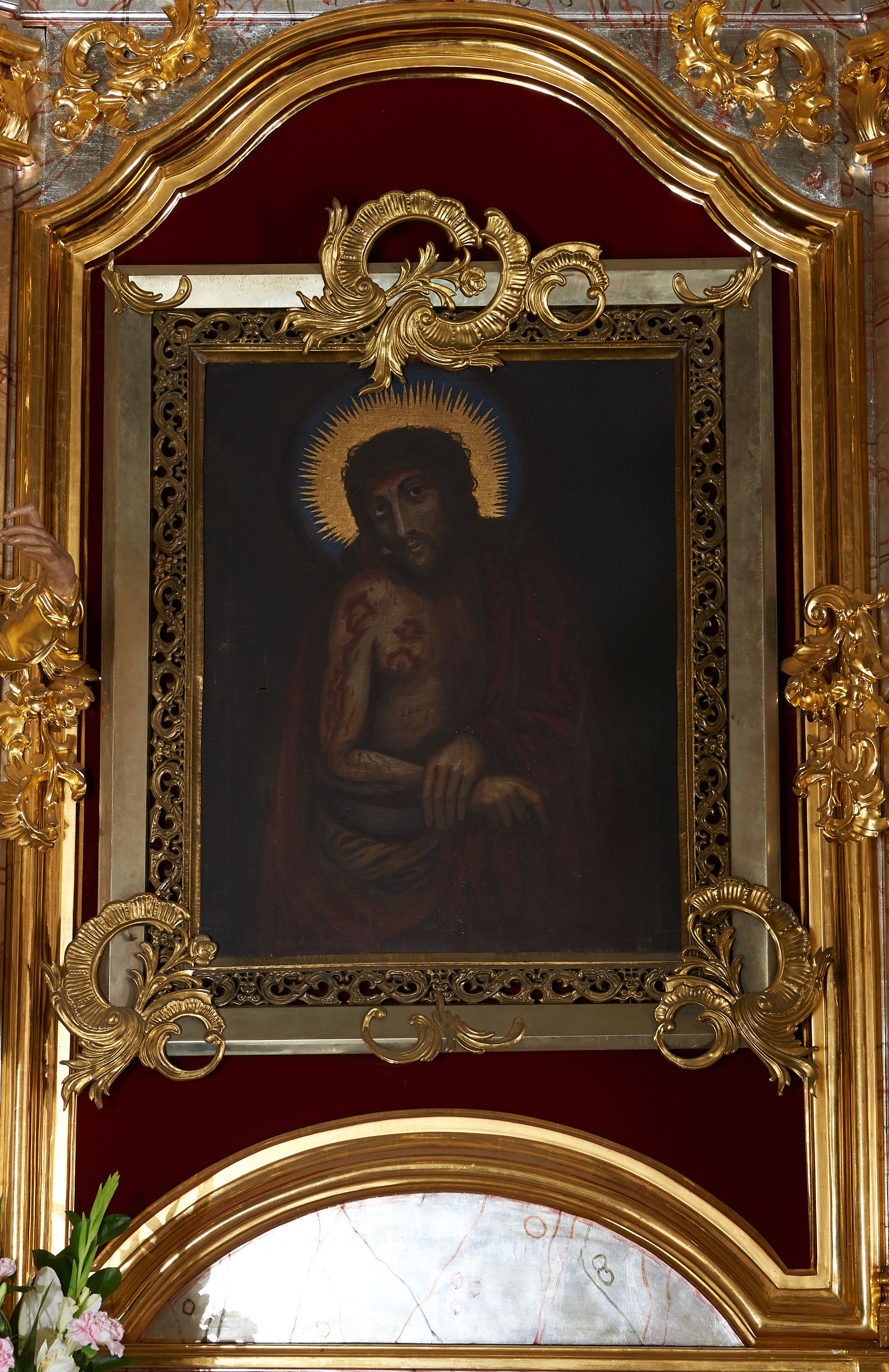The side altar was created in an unidentified sculpture workshop in the third quarter of the 18th century, in Rococo style. There is the image of Ecce Homo in its main area, the image of the Nativity of Mary in its finial, and two unidentified saints on both sides of the sculpture.