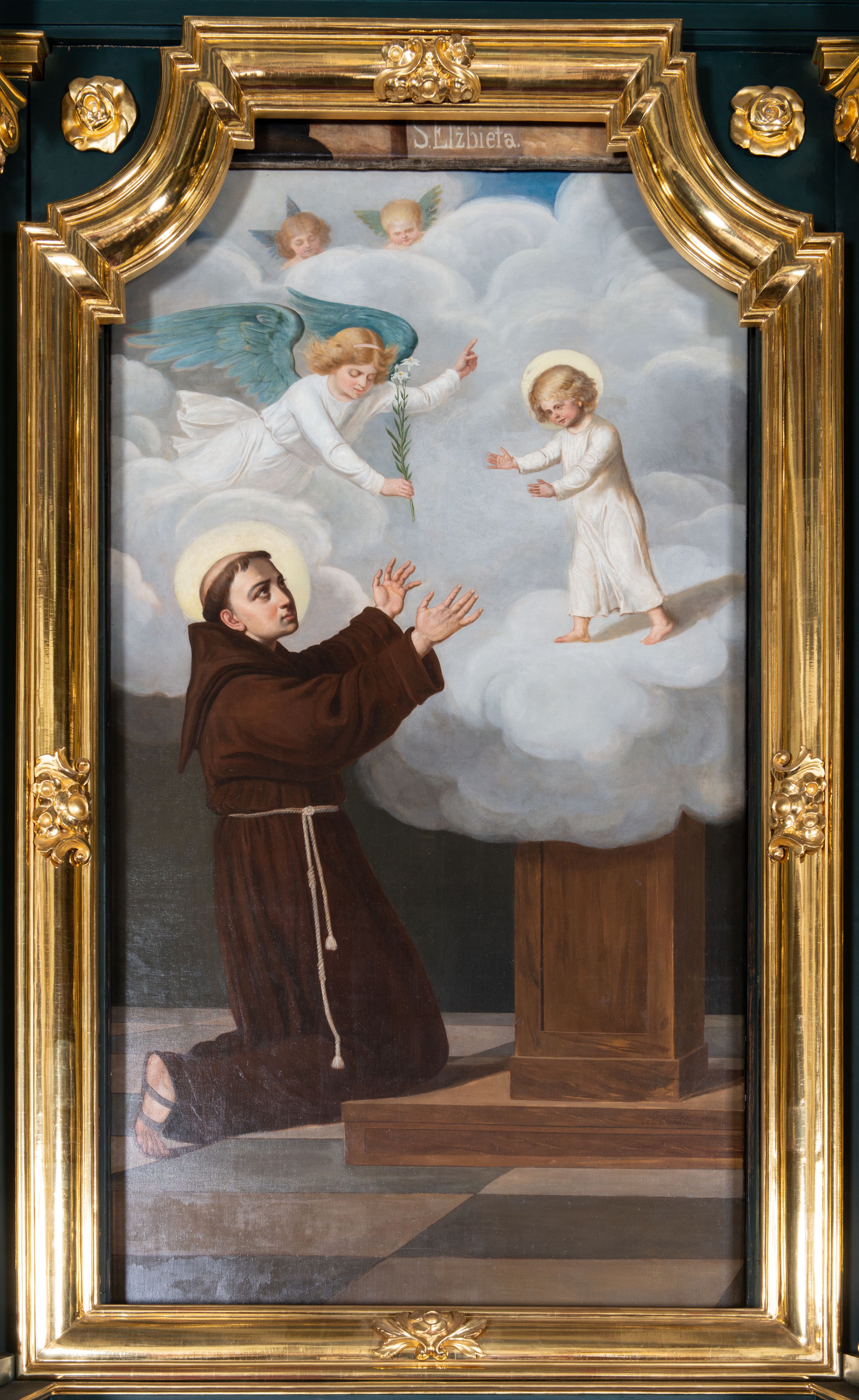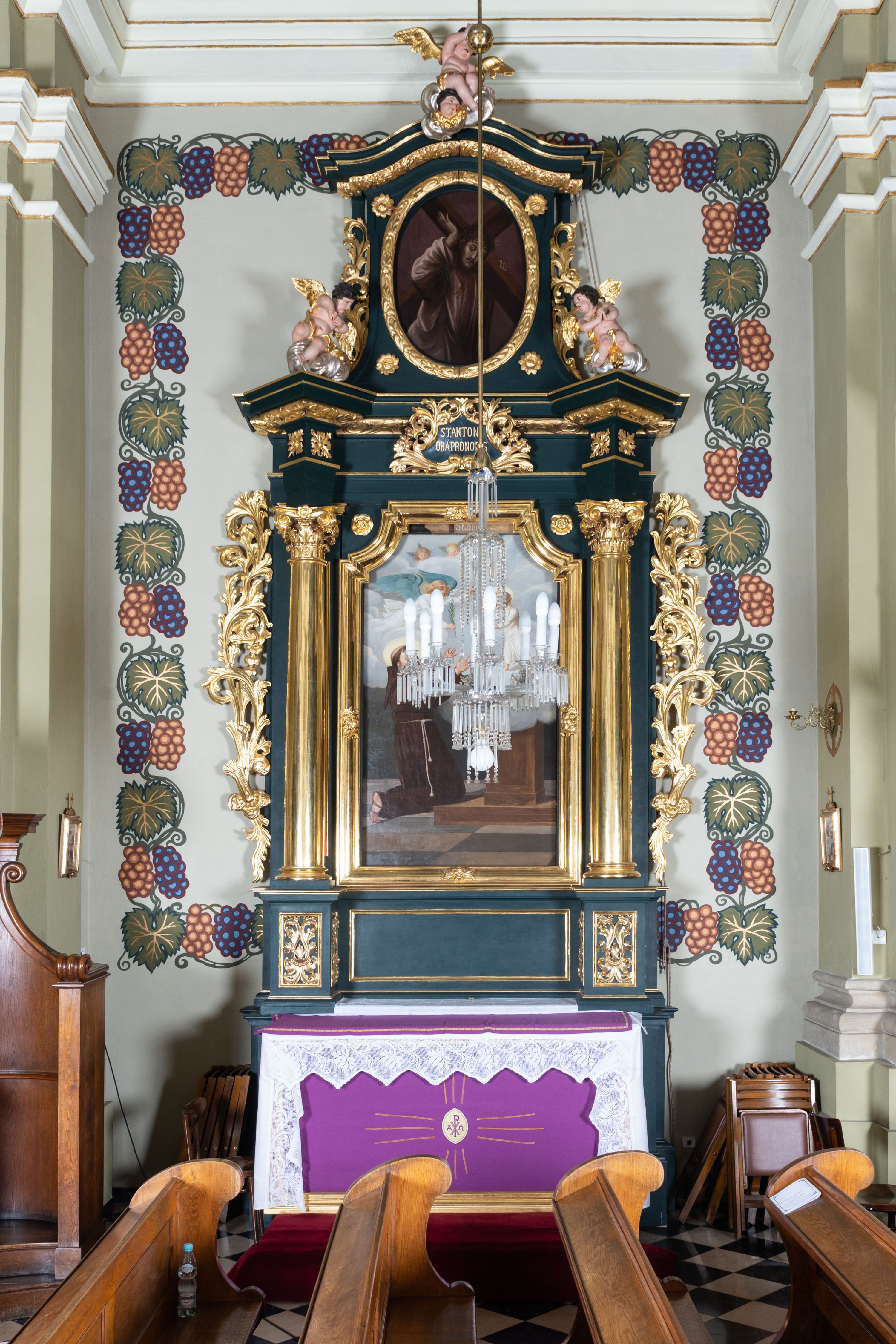 The St. Anthony's altar was made before 1702 at the Jerzy Hankis workshop, and was funded by the patrons of the monastery. It was consecrated by Kazimierz Łubieński in 1703. The reredos of St. Anthony represents the aedicula type. It is similar to other side altars created at the workshop of Hankis, such as the reredoses at the Dominican church in Tarnobrzeg, the parish church in Książ Mały or the Bernardine church in Kalwaria Zebrzydowska, attributed to Hankis.