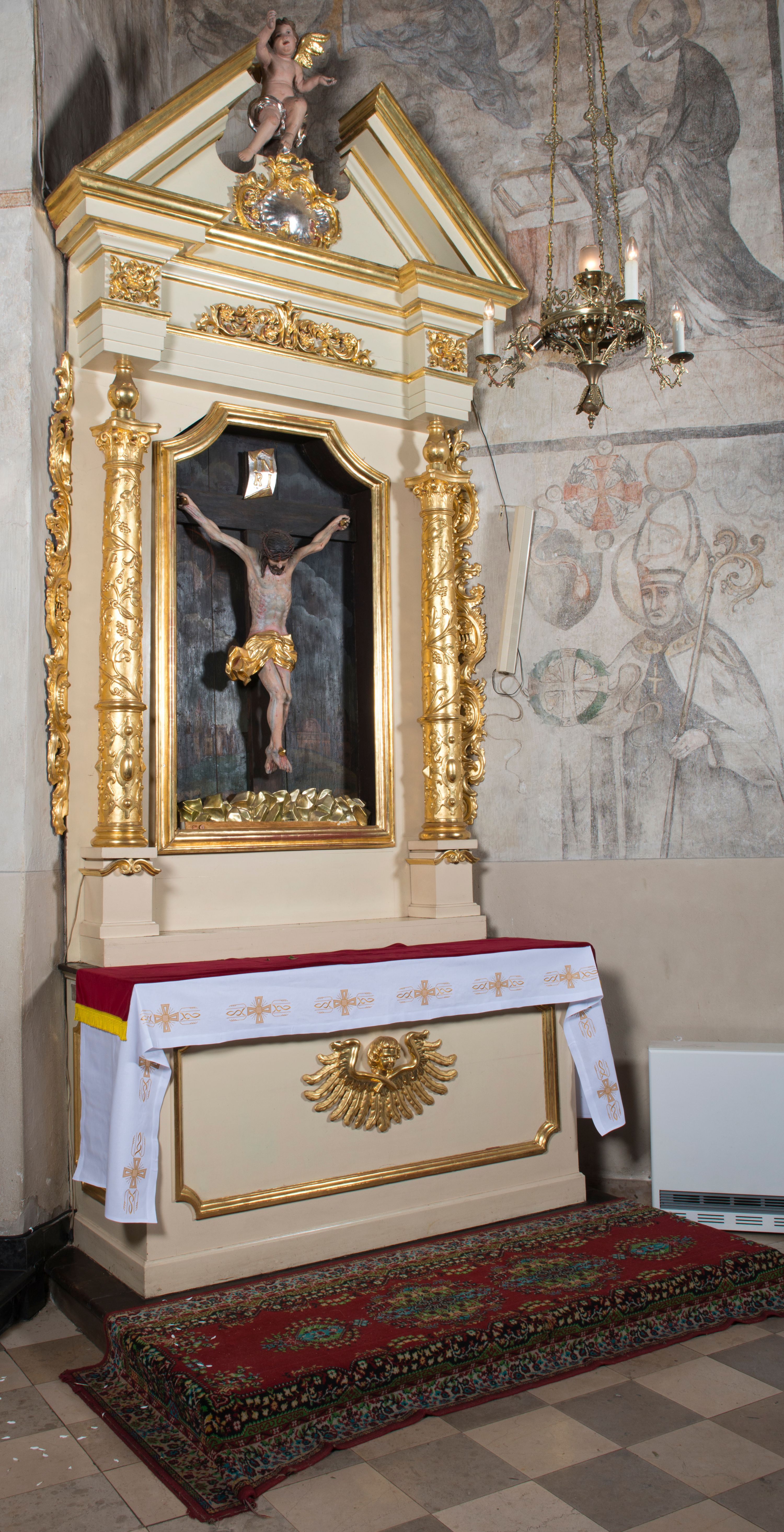 In 1954, the altar was created with two 18th-century structures and fragments of one 17th-century structure (renaissance columns). It is an example of an eclectic reredos, characterised by a simple, one-storey, uniaxial form with Rococo handles on the sides. Nowadays, in the main area of the altar there is a statue of the crucified Christ. The authors of the concept of re-composing the reredos were: art historian, Piotr Krakowski and architect, Julian Klimek.