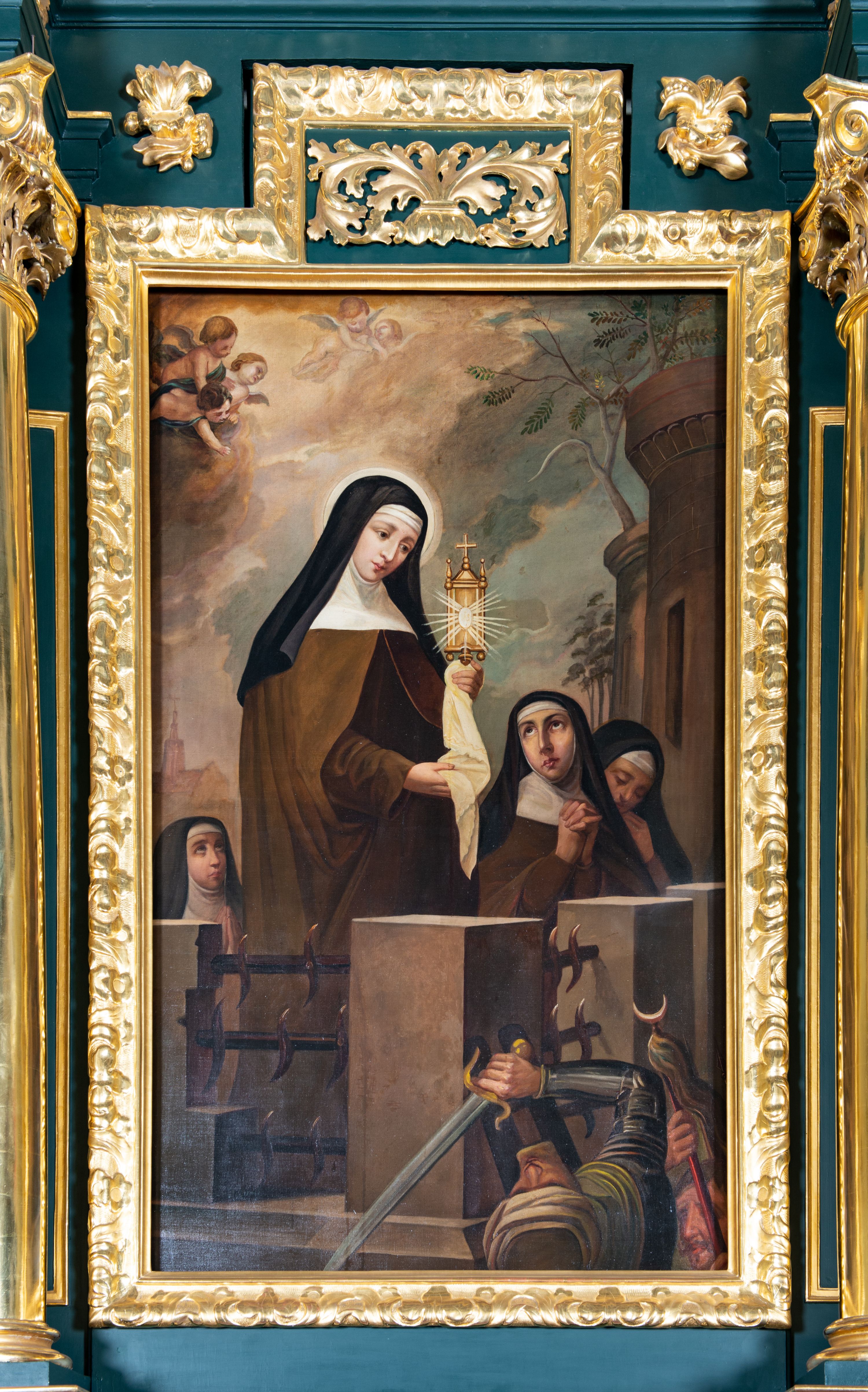 The altar of St. Francis was funded by Franciszek Leśniowicz, an official of the Pilecki region. It was created before the year 1702, at the workshop of Jerzy Hankis. It was consecrated by Kazimierz Łubieński in 1703. The St. Francis reredos represents the aedicula type. It is similar to other side altars created at Hankis' workshop, such as the reredoses at the Dominican church in Tarnobrzeg or the parish church in Skaryszew attributed to him.