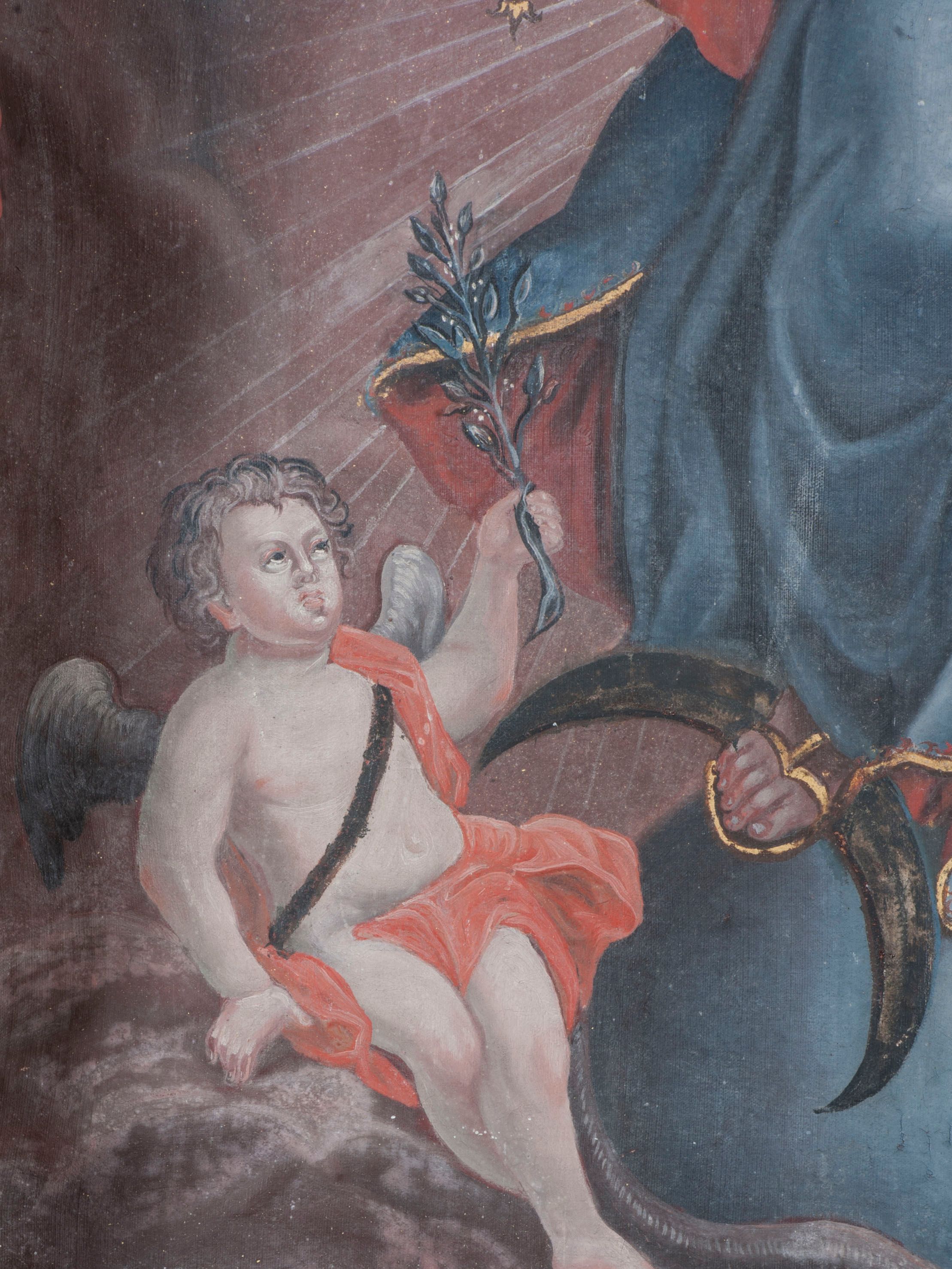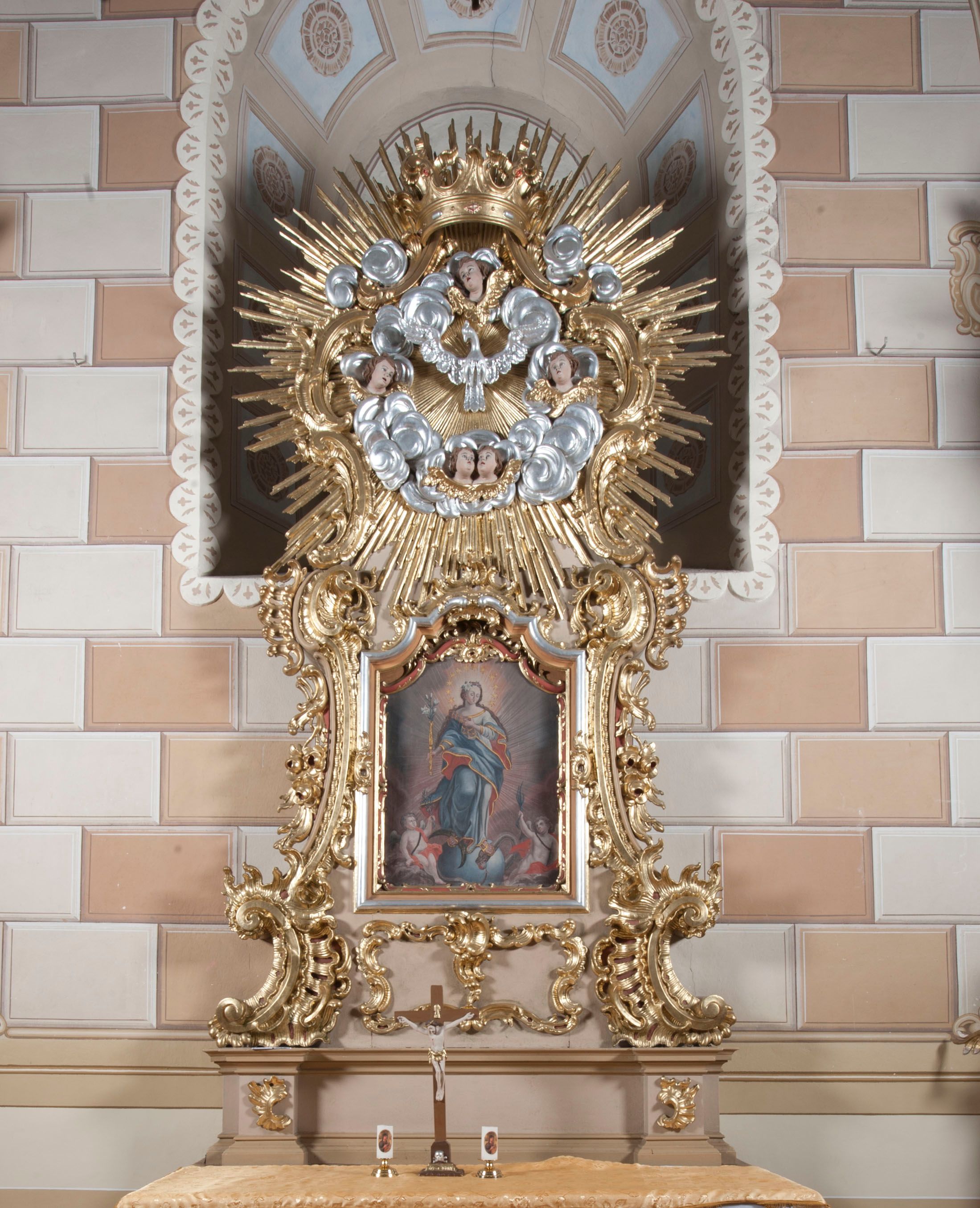The altar was built in 1772 for the newly erected St. Valentine's church (1761) in Krempachy. In the main area of the altar, there is a painting of Our Lady of the Immaculate Conception from the second half of the 18th century. According to the pre-war inventory and "The Catalogue of the Monuments of Art in Poland" from 1953, a painting of Bl. Kinga from 1772 could also be found in the altar. However, in the 70s of the 20th century the painting went missing in unexplained circumstances. According to one of the researchers, it was moved to the parish church of St. Martin in Krempachy. Research on furnishings of the St. Valentine's church in Krempany carried out so far, due to lack of archival records on the constructors, does not even try to determine a circle of potential authors of the reredoses. The altar is adorned with a rocaille ornament, characteristic of the art of the third quarter of the 19th century. It shows the richness of forms of the Rococo style manifested in the splendour of ornament and gilded texture. This splendour is characteristic of the Spiš art, in which the sculptural and ornamental decoration dominates over the painting decoration.