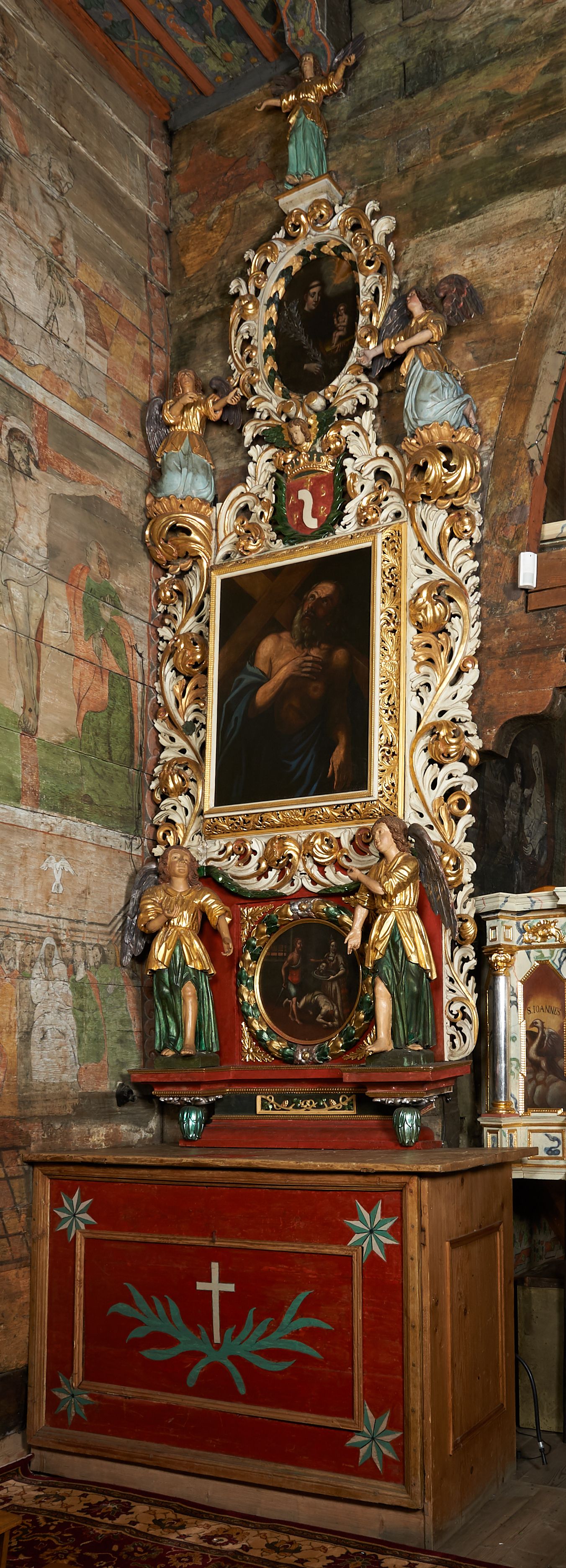 The side altar of St. Peter in the church in Racławice constitutes a unique example of reredoses from the beginning of the 18th century with acanthus ornamentation - characteristic at that time. The following paintings are located in the altar: "Beheading of St. John the Baptist", "St. Andre" and "St. Anthony of Padua" in the altar finial. The funder of the altar, as well as two other side altars in the church, is father Andrzej Strzałkowski whose epitaph and portrait is located on the western wall of the church, under the music choir.