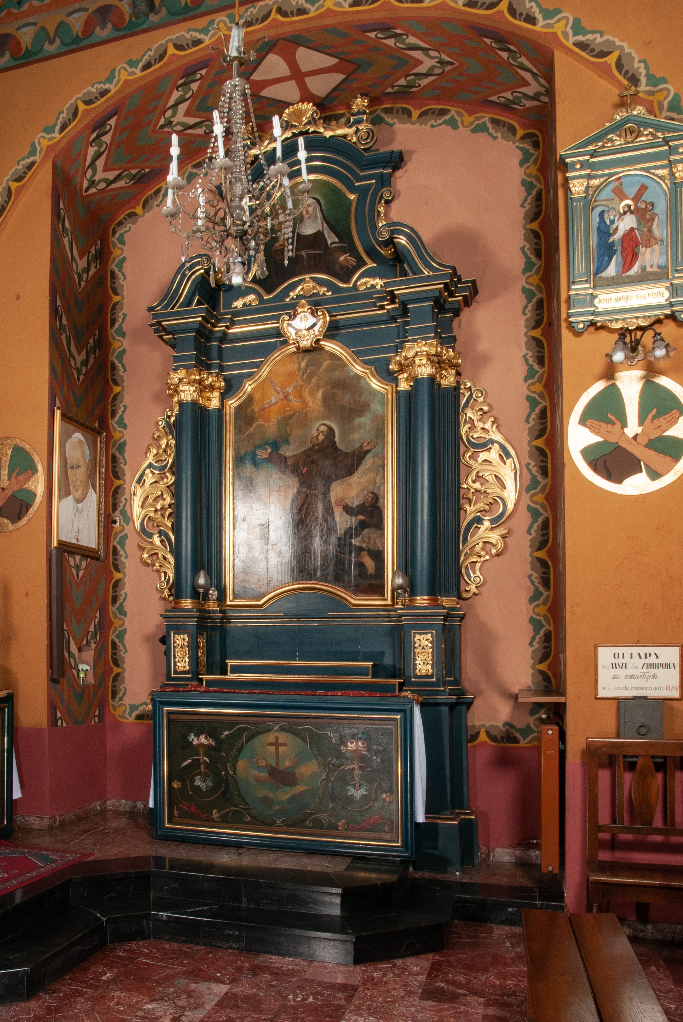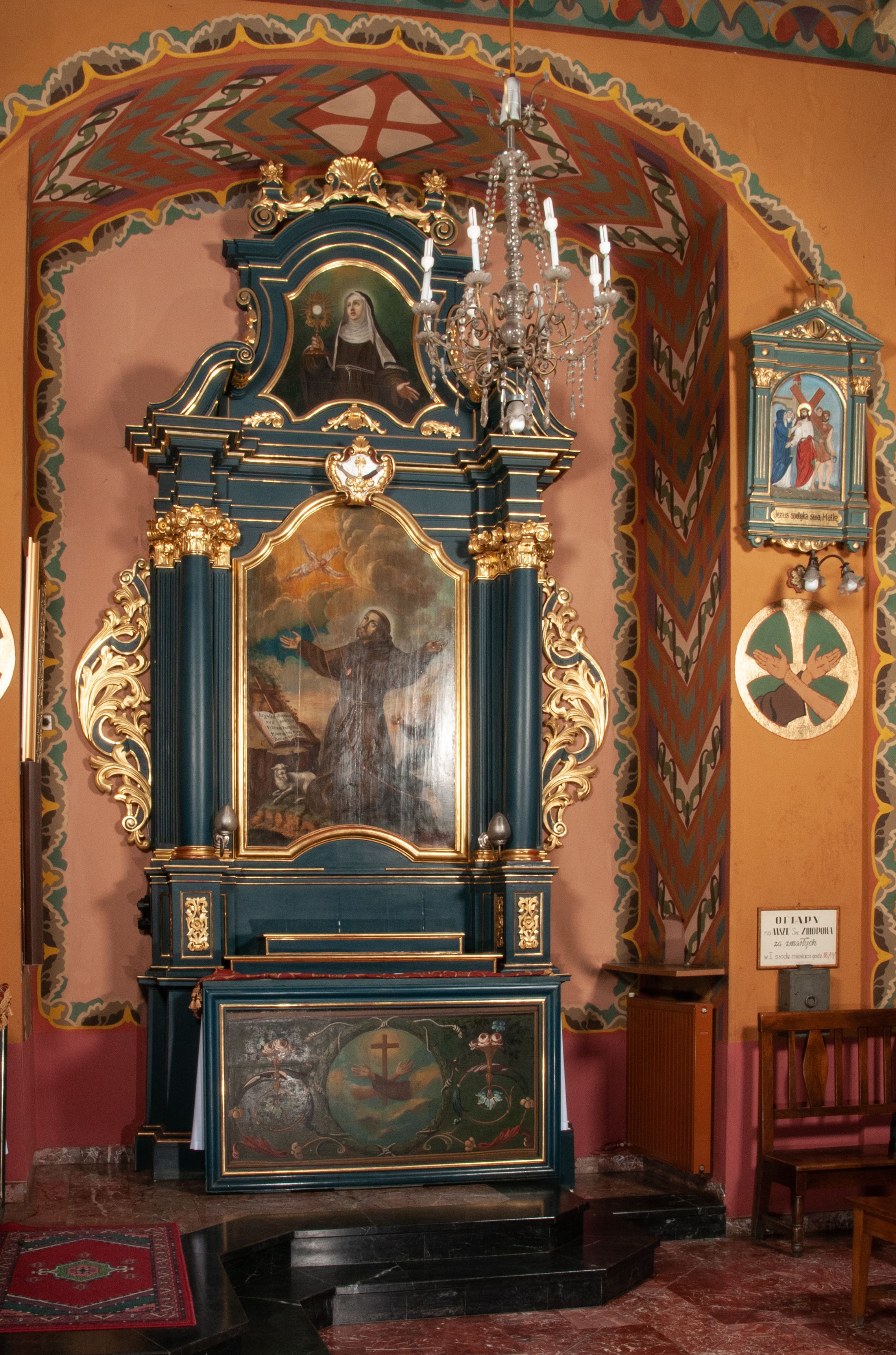 The side altar of St. Francis of Assisi in the Monastery of Reformed Fathers in Wieliczka was created after the church fire in 1718. Before the date of its consecration (1721), it was created along with the other altars located in the temple. It represents the aedicula type – i.e. a single-story, uniaxial structure placed on a pair of supports supporting broken entablature, along with an altar finial – typical of the 18th century. The work in question was built from the foundation of the Cholew family from Wieliczka. In the main area of the altar there is a painting "Stigmatization of St. Francis" from 1730. Particularly noteworthy are: a painted antependium and a painting of St. Clara made in 1809 by Michał Stachowicz, a Polish painter and graphic artist of the Romantic era. The altar was built by artisans: Modest Gronalewicz, Beniamin Groński, Faustyn Gawlikowski and Maksym Ptaszkowski- employed at the construction of the burnt temple.