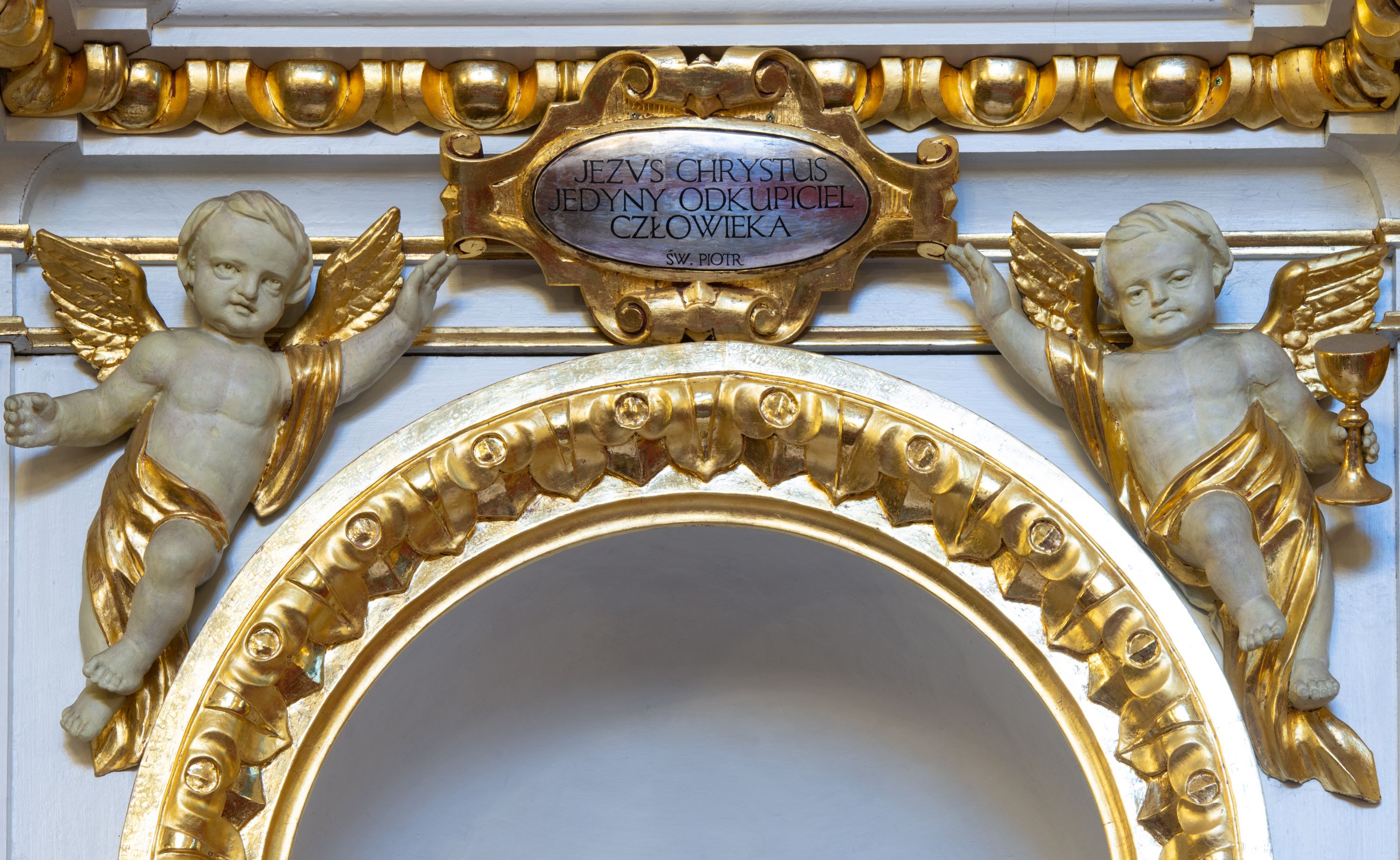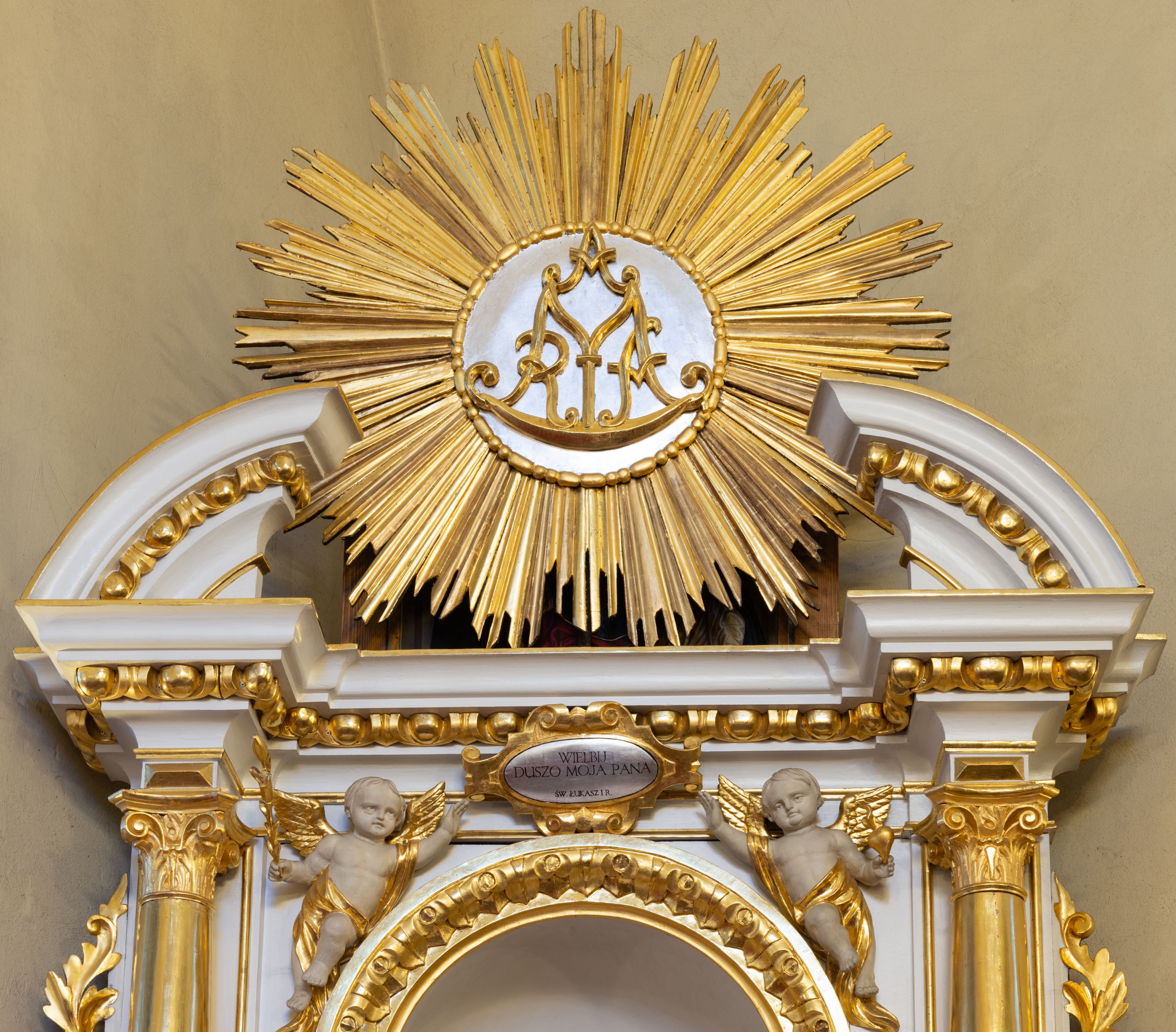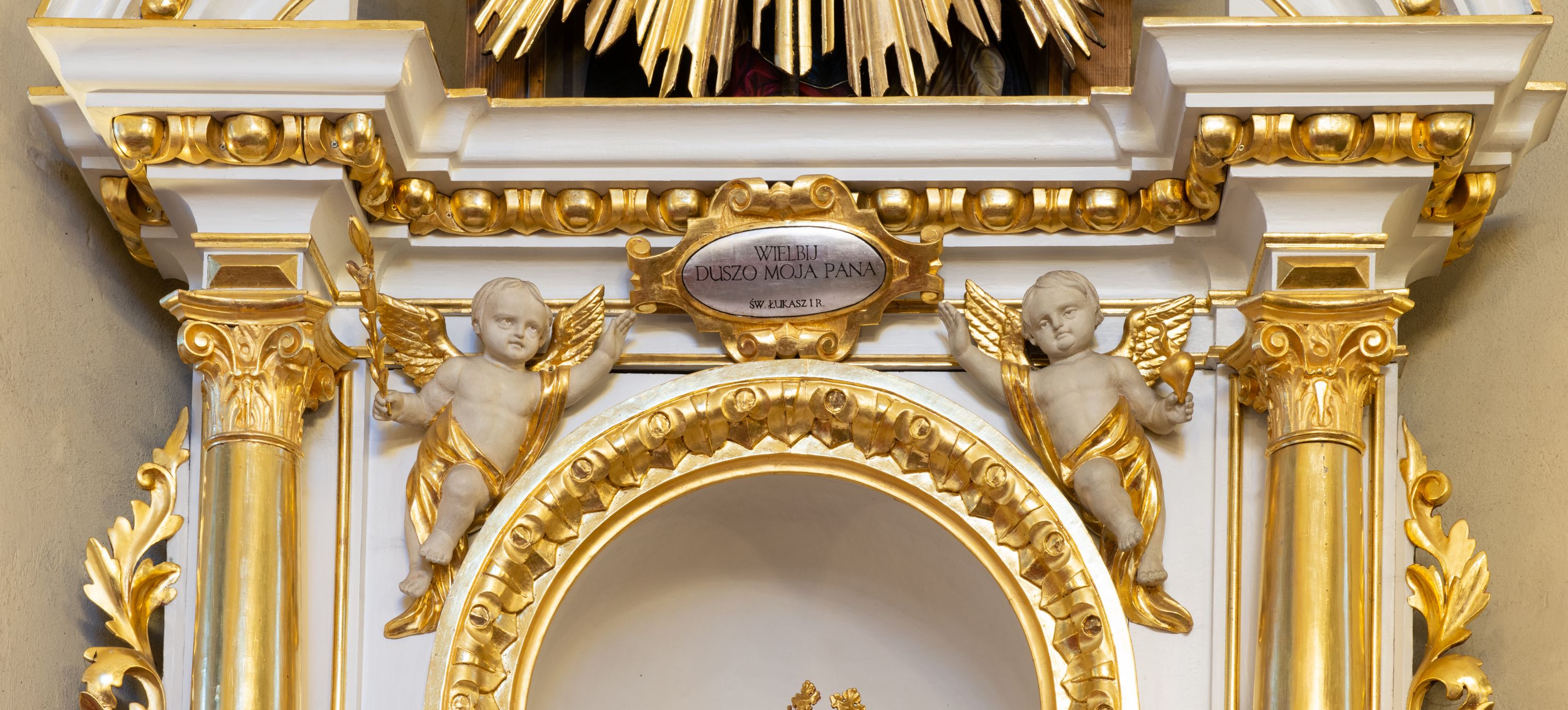 The 19th century altar is composed of two eighteenth-century structures. Despite its subsequent refurbishment, the altar is an example of characteristic baroque altar reredoses featuring a simple, one-story, single-axial form contained by lateral, acanthus ears. It is certain that the cherubs supporting the cartouche were created in the 19th century, presumably when the reredoses was constructed. Unfortunately, the author or the original provenance of the altar remain unknown.