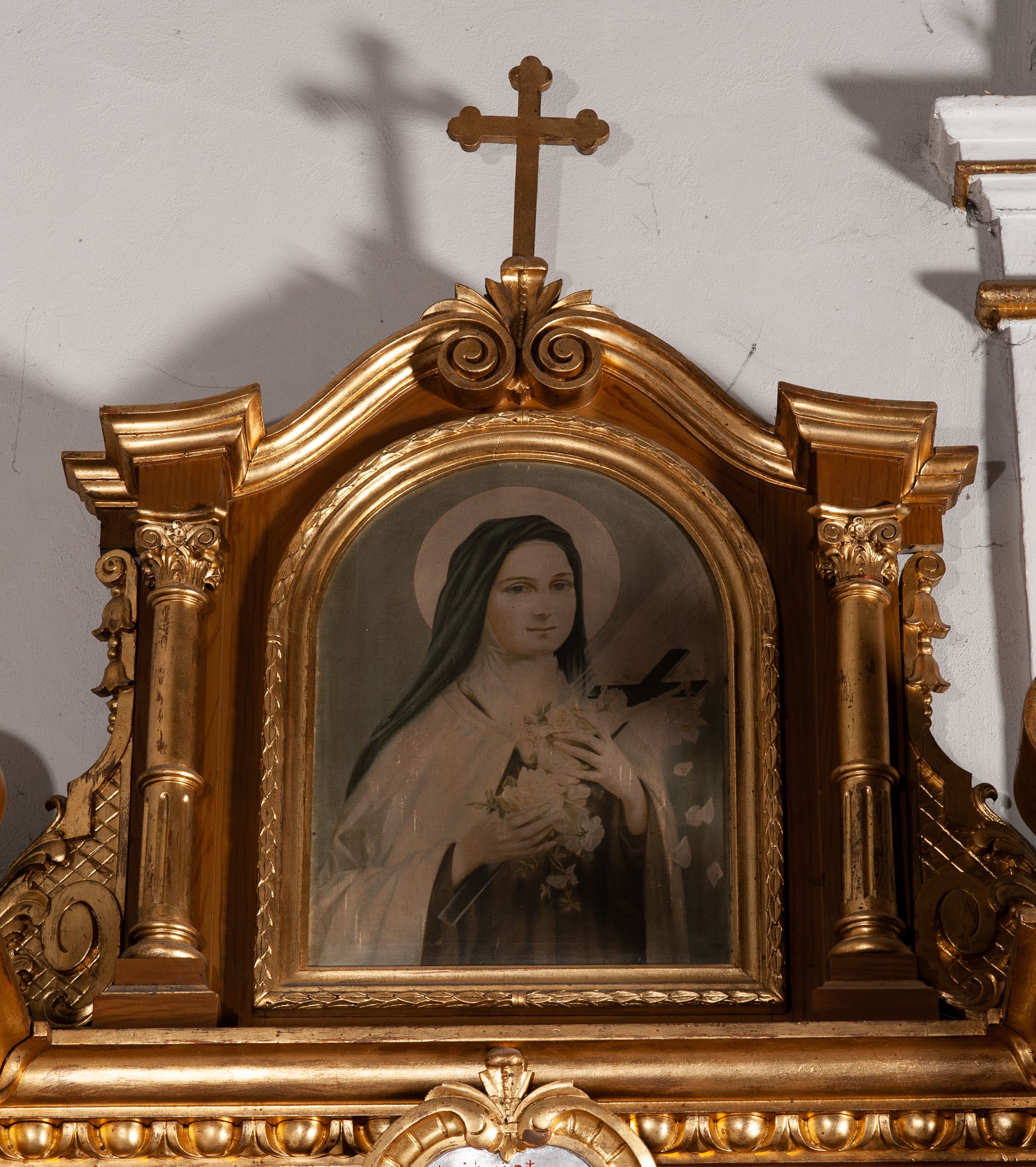 The altar in question and the second altar, located on the opposite side of the chancel arcade, were created in 1949 to resemble the neo-baroque high altar. The sculptures for these altars were created by local sculptors from Koźmice Wielkie: Władysław Janowski and Franciszek Hajduk. It took place at a time when the parish priest was Stanisław Możejko. In the main area, there is a figure of the Most Sacred Heart of Jesus and in the altar finial, there is a chromolithographic print with a representation of St. Teresa of Lisieux.