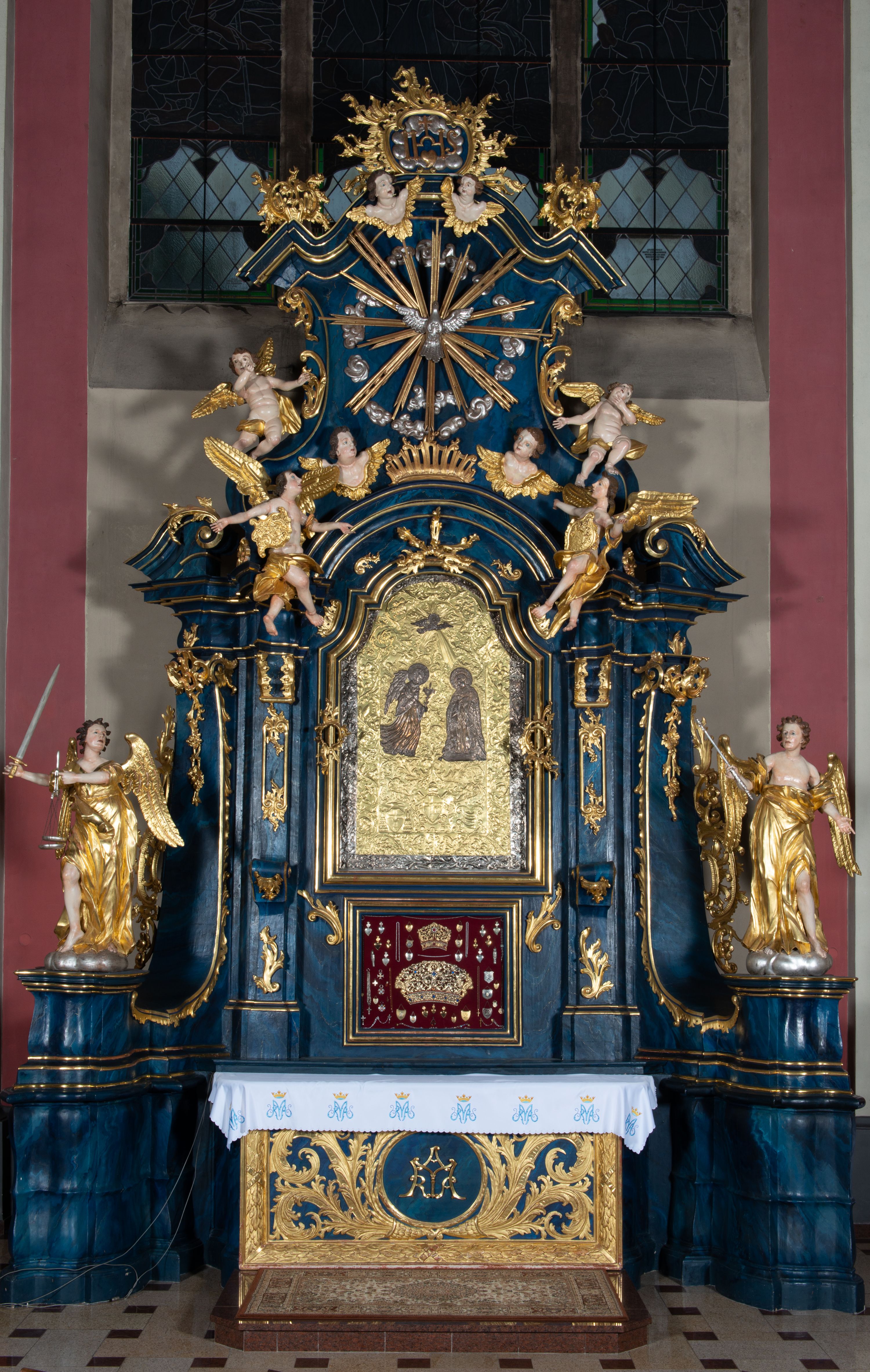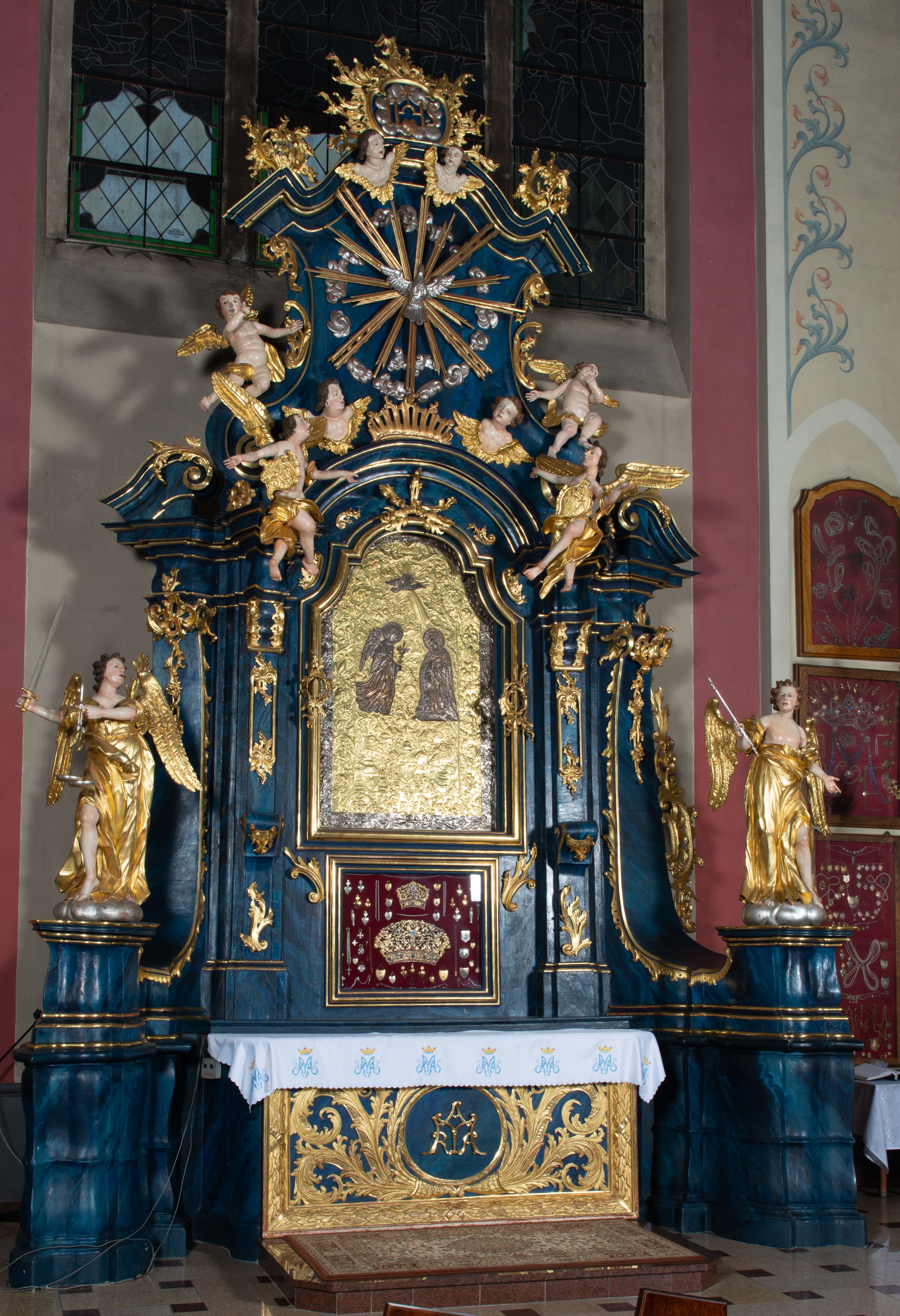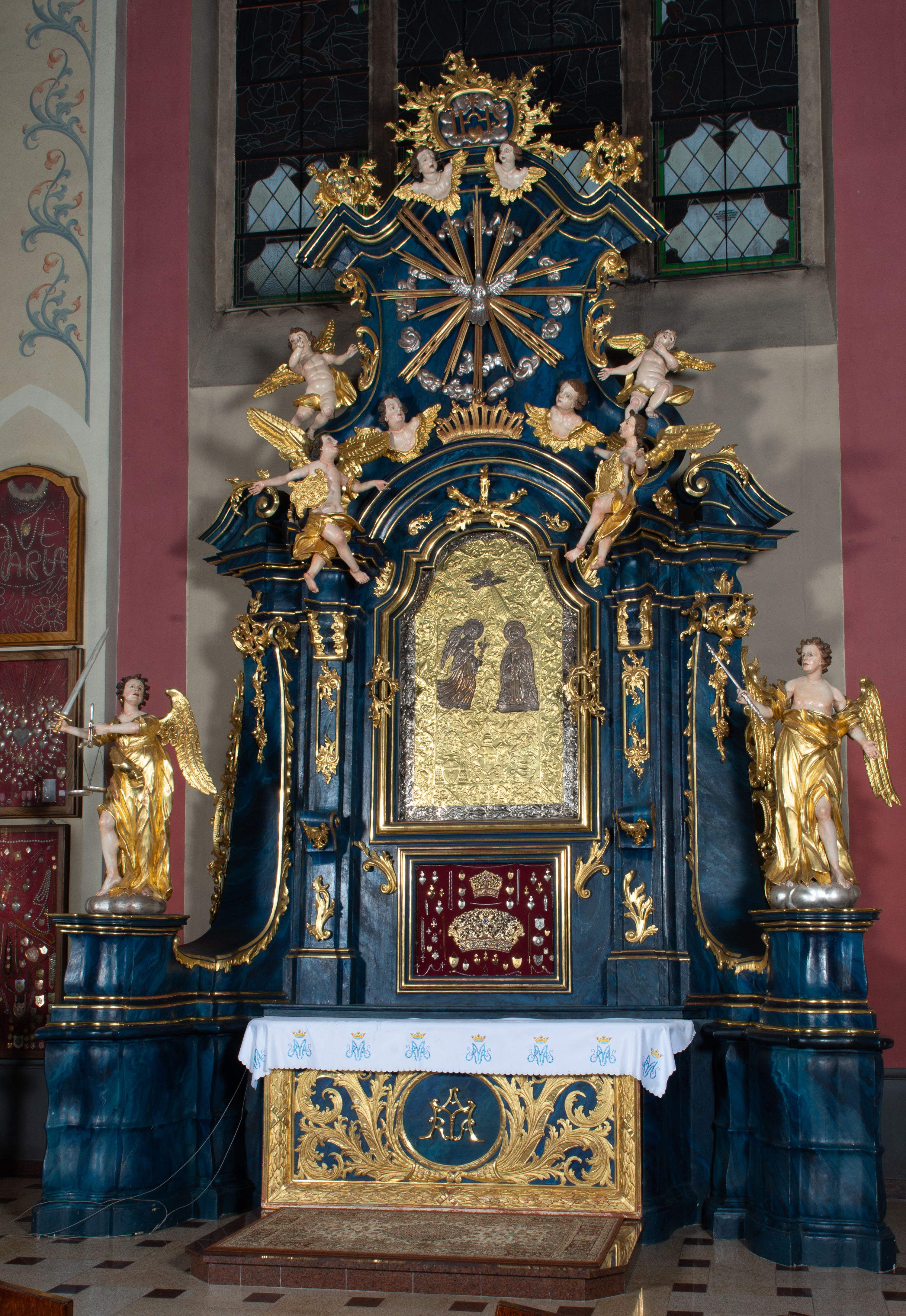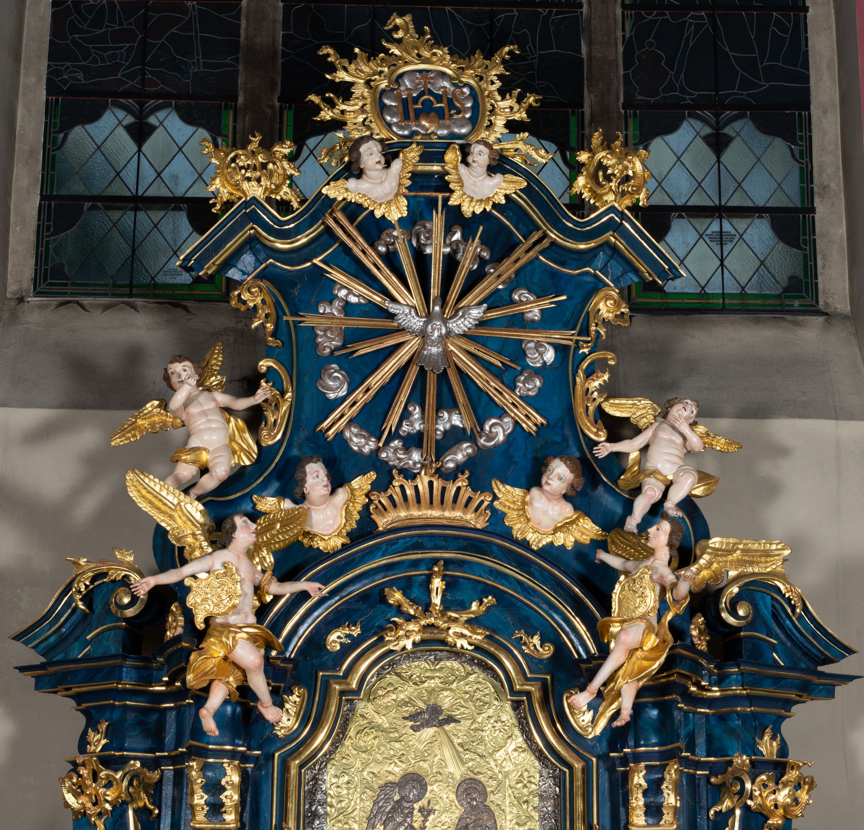 The reredos originally served as the high altar in the former wooden church of the Holy Trinity in Jordanów. It was made before 1765. In 1914 the altar was moved to a new brick church. The architecture of the reredos is entirely unique due to the unusual use of external pilasters flowing down to the strongly forward-facing and separated pedestals. Such a solution is close to the architecture of Jacek Łopacki's tombstone from the Church of the Blessed Virgin Mary in Cracow, attributed to Francesco Placidi (1763).