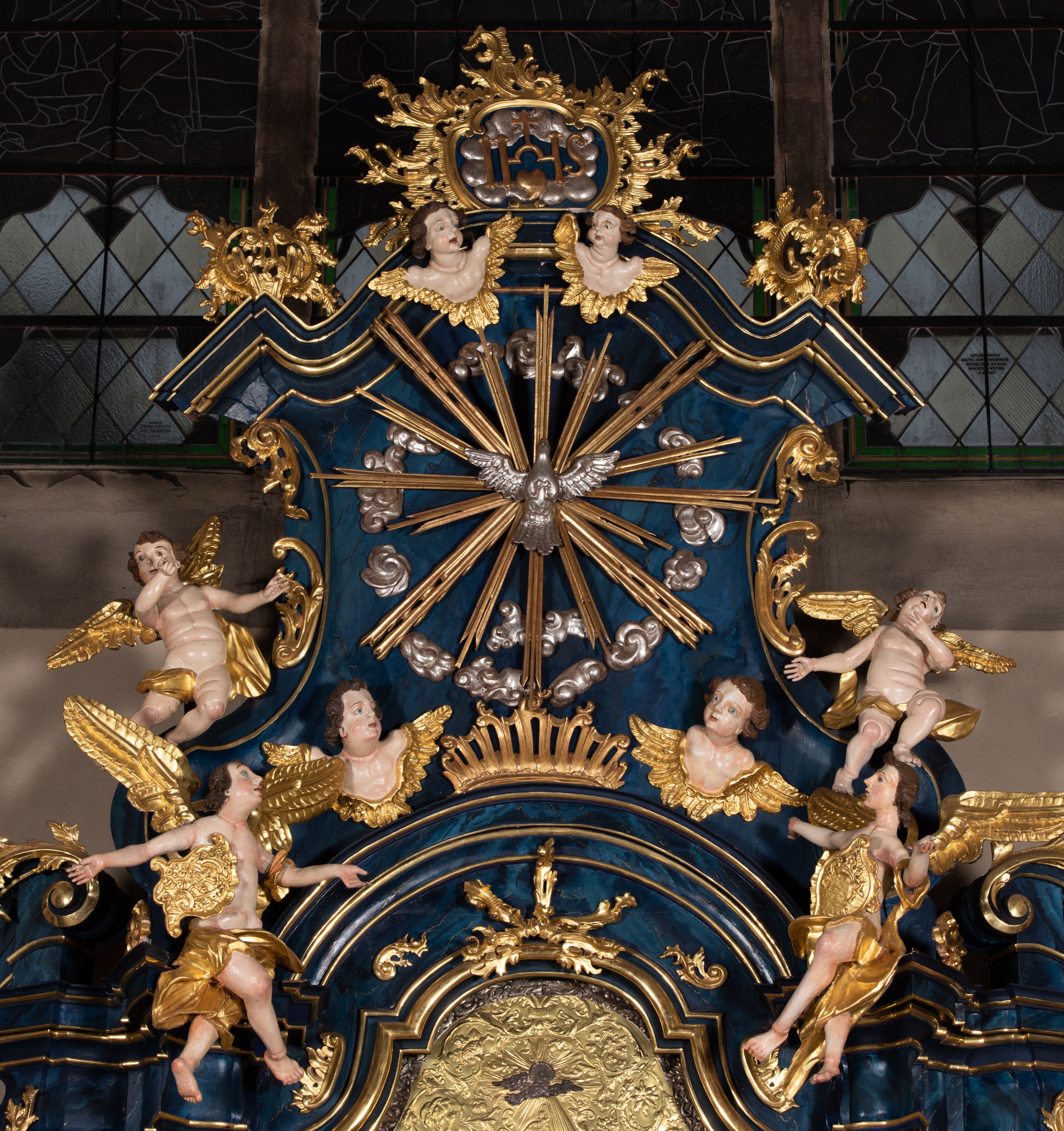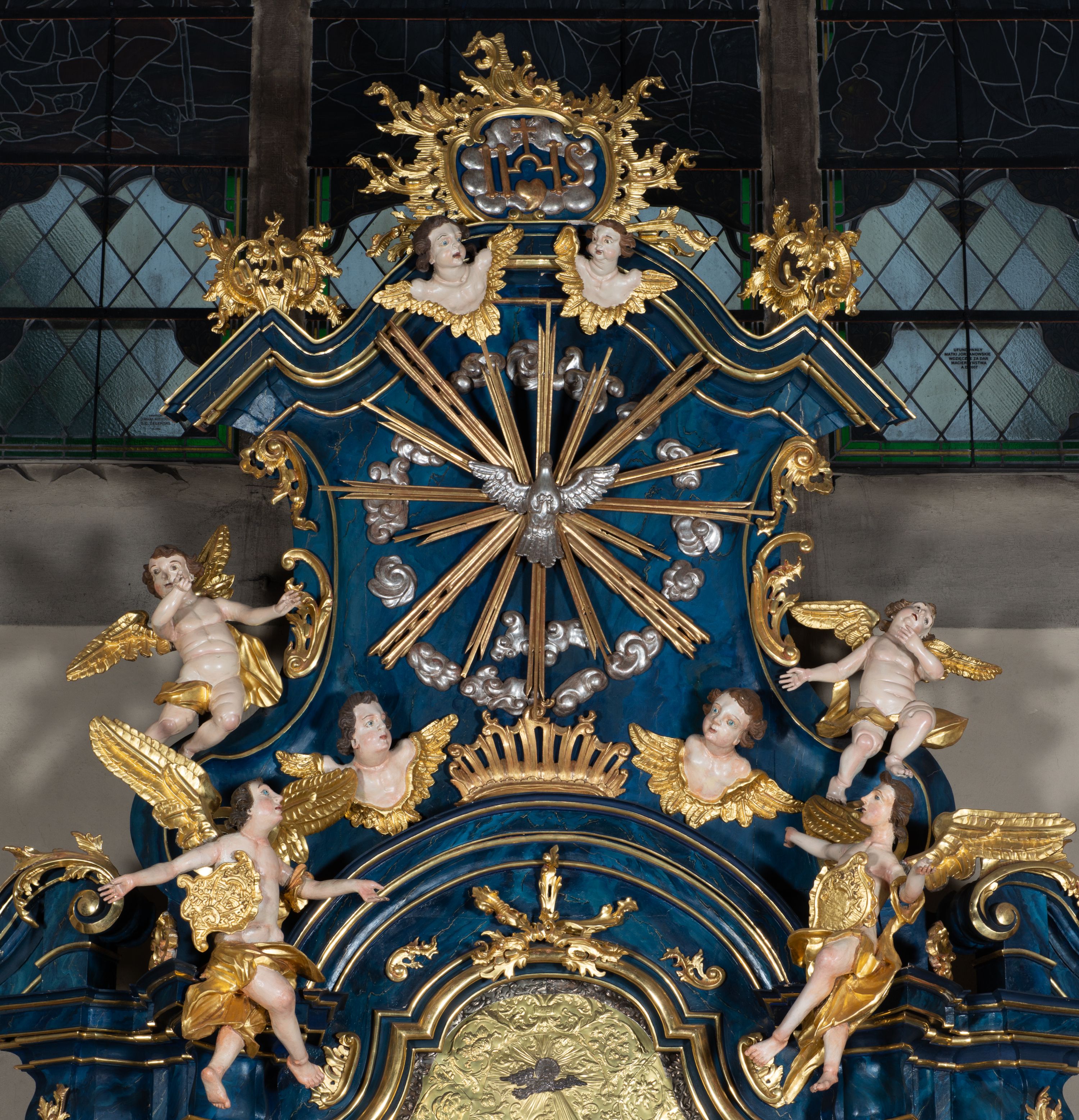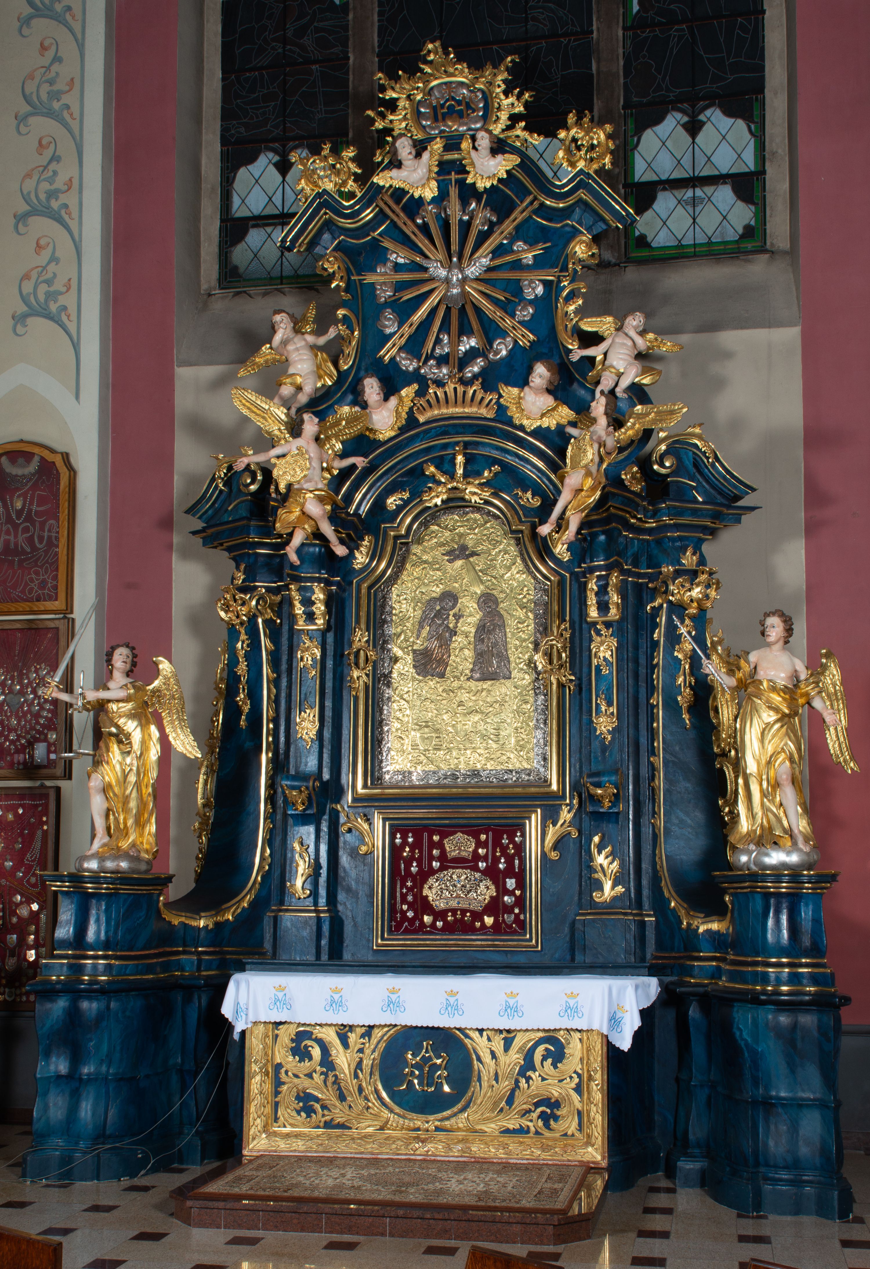 The reredos originally served as the high altar in the former wooden church of the Holy Trinity in Jordanów. It was made before 1765. In 1914 the altar was moved to a new brick church. The architecture of the reredos is entirely unique due to the unusual use of external pilasters flowing down to the strongly forward-facing and separated pedestals. Such a solution is close to the architecture of Jacek Łopacki's tombstone from the Church of the Blessed Virgin Mary in Cracow, attributed to Francesco Placidi (1763).