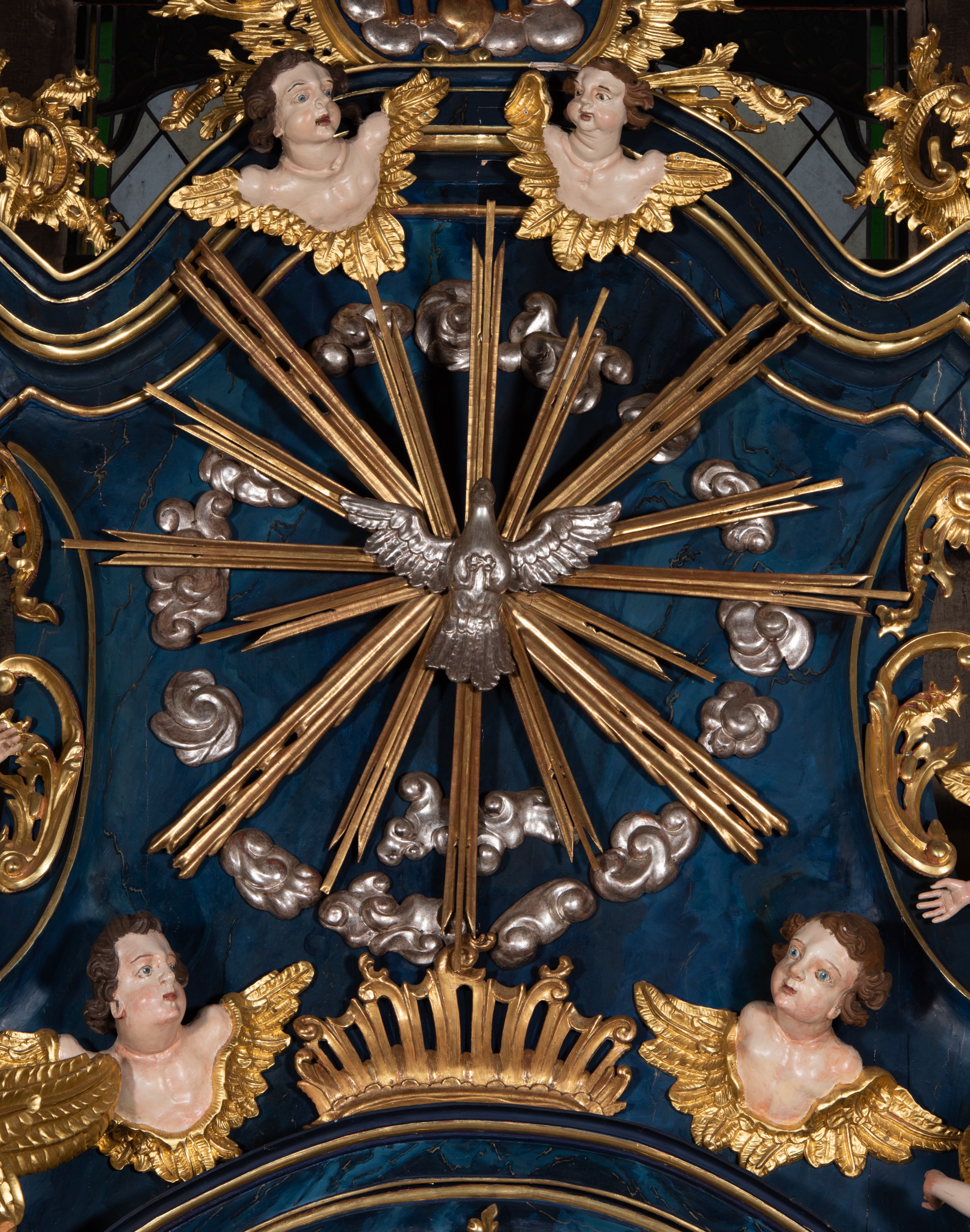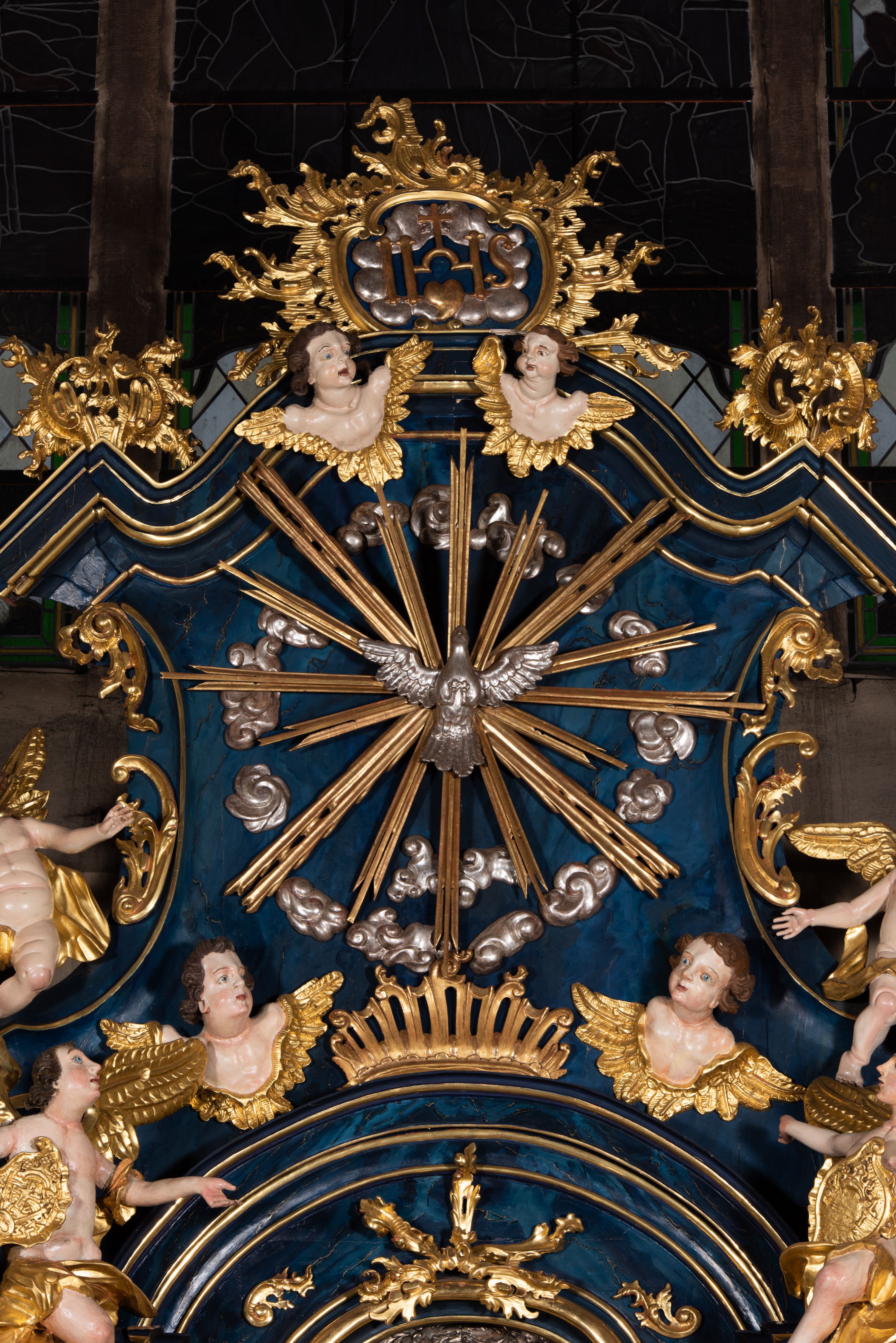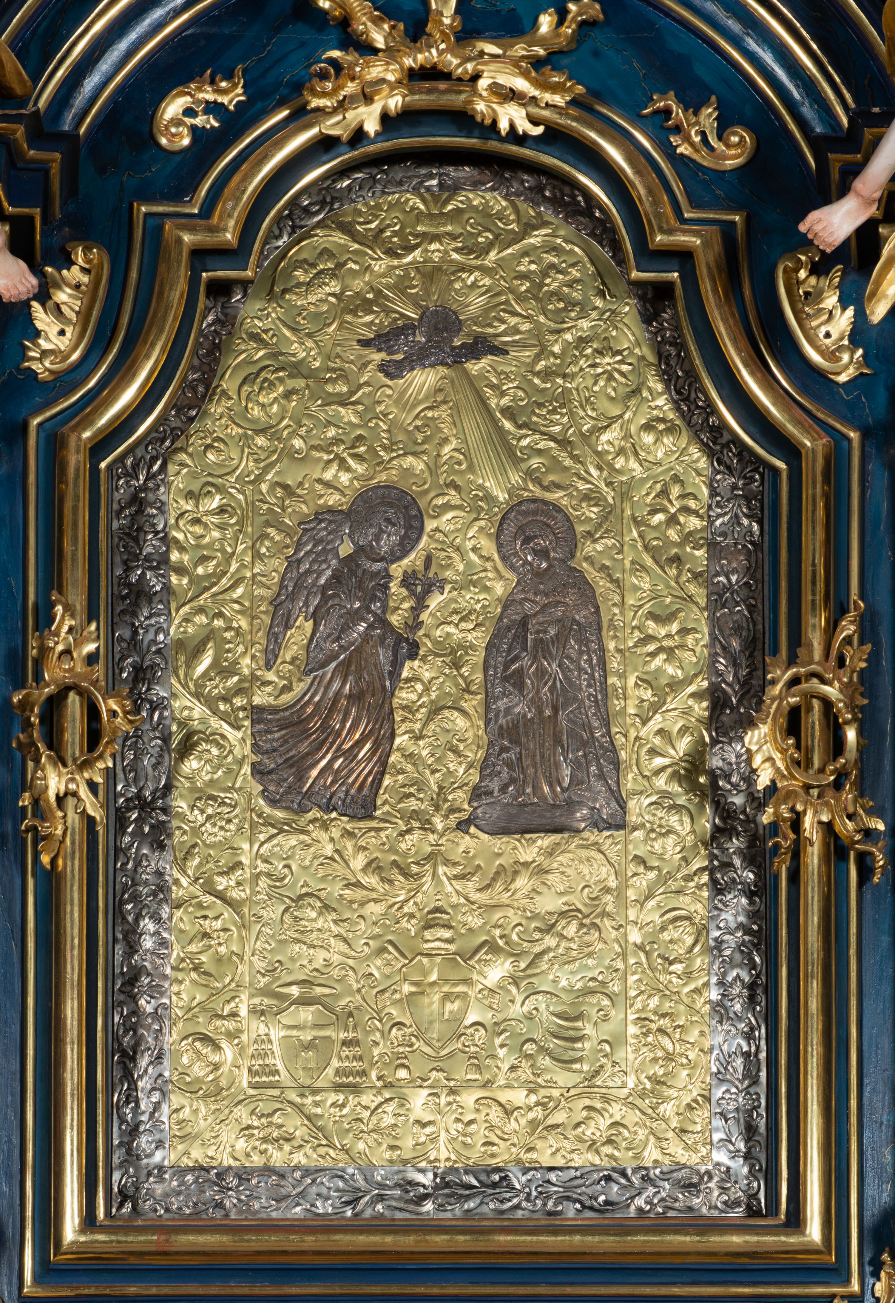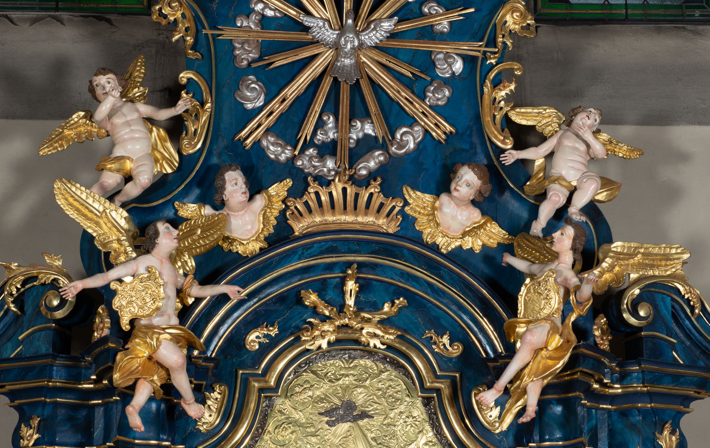 The reredos originally served as the high altar in the former wooden church of the Holy Trinity in Jordanów. It was made before 1765. In 1914 the altar was moved to a new brick church. The architecture of the reredos is entirely unique due to the unusual use of external pilasters flowing down to the strongly forward-facing and separated pedestals. Such a solution is close to the architecture of Jacek Łopacki's tombstone from the Church of the Blessed Virgin Mary in Cracow, attributed to Francesco Placidi (1763).