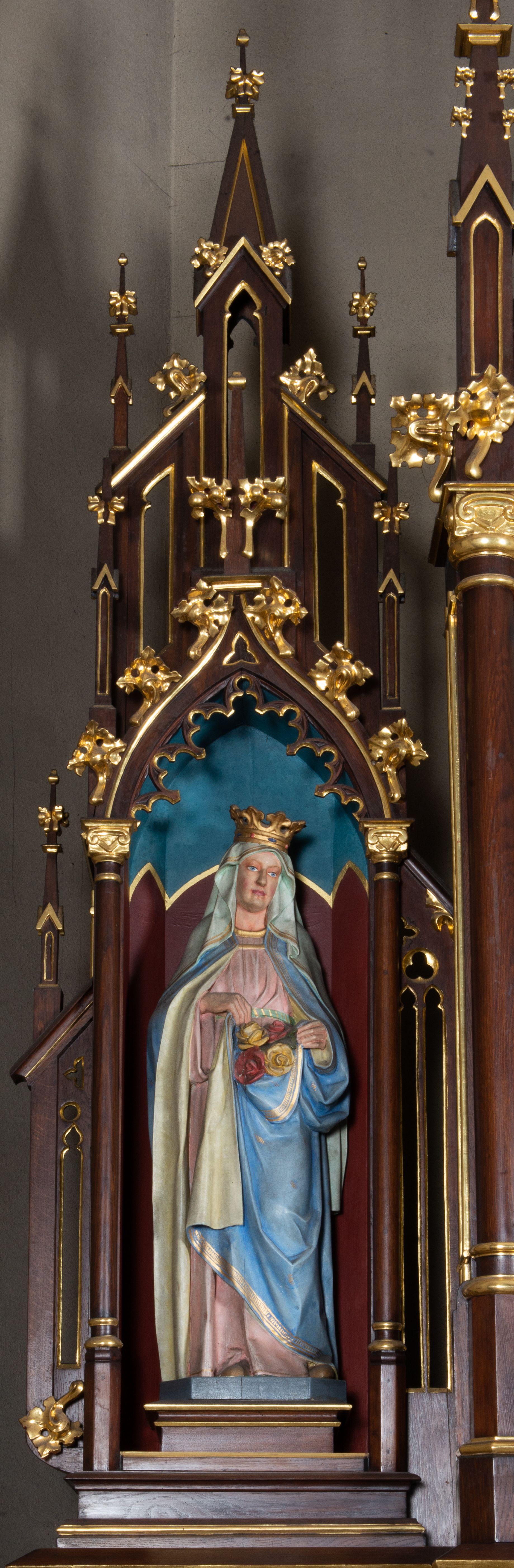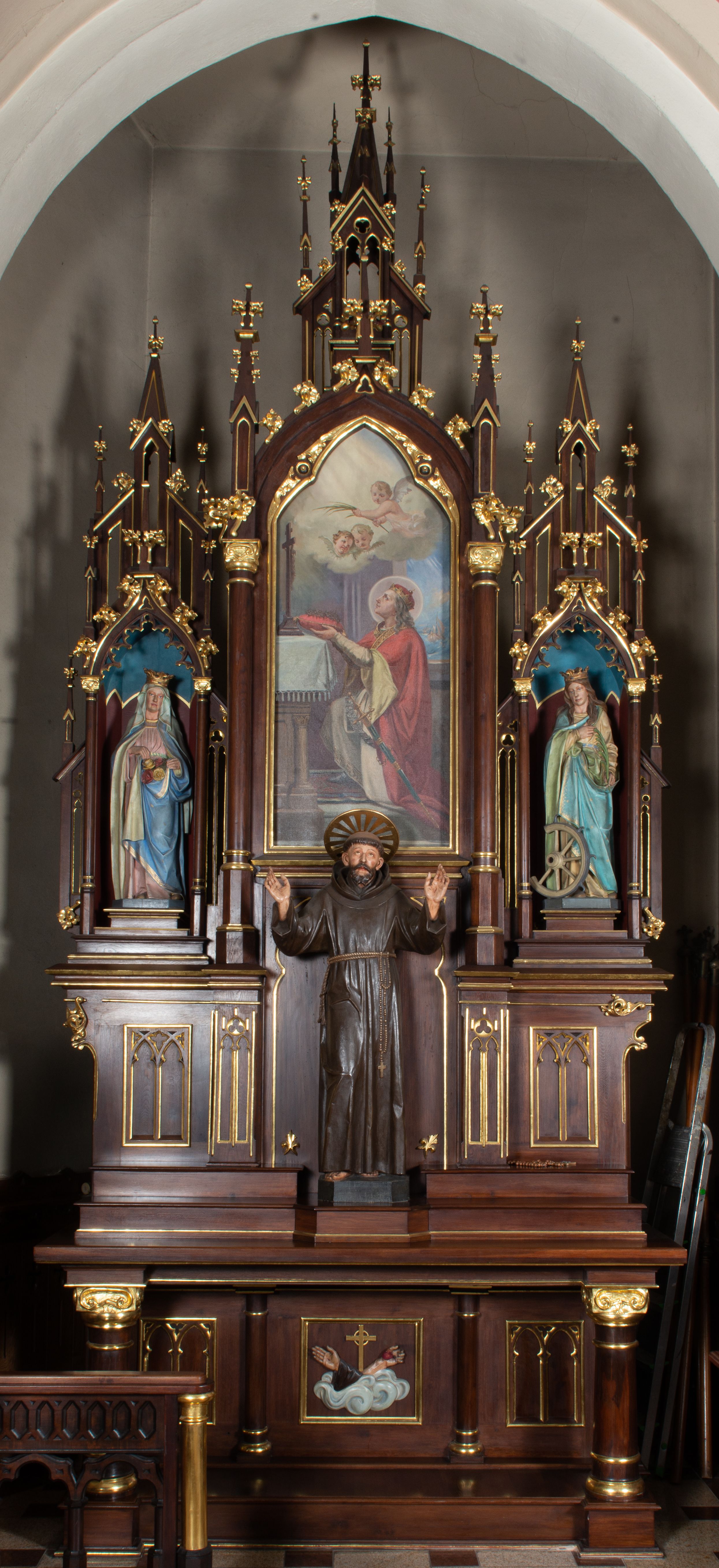 The altar of St. Francis Seraphicus was listed in the inventory of 1927, therefore, it must have been made before that year. The reredos in question was based on the compositional scheme of a triumphal arch with the highest central niche and lower side niches. The openwork structures of the gables use stylised elements of gothic decoration and construction, such as tracery, blind windows, pinnacles, crockets, buttresses.